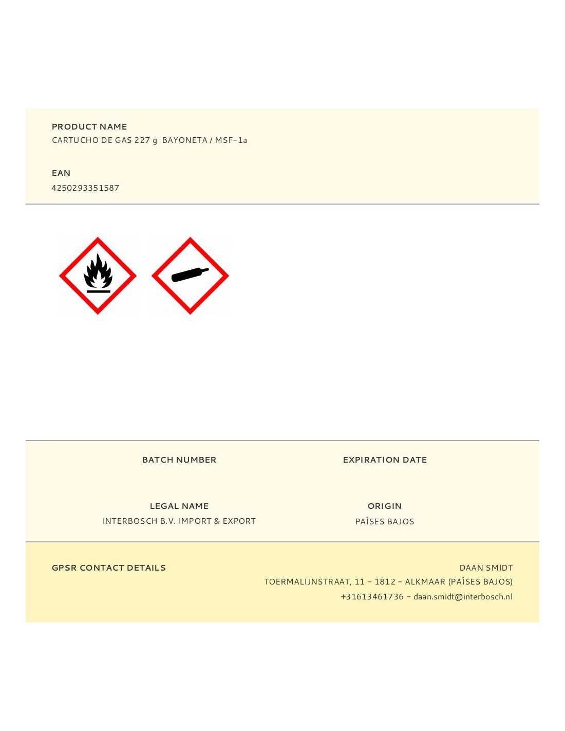Cartucho gas 227 g combustible bajo presión proteger de la luz directa del sol no exponer a temperaturas superiores a 50°c mantener en un area bien ventilada, fuera del alcance de los niños. cumple con la norma en417