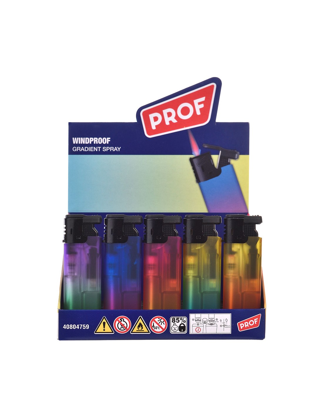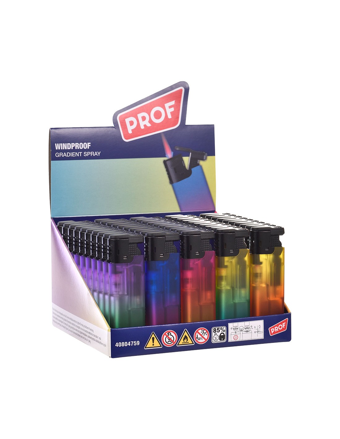 Encendedor electrónico gradient spray, colores surtidos. presentado en expositor de 50 uds