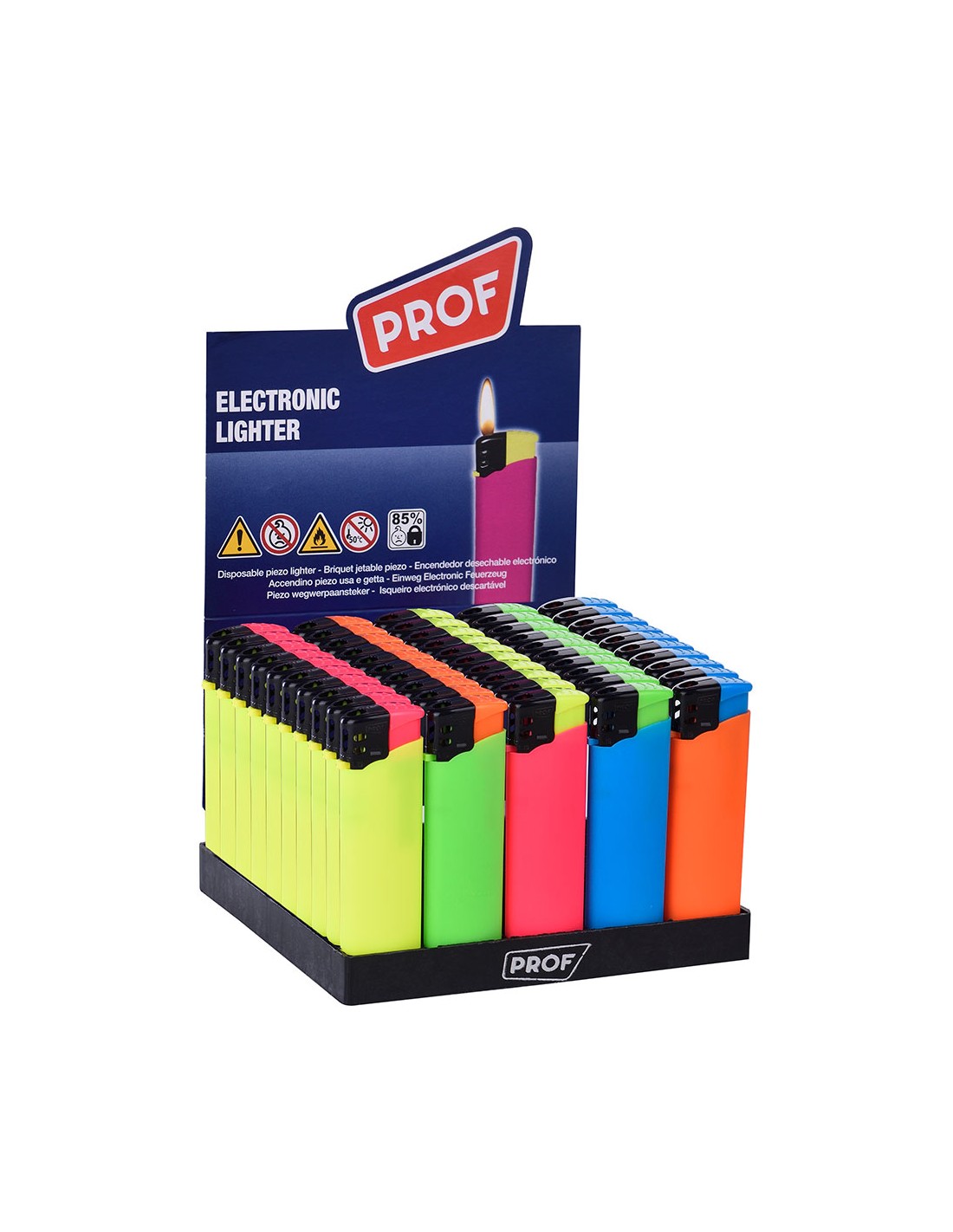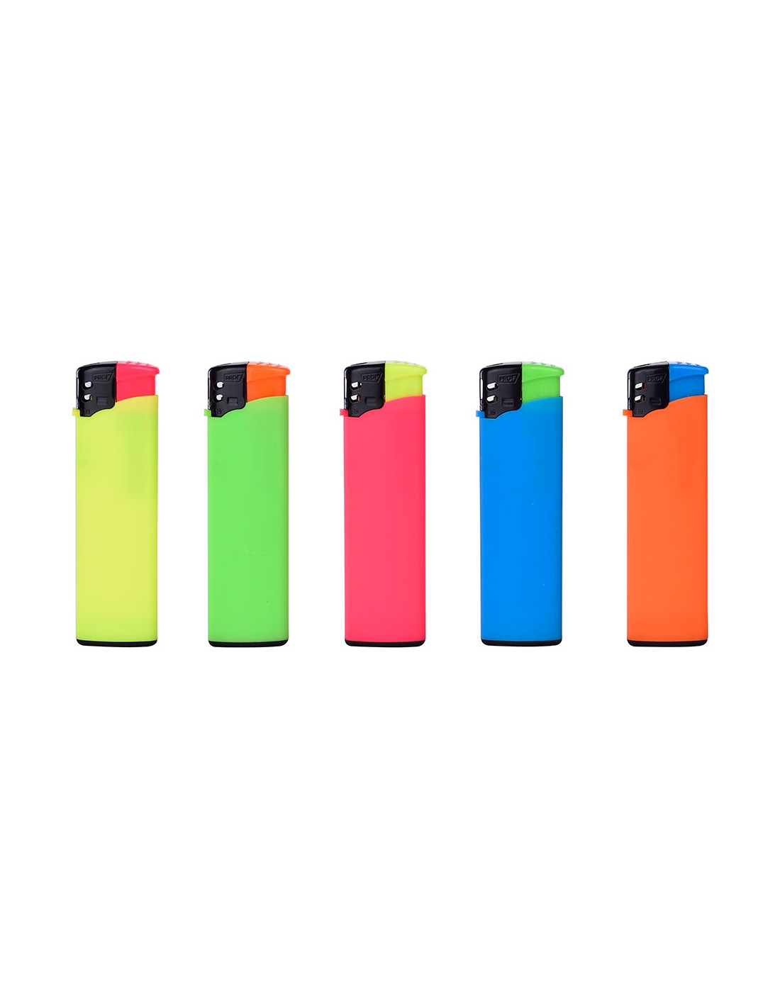 Encendedor electrónico rubber touch, colores surtidos. presentado en expositor de 50 uds