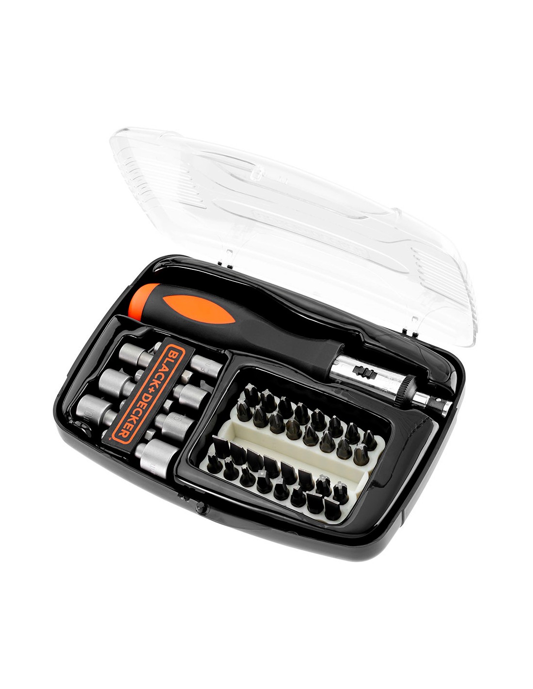 Juego de 40 piezas para atornillar con atornillador de carraca a7062-xj black+decker. contiene: puntas pozidriv 25mm, puntas phillips 25mm, puntas planas 25mm, puntas torx 25mm, puntas cuadradas 25mm, 6 llaves para pernos.