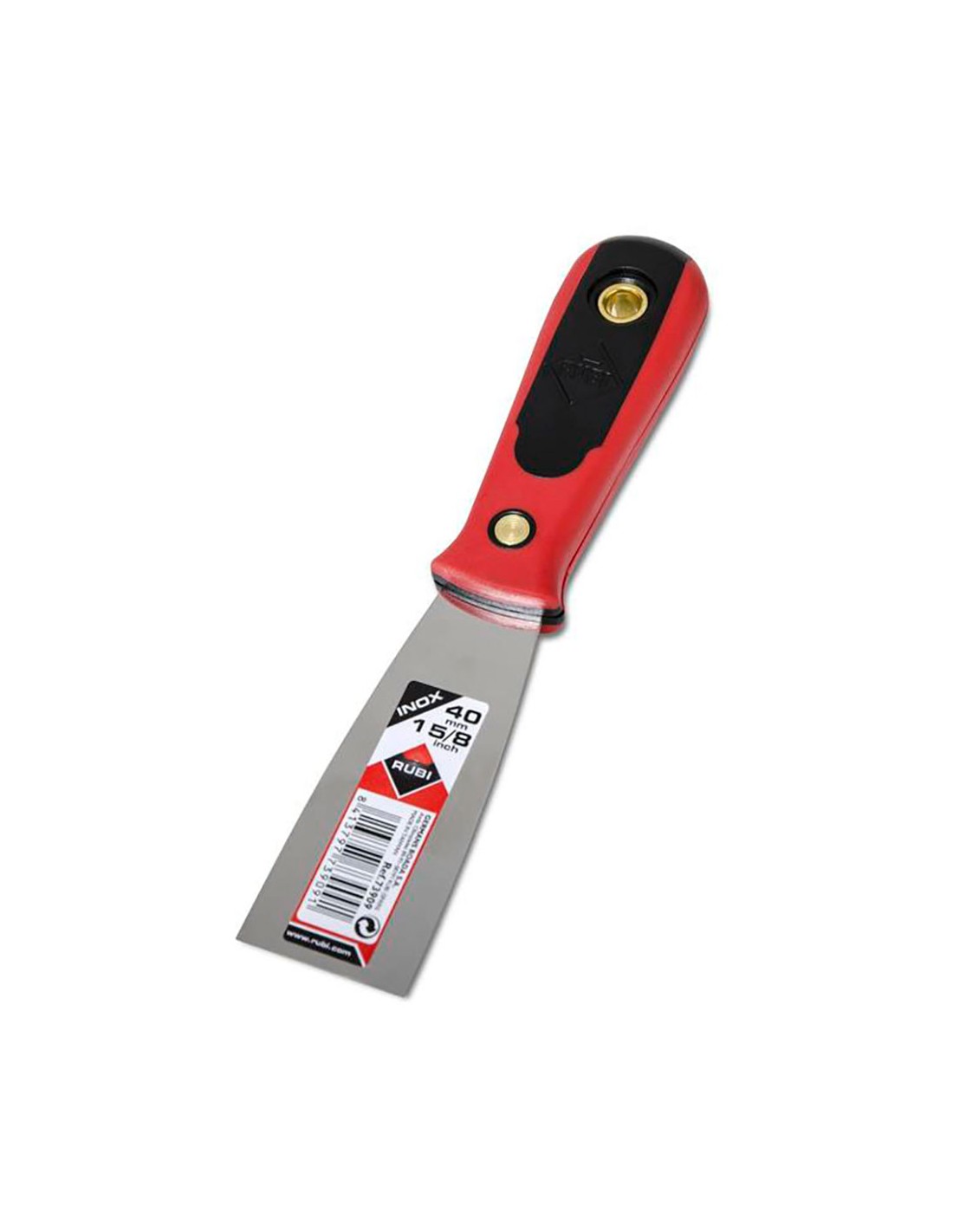 Espátula inox 40mm 73909 rubi. las espátulas de pintor son utilizadas tanto por pintores, como yeseros y albañiles en general. la lámina de acero inoxidable de las espátulas de pintor con mango bimaterial rubiflex de rubi asegura la máxima resistencia y una buena flexibilidad, así como la resistencia a la oxidación. su uso principal es la aplicación y alisado de pastas y masillas, pero gracias a la alta resistencia al desgaste de la lámina de acero inoxidable, también se pueden utilizar para rascar y eliminar restos de otros materiales, como papel pintado, moquetas, adhesivos, etc. la lámina de acero inoxidable ocupa toda la espátula, insentándose en el mango bimaterial rubiflex, quedado fijada por un remache, lo que garantiza la durabilidad de la herramienta. el mango bimaterial rubiflex aporta un mucho grip y confort durante el uso de la espátula. espátula de 40mm de anchura en la parte inferior.