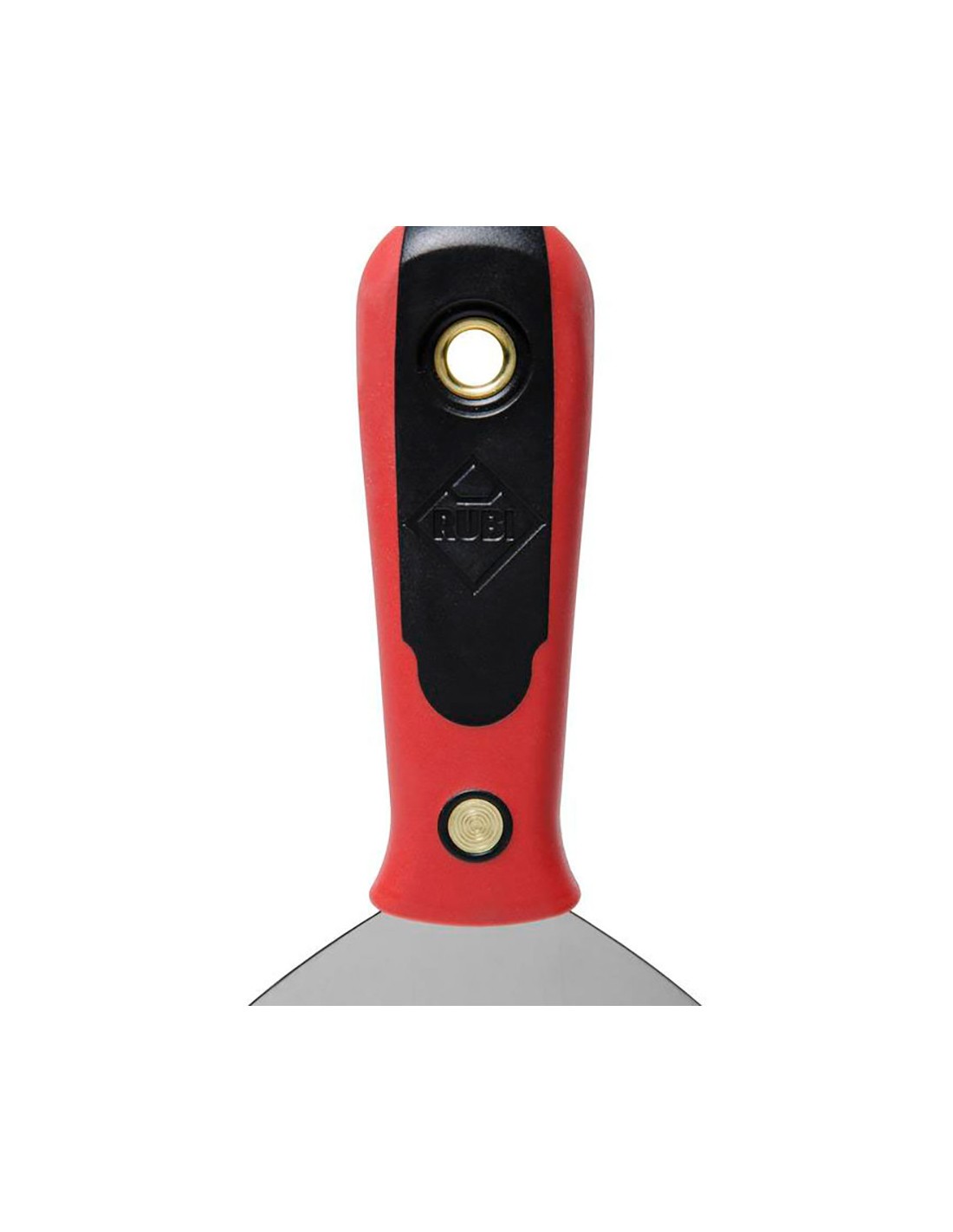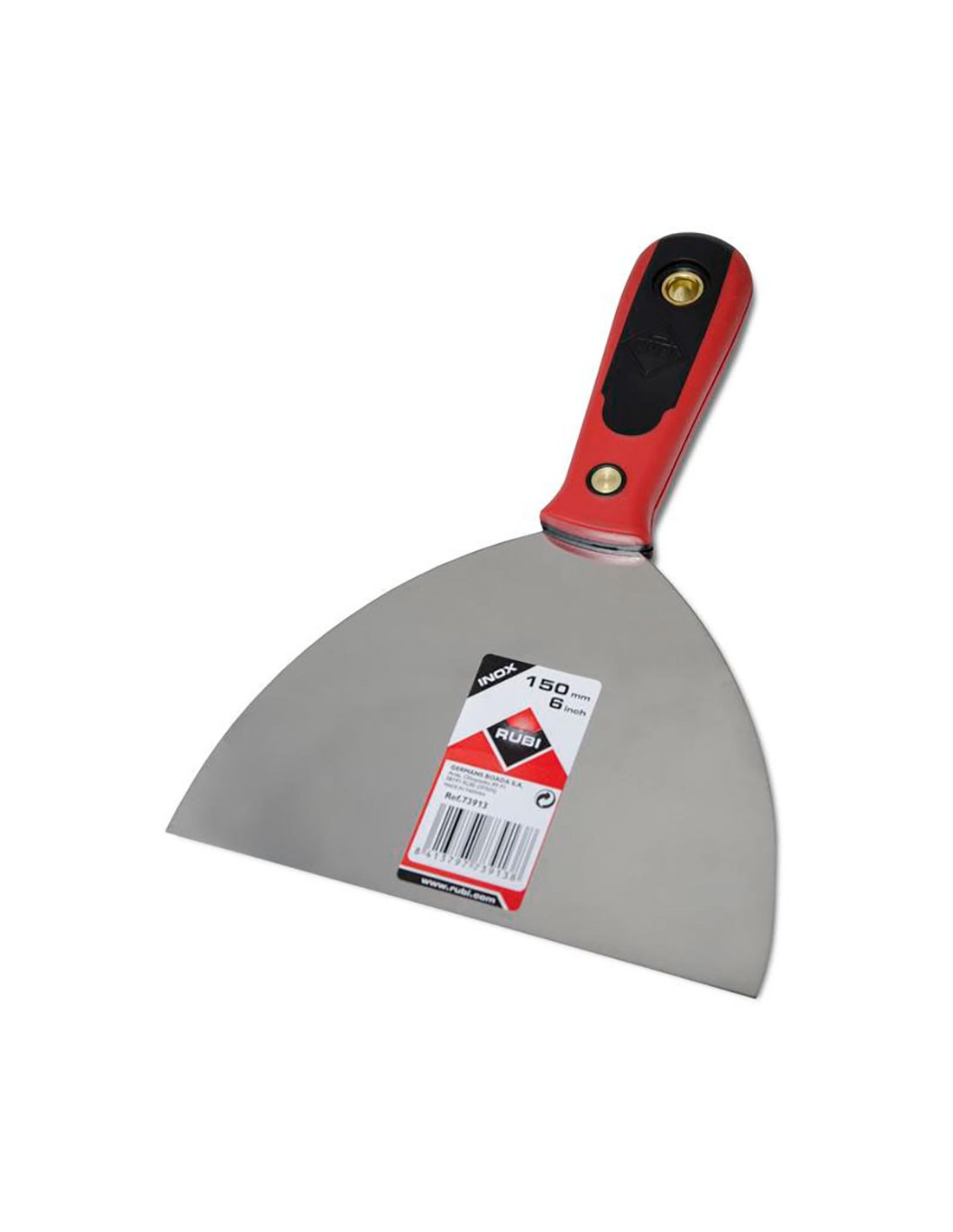 Espátula inox 150mm 73913 rubi. las espátulas de pintor son utilizadas tanto por pintores, como yeseros y albañiles en general. la lámina de acero inoxidable de las espátulas de pintor con mango bimaterial rubiflex de rubi asegura la máxima resistencia y una buena flexibilidad, así como la resistencia a la oxidación. su uso principal es la aplicación y alisado de pastas y masillas, pero gracias a la alta resistencia al desgaste de la lámina de acero inoxidable, también se pueden utilizar para rascar y eliminar restos de otros materiales, como papel pintado, moquetas, adhesivos, etc. la lámina de acero inoxidable ocupa toda la espátula, insentándose en el mango bimaterial rubiflex, quedando fijada por un remache, lo que garantiza la durabilidad de la herramienta. el mango bimaterial rubiflex aporta un mucho grip y confort durante el uso de la espátula. espátula de 150mm de anchura en la parte inferior.