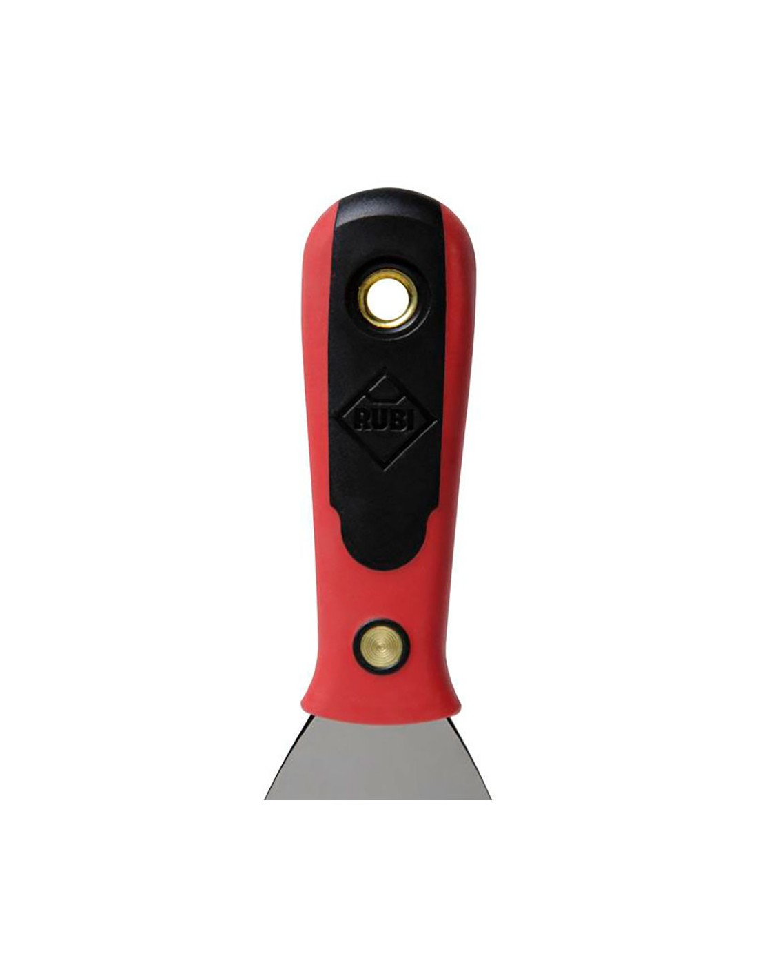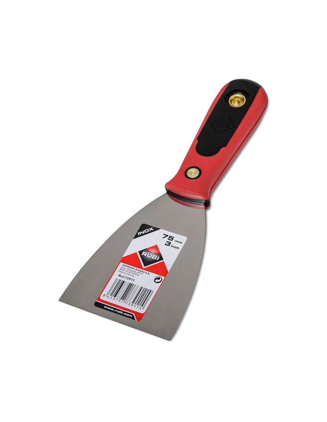Espátula inox 75mm 73911 rubi. las espátulas de pintor son utilizadas tanto por pintores, como yeseros y albañiles en general. la lámina de acero inoxidable de las espátulas de pintor con mango bimaterial rubiflex de rubi asegura la máxima resistencia y una buena flexibilidad, así como la resistencia a la oxidación. su uso principal es la aplicación y alisado de pastas y masillas, pero gracias a la alta resistencia al desgaste de la lámina de acero inoxidable, también se pueden utilizar para rascar y eliminar restos de otros materiales, como papel pintado, moquetas, adhesivos, etc. la lámina de acero inoxidable ocupa toda la espátula, insentándose en el mango bimaterial rubiflex, quedando fijada por un remache, lo que garantiza la durabilidad de la herramienta. el mango bimaterial rubiflex aporta un mucho grip y confort durante el uso de la espátula. espátula de 75mm de anchura en la parte inferior.