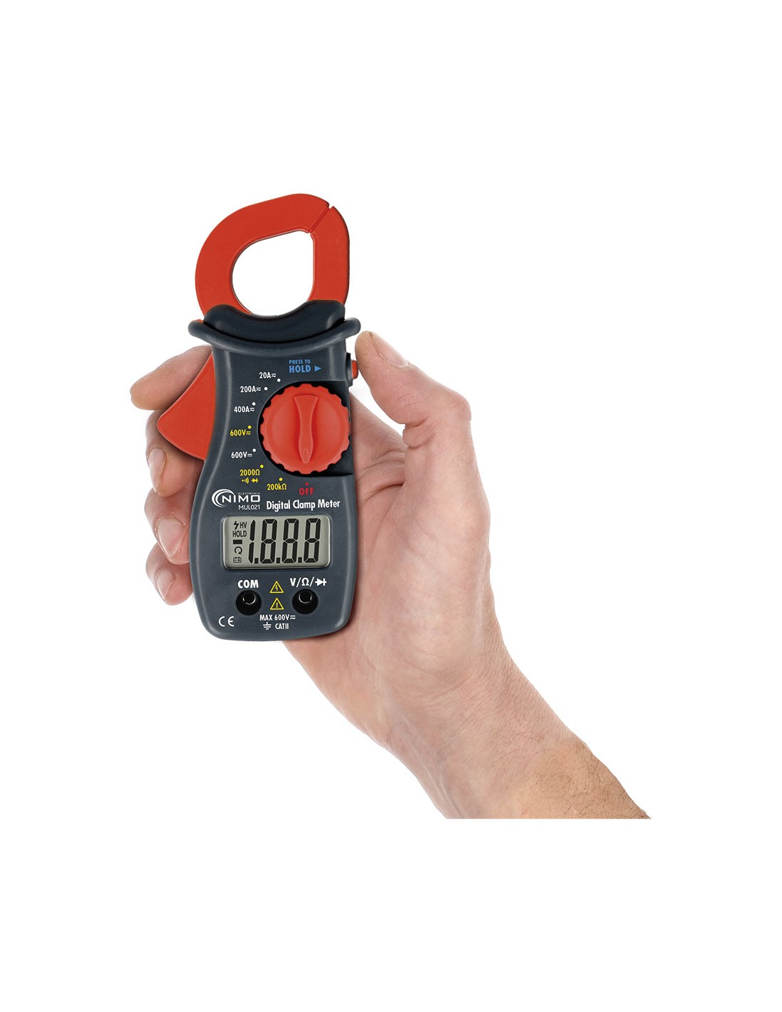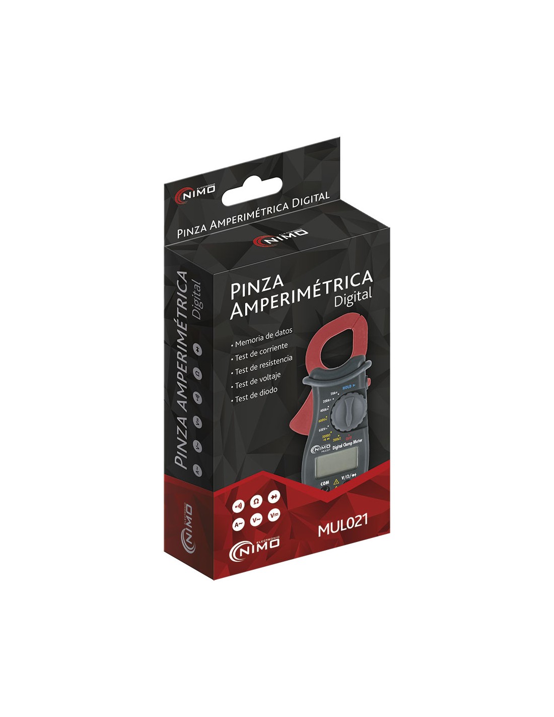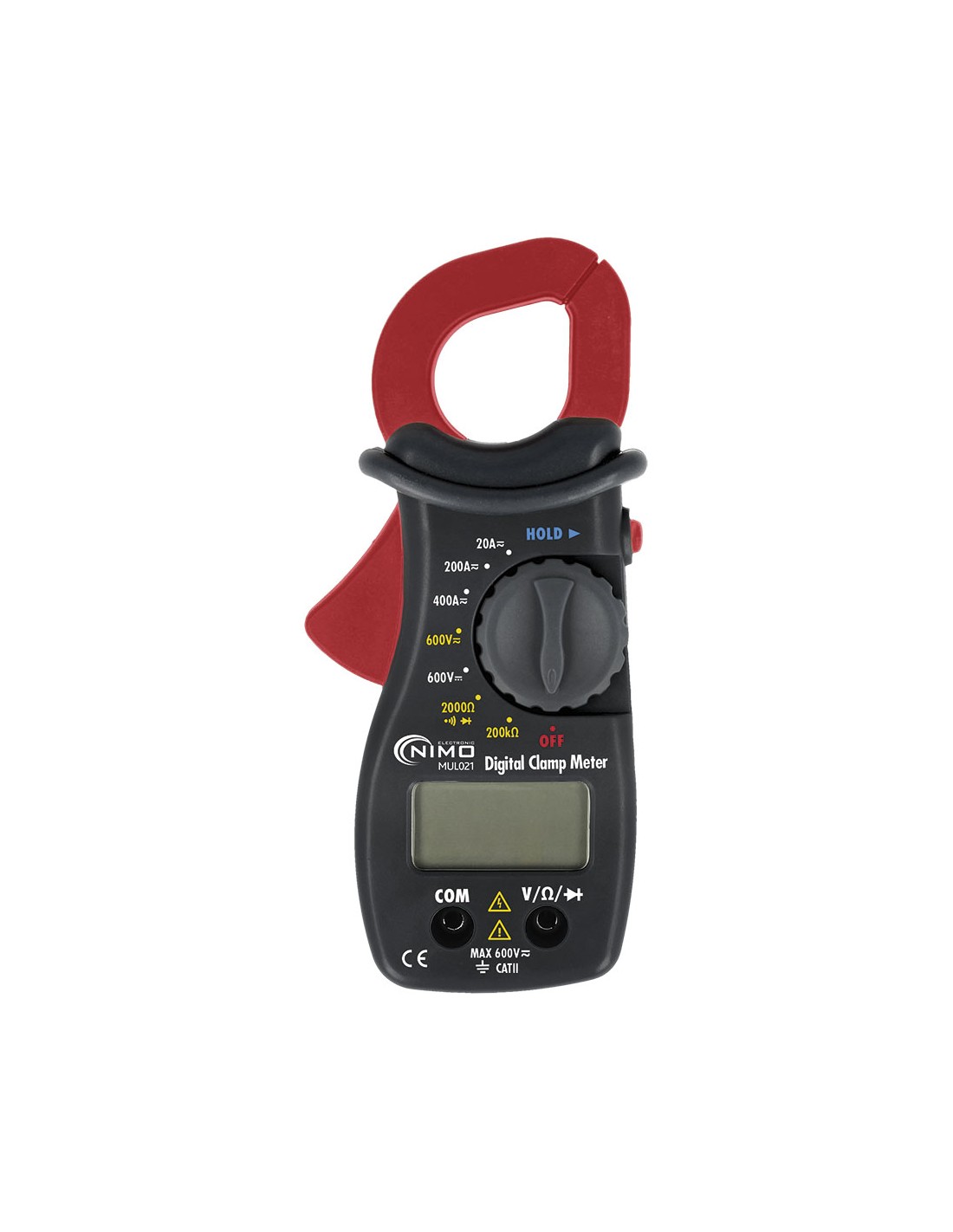 Pinza amperimétrica multifunción 400a ca mul021 nimo. 3/4 dígitos 3999 cuentas,mejor precisión de 1%, auto rango,protección de sobrecarga, funciones extra: mantenimiento de datos, modo standby, indicador de batería baja. especificaciones: vcc: 600v +/-(1,0%+5) vca: 600v +/-(1,2%+5) aca: 20a +/-(3,0%+5) 200a-400a +/-(2,5%+13),resistencia: 200ohm +/-(1,2%+2), 200kohm +/-(1,50%+2)prueba de diodo. continuidad con pitido en resistencia menor a 30ohm. accesorios: puntas de prueba, cat.ii 600v, corriente 400aca, funciones vcc/vca/aca/resistencia/continuidad/diodos, 151,0x70,0x34,0mm.