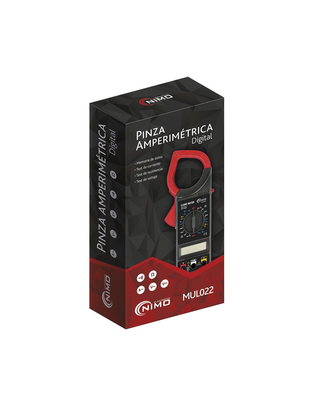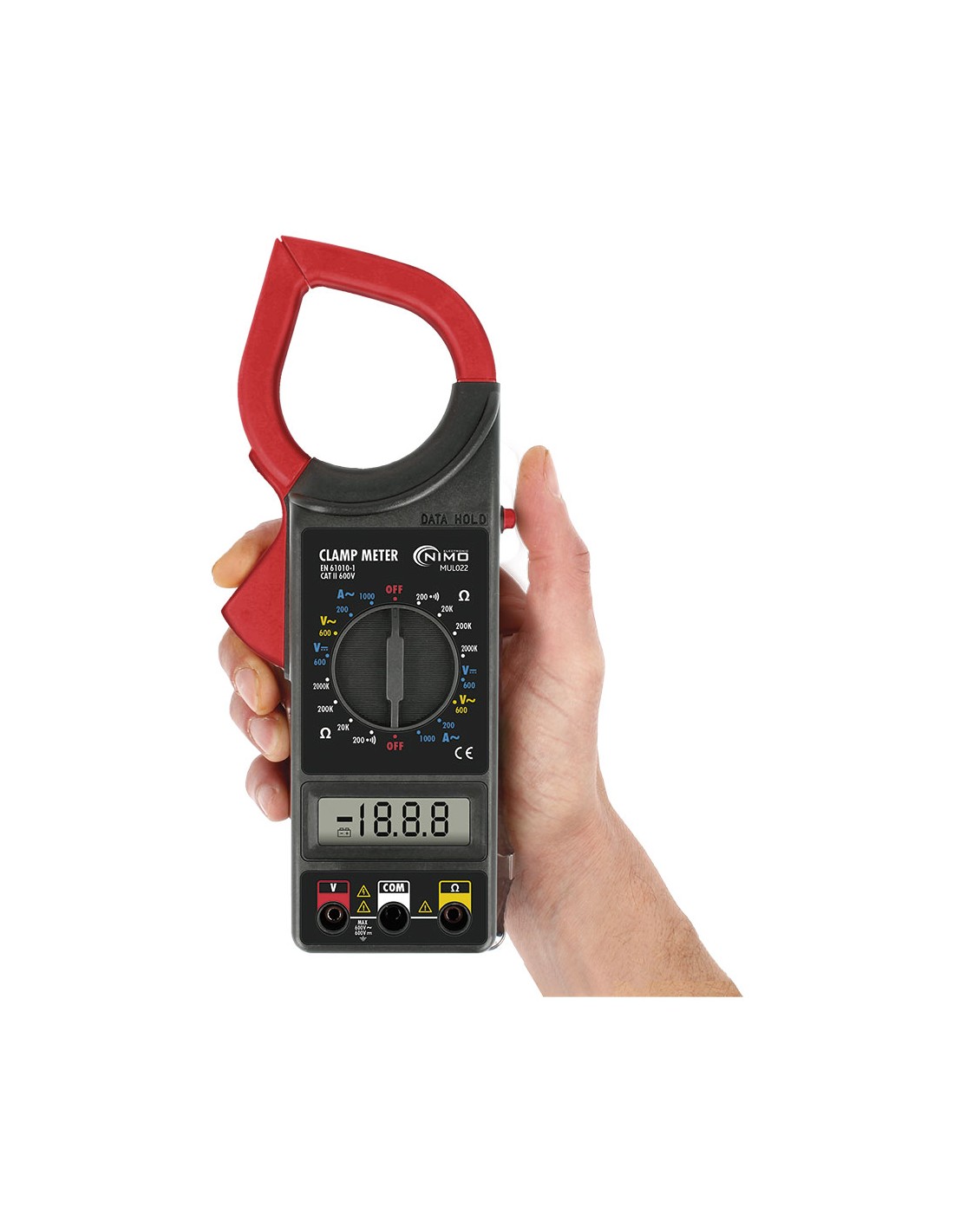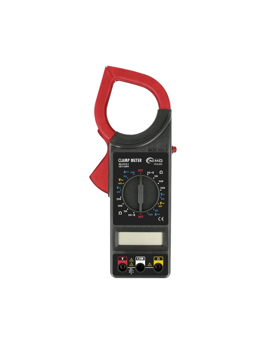 Pinza amperimétrica multifunción 1000a ca mul022 nimo, pinza amperimétrica de gran capacidad 50mm. botón de mantenimiento de lectura, selector rotativo de función, terminal de entrada con v/ohm, apertura de pinza mediante gatillo hasta un máximo de 50mm, indicador sonoro de continuidad, indicador de batería baja, puntas de prueba y estuche de transporte, cat.ii 600v (en61010-1), corriente 200a/1000a ca, funciones ac/vca/ohm/aca/continuidad con sonido, 230x70x37mm, 600vcc/600vca.