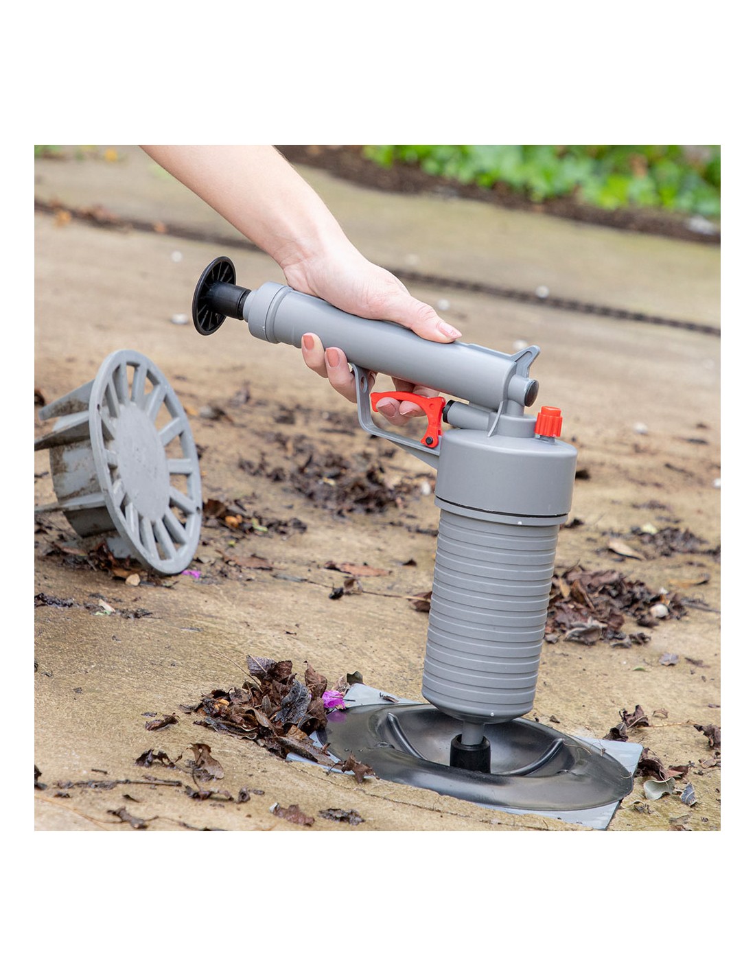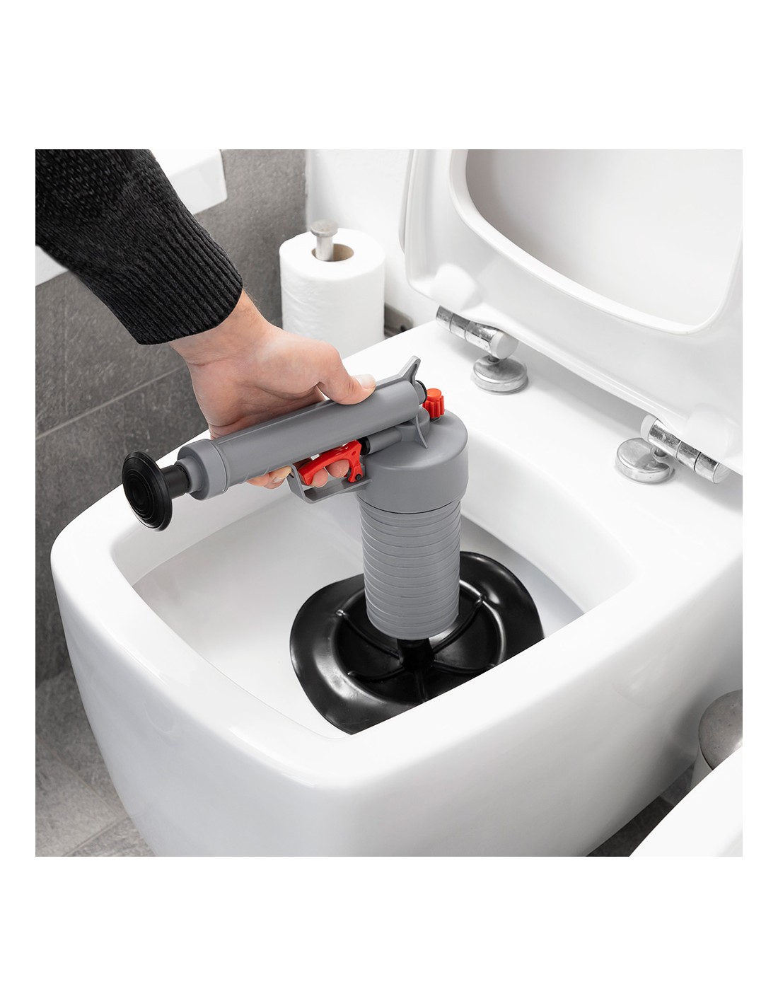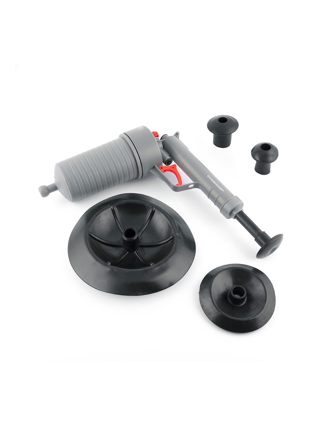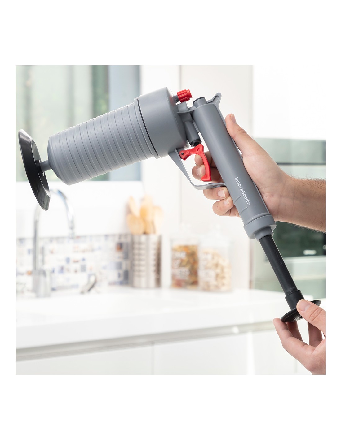 Pistola desatascadora de aire comprimido. para eliminar fácilmente la suciedad acumulada en todo tipo de desagües de cocinas, baños, terrazas, etc. incluye 4 accesorios adaptadores universales de diferentes tamaños. además, permite desatascar de forma respetuosa con el medio ambiente, sin necesidad de productos químicos ni tóxicos. ideal para desatascar los fregaderos de la cocina, donde suelen acumularse restos de comida, aunque también es muy últil para desatascar lavabos, bañeras, duchas, etc. esta herramienta manual es muy fácil de usar. incluye 4 adaptadores: ø2,5, ø3,5, ø9, ø18,5cm. medidas ø9x28cm