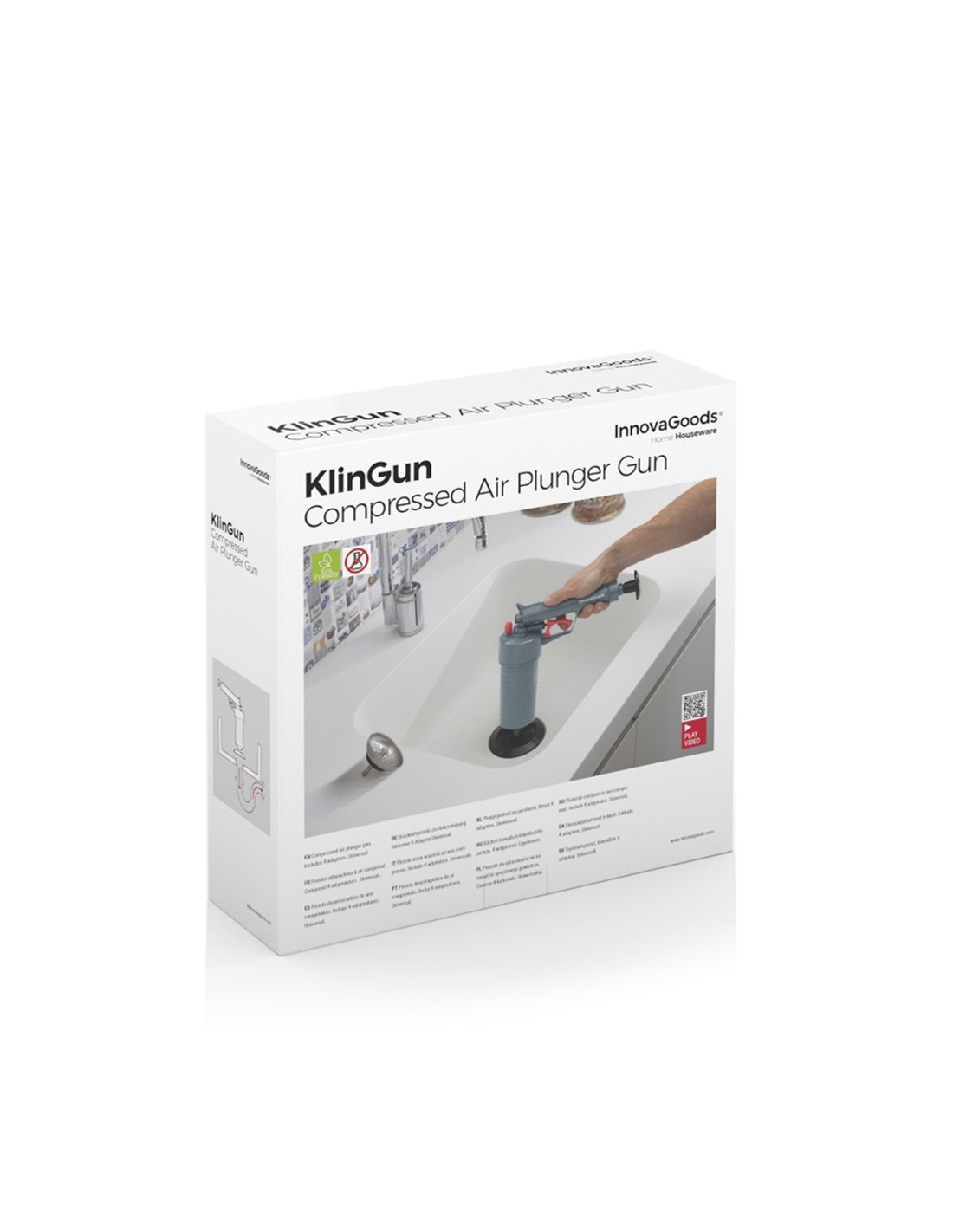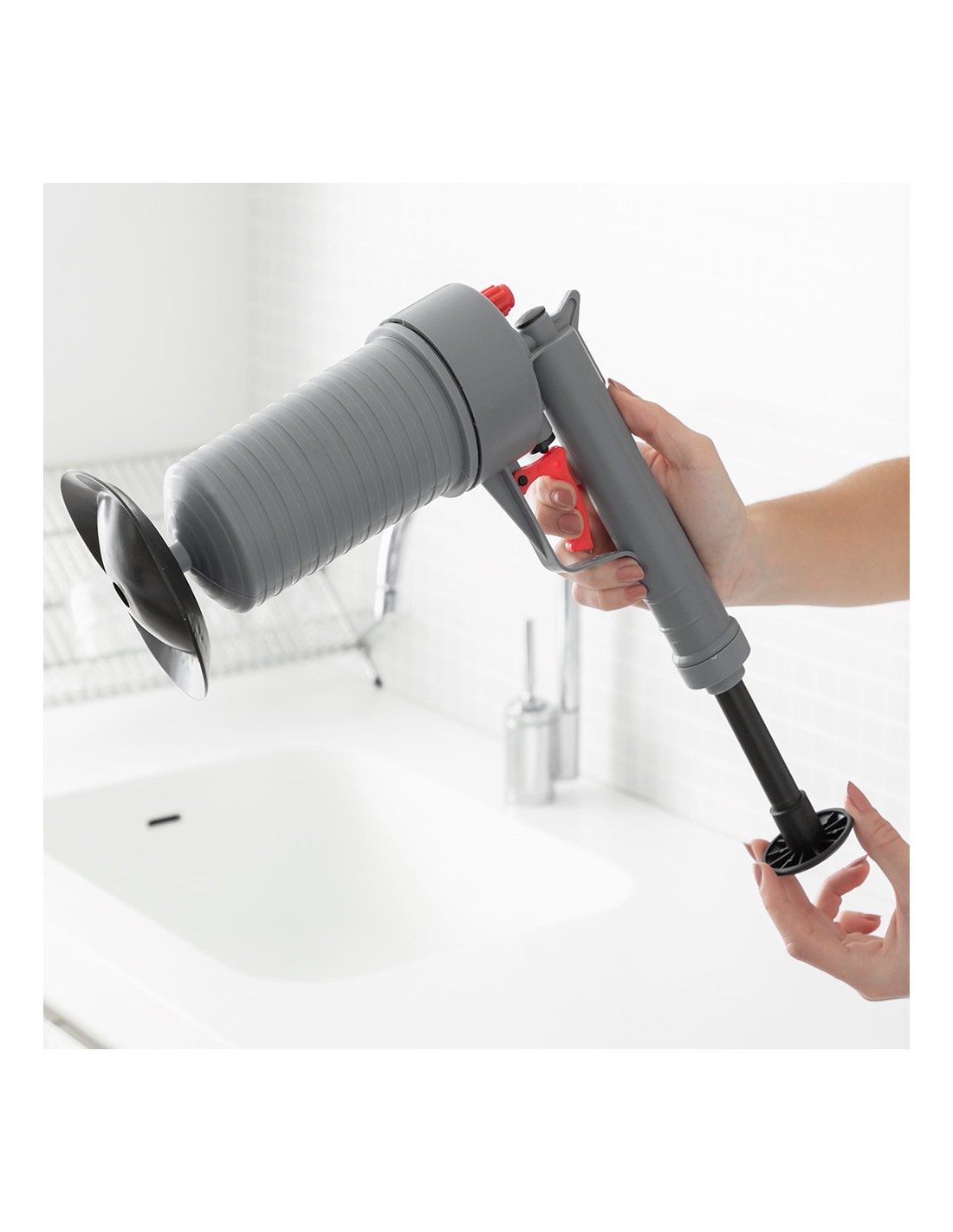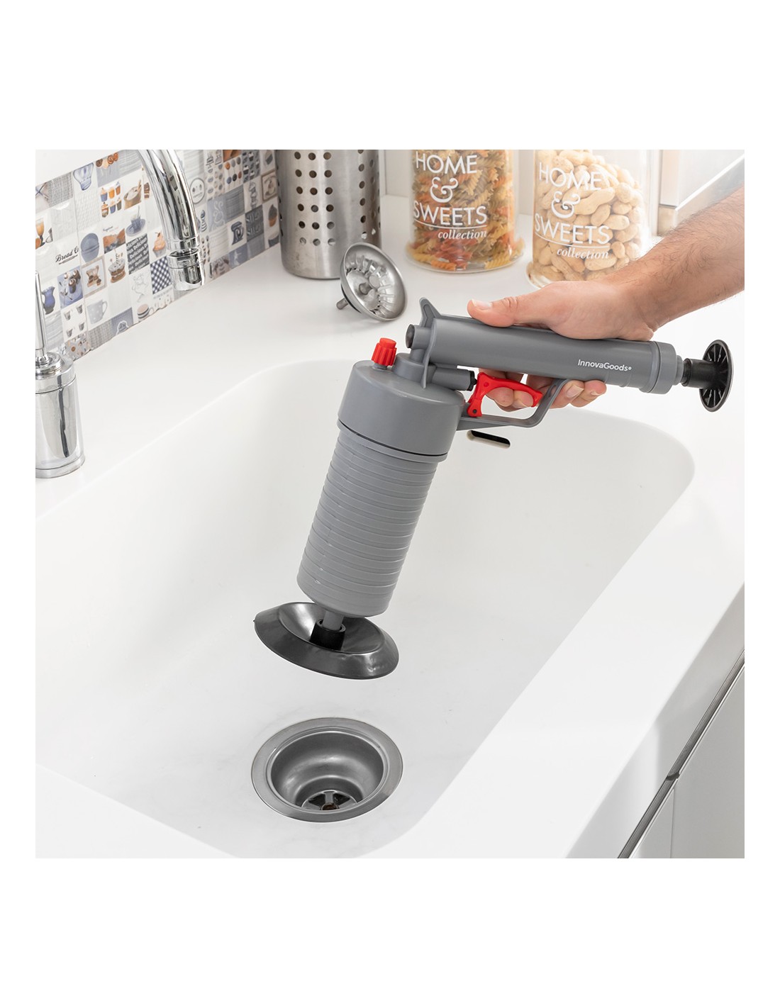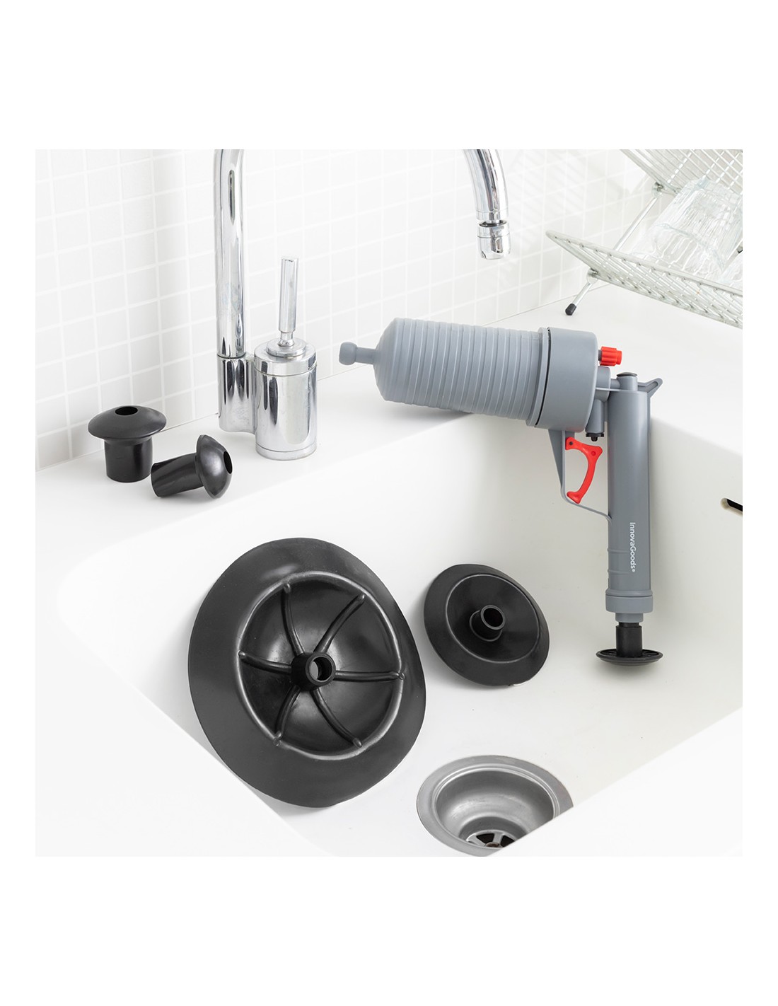 Pistola desatascadora de aire comprimido. para eliminar fácilmente la suciedad acumulada en todo tipo de desagües de cocinas, baños, terrazas, etc. incluye 4 accesorios adaptadores universales de diferentes tamaños. además, permite desatascar de forma respetuosa con el medio ambiente, sin necesidad de productos químicos ni tóxicos. ideal para desatascar los fregaderos de la cocina, donde suelen acumularse restos de comida, aunque también es muy últil para desatascar lavabos, bañeras, duchas, etc. esta herramienta manual es muy fácil de usar. incluye 4 adaptadores: ø2,5, ø3,5, ø9, ø18,5cm. medidas ø9x28cm