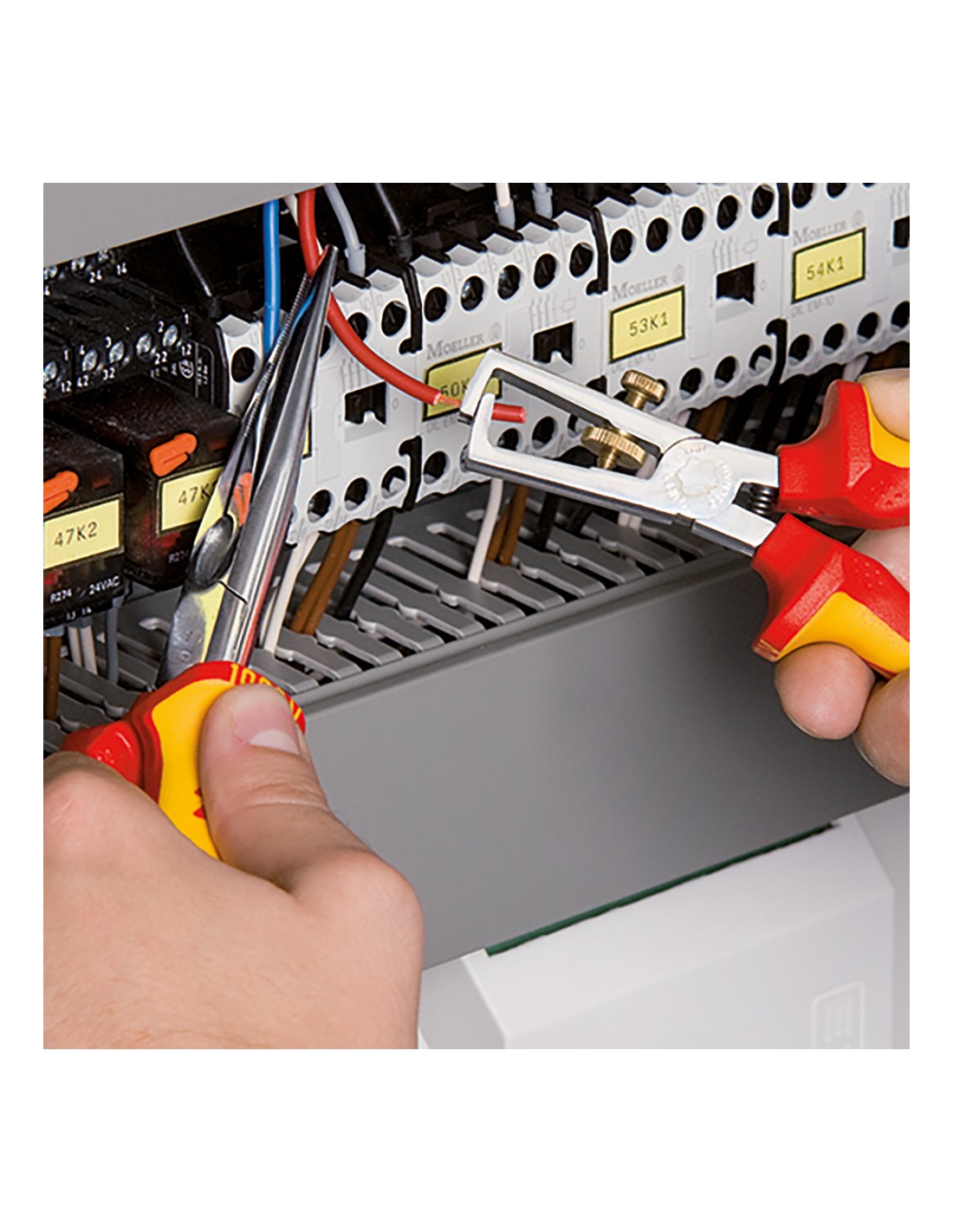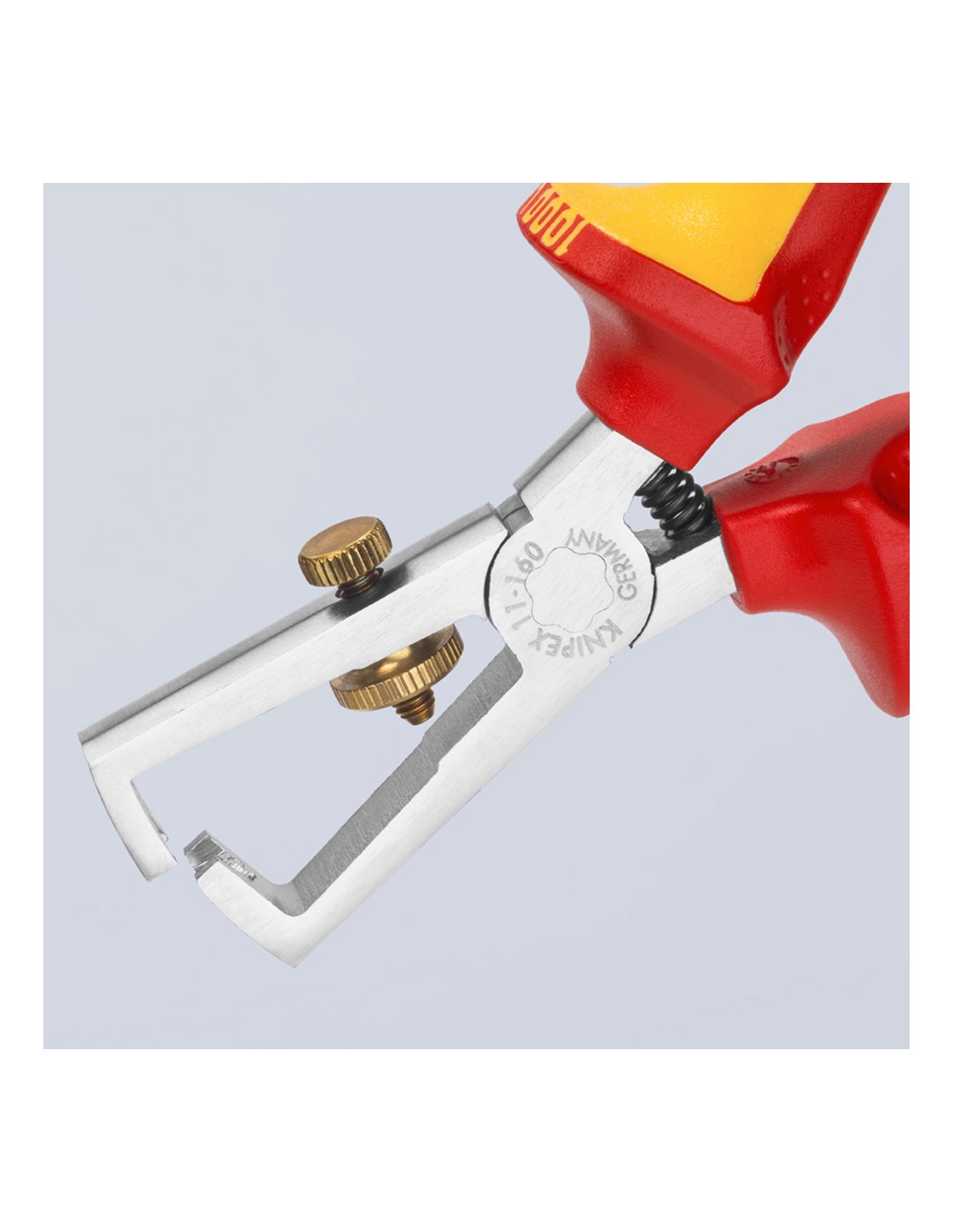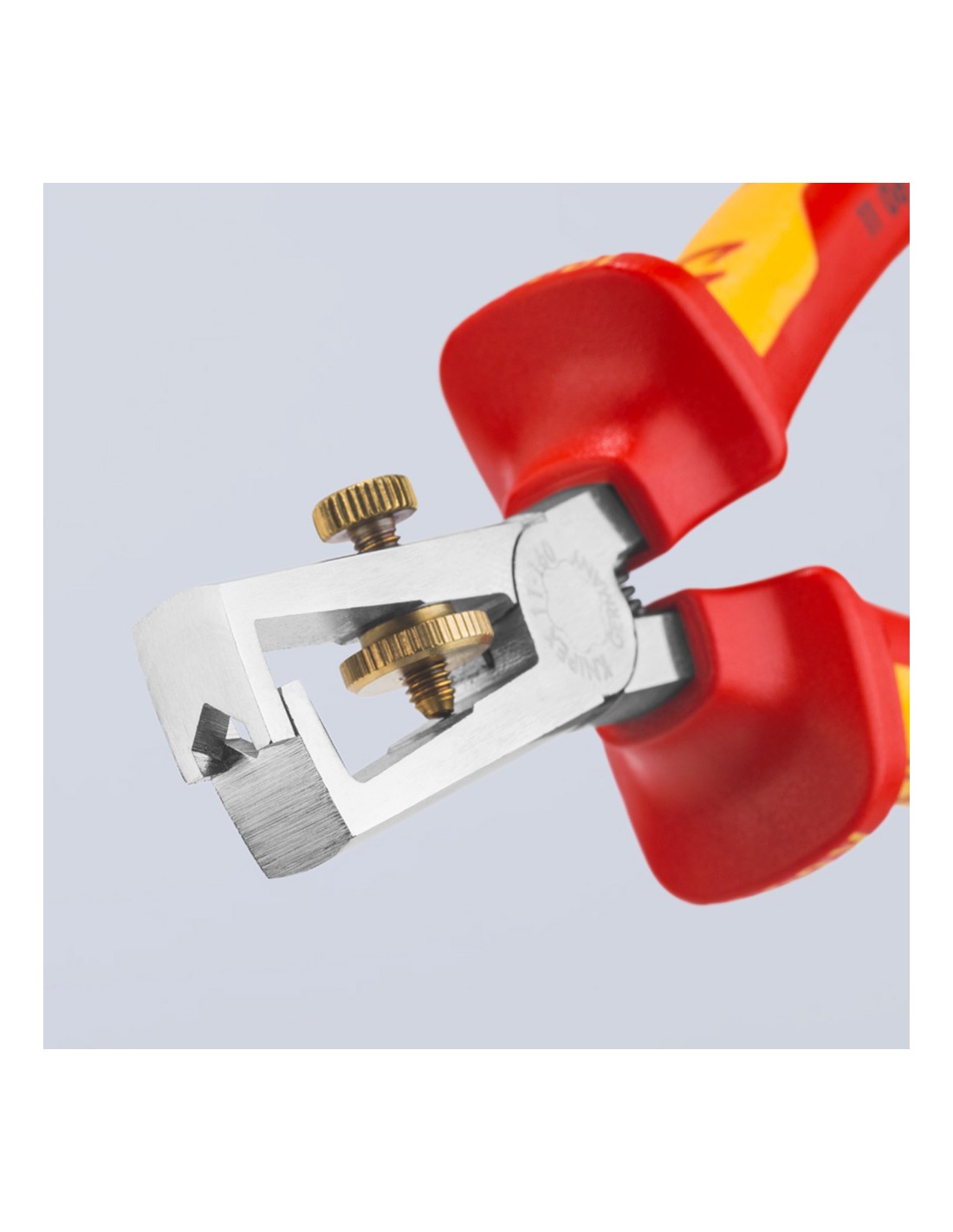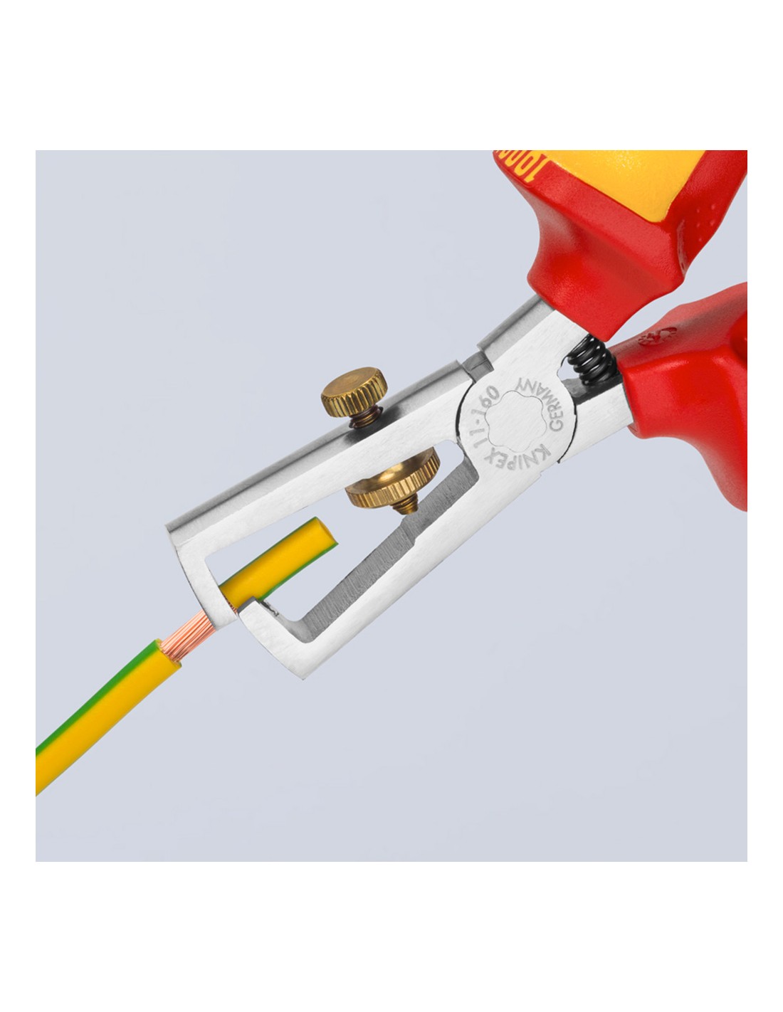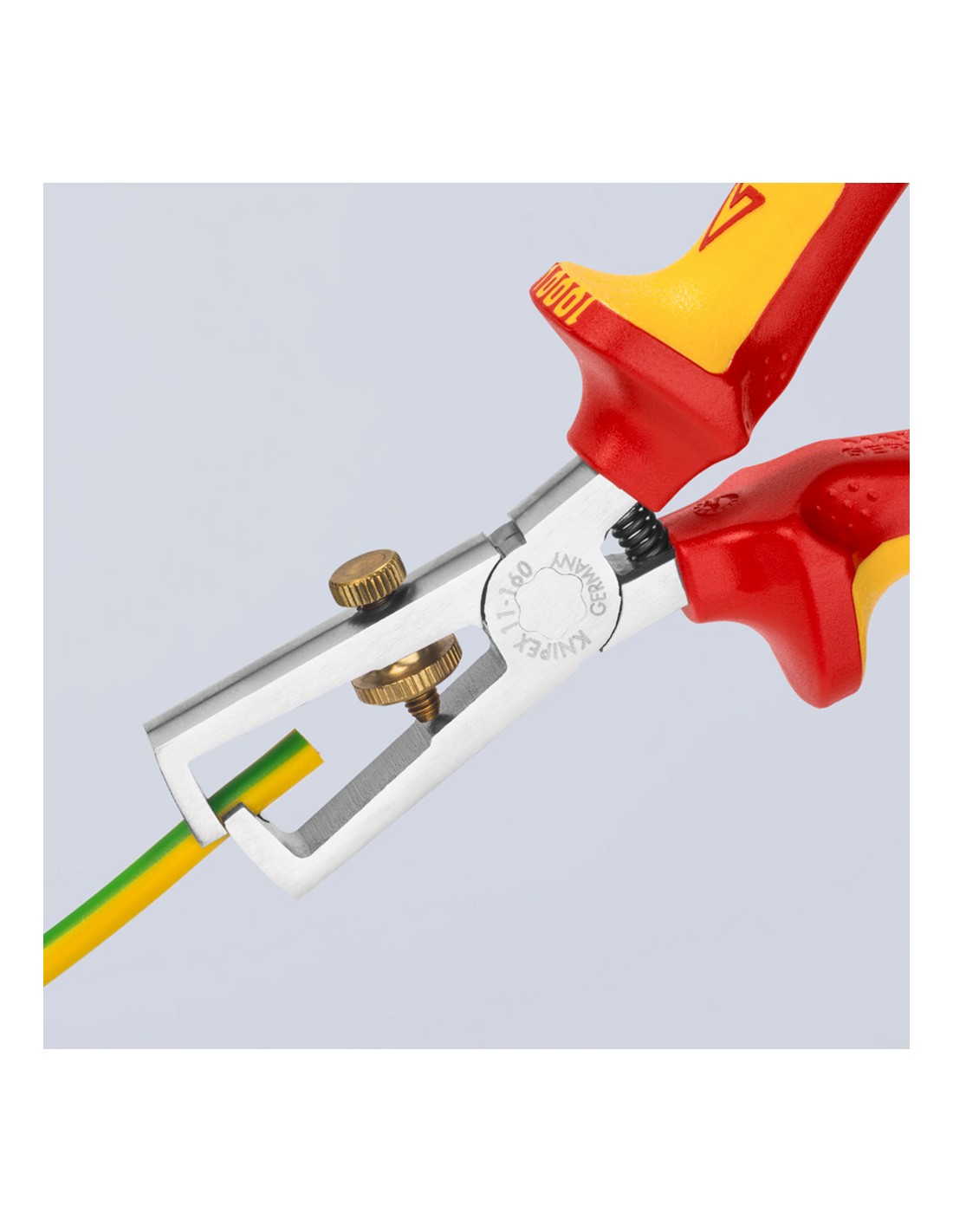 Alicates pelacables cromado, mangos aislados con fundas multicomponentes, según norma vde din en 60900, iec 60900. 200g. dimensiones: 160x57x19mm. para conductores de uno o varios hilos y de hilos finos con aislamiento de plástico o de goma de máximo 5mm de diámetro o 10mm de sección de cable.fácil ajuste al diámetro del hilo mediante tuerca interior. acero especial para herramientas, forjado, templado al aceite