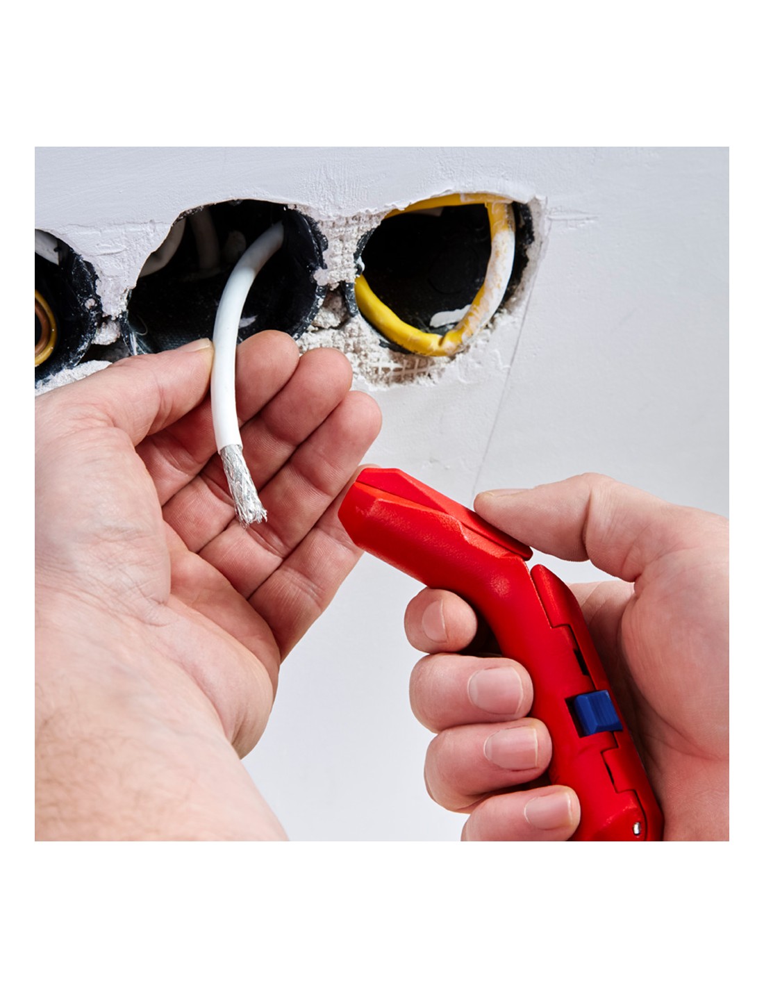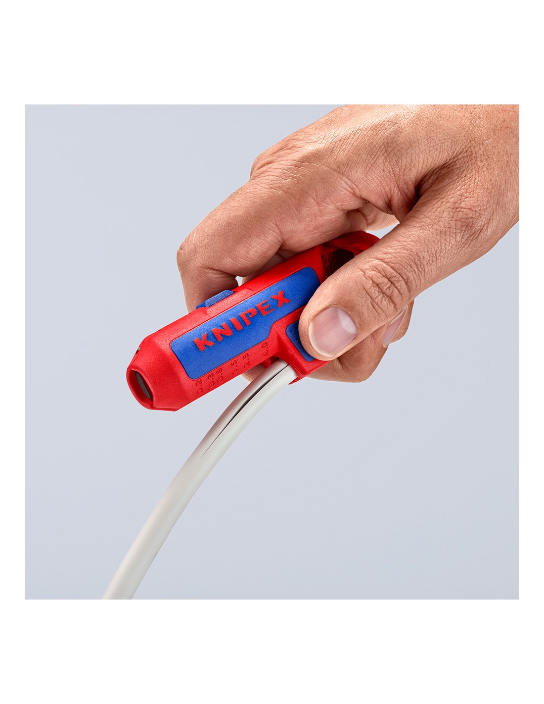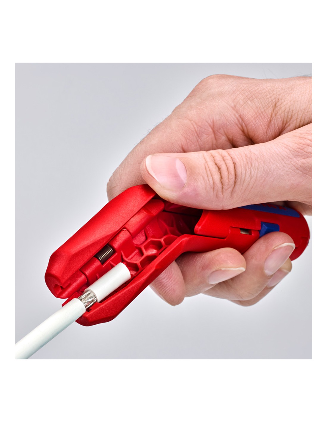 Pelamangueras universal ergostrip 169501sb knipex. knipex ergostrip®, pelacables universal herramienta universal para pelar todo tipo de cables convencionales nym así como para cables de datos y coaxiales ideal para electricistas, montadores de instalaciones industriales e instaladores. 75g. dimensiones: 135x85x37mm. producto premiado y también para personas zurdas: knipex ergostrip® y knipex ergostrip® l.cables nym de 3x1,5mm hasta 5x2,5mm), cables de datos (ej: twisted-pair) y cables coaxiales. extremos de la herramienta con forma cónica para un mejor acceso en espacios reducido. dispositivo de pelado para las secciones 0,2/0,3/0,8/1,5/2,5/4mm. sencilla colocación de cables unitarios al pelar mediante zonas de posicionamient. carcasa de plástico estable reforzada con fibra de vidrio.