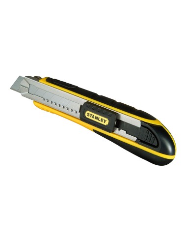 Cúter fatmax® 18 mm. cuerpo de acero inoxidable. mango bimateria. cambio rápido de la hoja. gracias a su diseño de almacenaje una vez eliminada la hoja antigua, automáticamente aparecerá la nueva. mecanismo de limpieza de la hoja. botón de bloqueo. este mecanismo evita la oscilación de la hoja y permite realizar cortes más precisos. rompe hojas extraíble. almacenamiento de 6 hojas