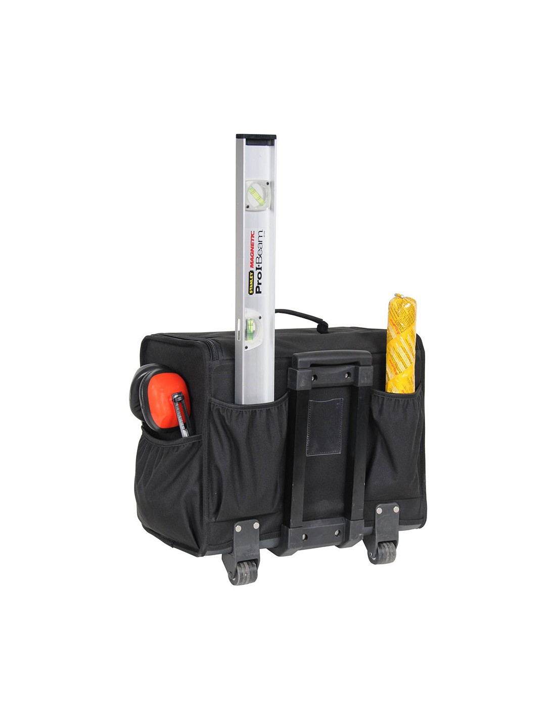 Tejido muy resistente 600x600 denier. estructura rígida que facilita la abertura y el acceso a las herramientas. asa telescópica metálica y ruedas muy resistentes para una maniobrabilidad y estabilidad óptimas. múltiples compartimentos internos y externos que permiten una mejor ordenación. compartimento interno transparente para la ordenación de documentos. divisor extraíble. pies de 5.5cm mantienen la bolsa a una distancia del suelo para evitar que la suciedad y la humedad dañen las herramientas