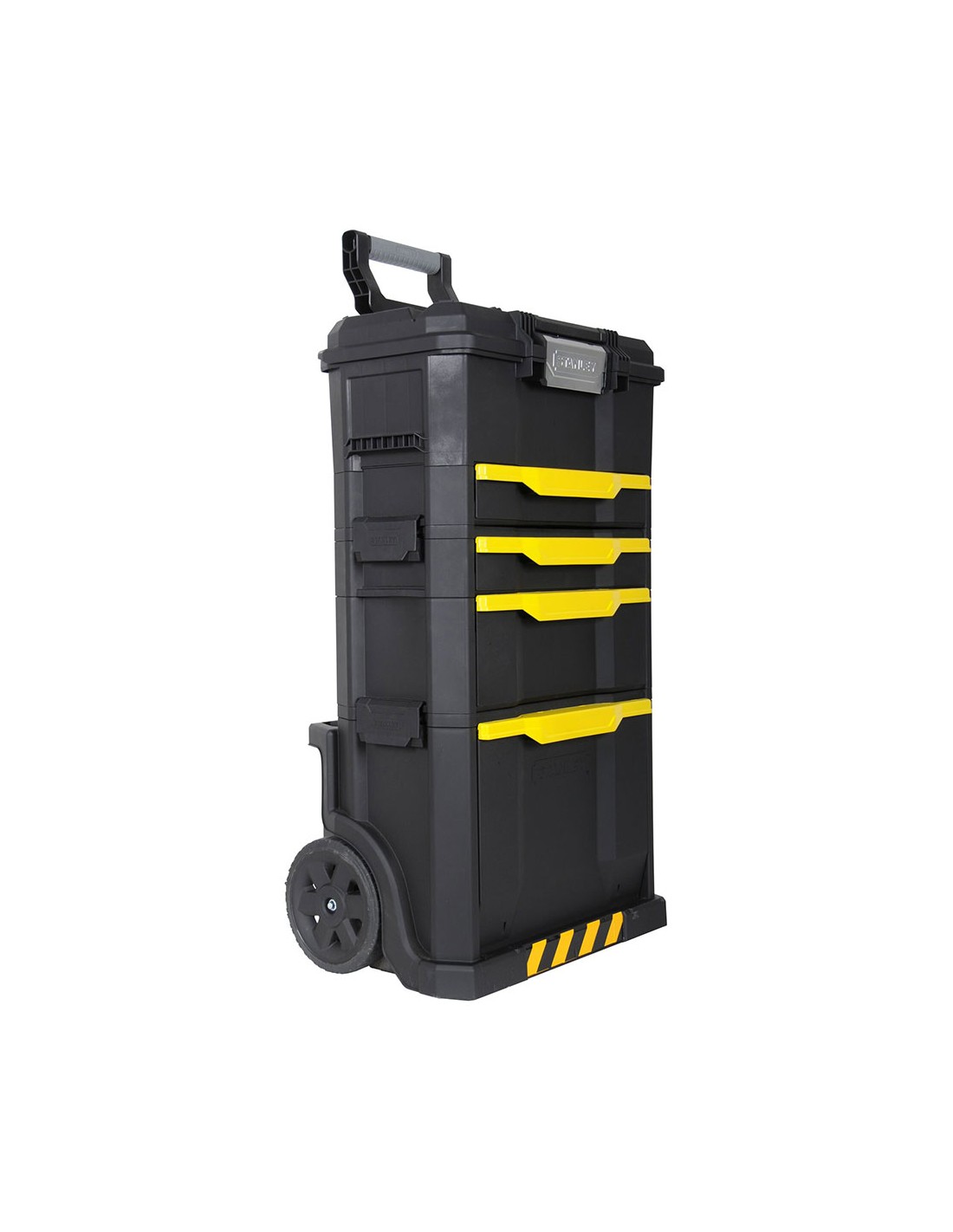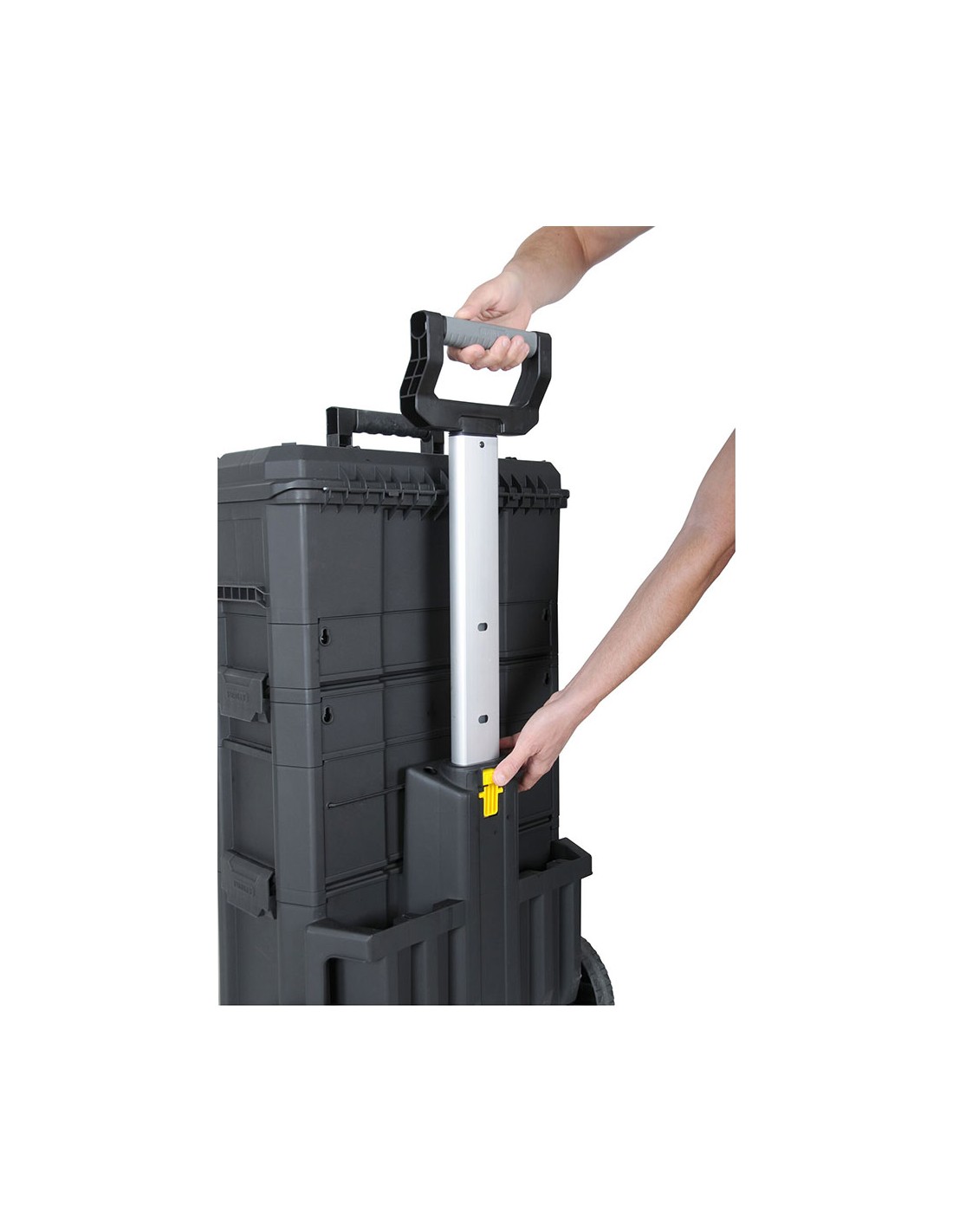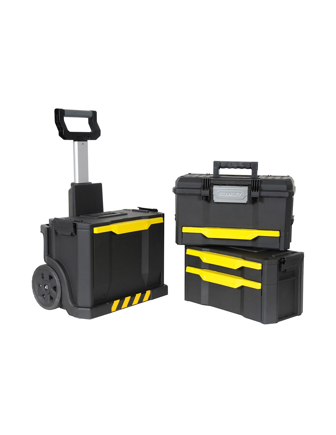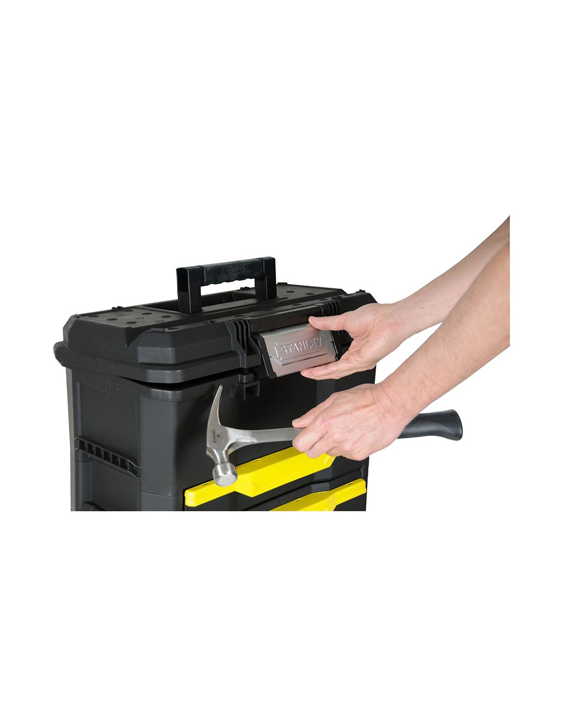 Taller móvil sistema modular. cajonera con 2 cajones, uno de poca profundidad para accesorios pequeños y otro con más profundidad para accesorios mayores y guias de rodamiento de bolas. contenedor con tapa abatible de gran capacidad para herramienta electrica, niveles etc. mango telescópico en aluminio. bolsillos traseros para herramientas largas, como niveles y serruchos