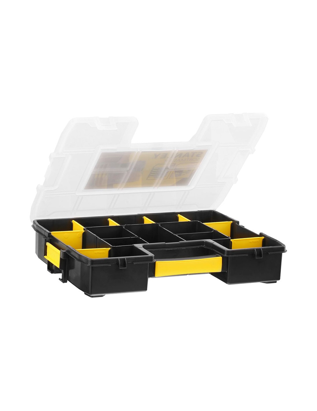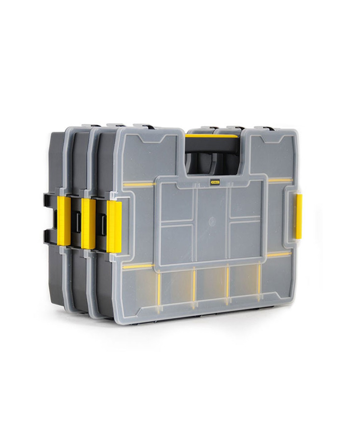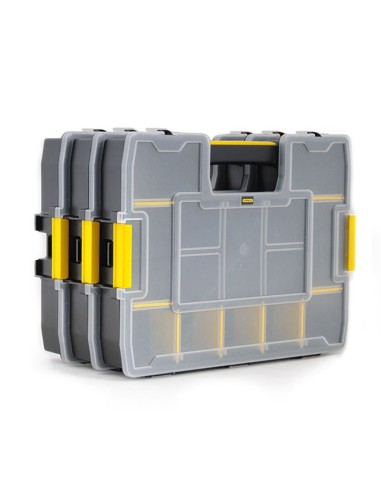 Organizador sort master junior. esquinas ampliables según sus necesidades, diseñadas para poder almacenar herramientas que requieran un espacio modular. este organizador permite combinar el almacenamiento de herramientas y piezas pequeñas. compartimentos con separaciones modulables. el diseño interior de la tapa previene el desplazamiento involuntario de las piezas durante el transporte. posibilidad de transportar hasta 3 unid. a la vez