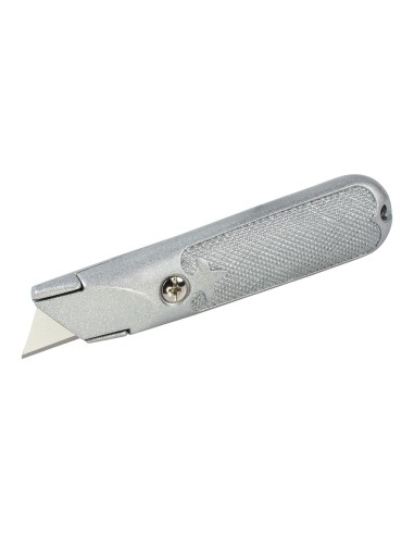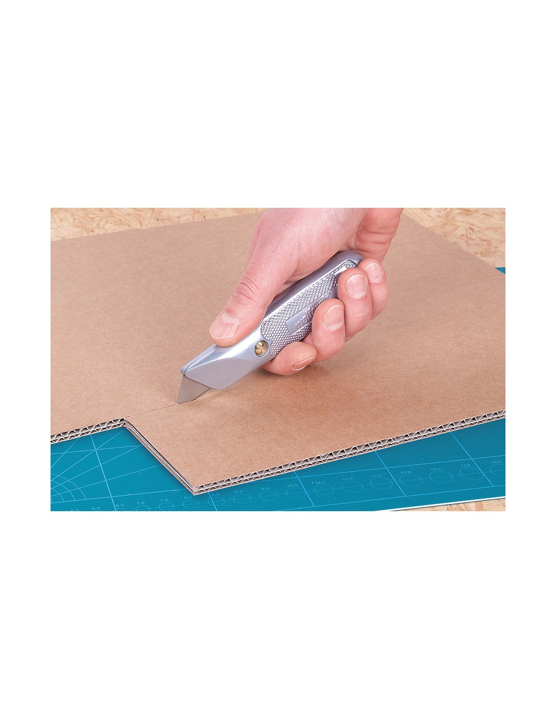 Cúter con cuchilla trapezoidal estándar cúter de cuchilla fija carcasa metálica con superficie especial para un agarre antideslizante compatible con las cuchillas trapezoidales y de garfio convencionales cambio de las cuchillas mediante un tornillo integrado