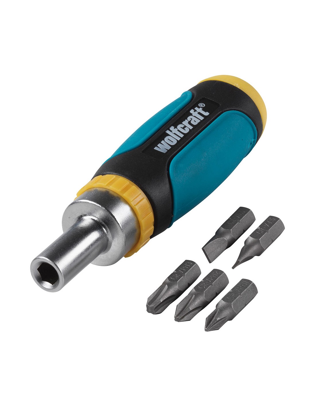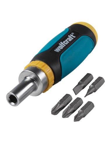 Miniatornillador manual con función de carraca para atornillar y desatornillar sin reposicionar la herramienta piezas en el juego: 6 piezas miniatornillador manual con función de carraca, giro hacia la derecha/izquierda y 5 puntas solid (ranura 0,6x4,5mm/1,0x5,5mm/ph 1/2/3) mandril de cambio rápido con enganche hexagonal de ¼ e imán mango de 2 componentes con forma ergonómica peso: 0,144kg 1237000 wolfcraft"