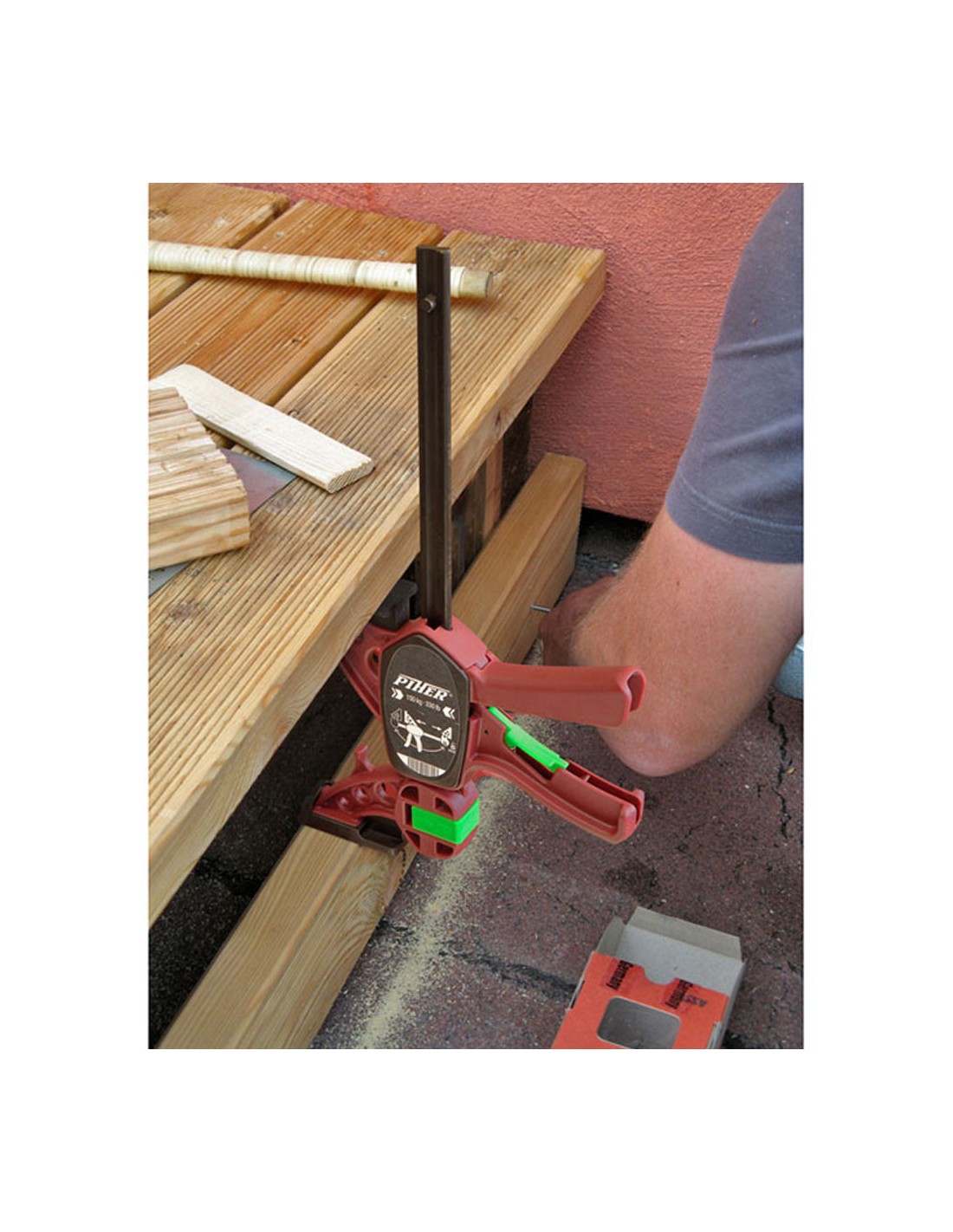 Sargento quick 45 cm extra. presión máxima:150 kg. cabezales de nylon y fibra de vidrio. barra de acero al carbono endurecido 19 x 6,3 mm. reversible fácilmente con un sólo clic. zapatas antideslizantes de 7,4 cm. ligero y fácil de usar con una sola mano.doble juego de 3 pletinas para avance y freno. medidas:64,5 x 22 x 3,5 cm
