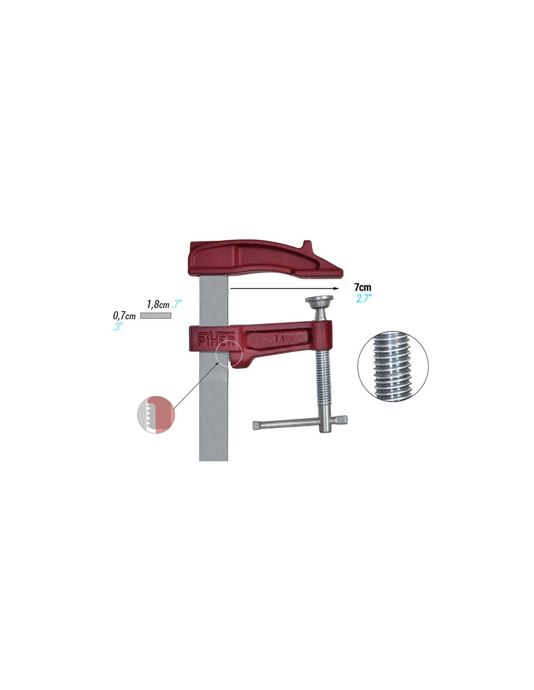 Aprieto piher m-20 cm ref. 01020. aprieto modelo m alcance 7 cm. llanta 18 x 7 mm. llanta de acero calibrada. fuerza máxima 4000n. freno anti-deslizante en cabez móvil. peso: 0,50 kg. medidas: 26,7 x 9,5 x 2 cm