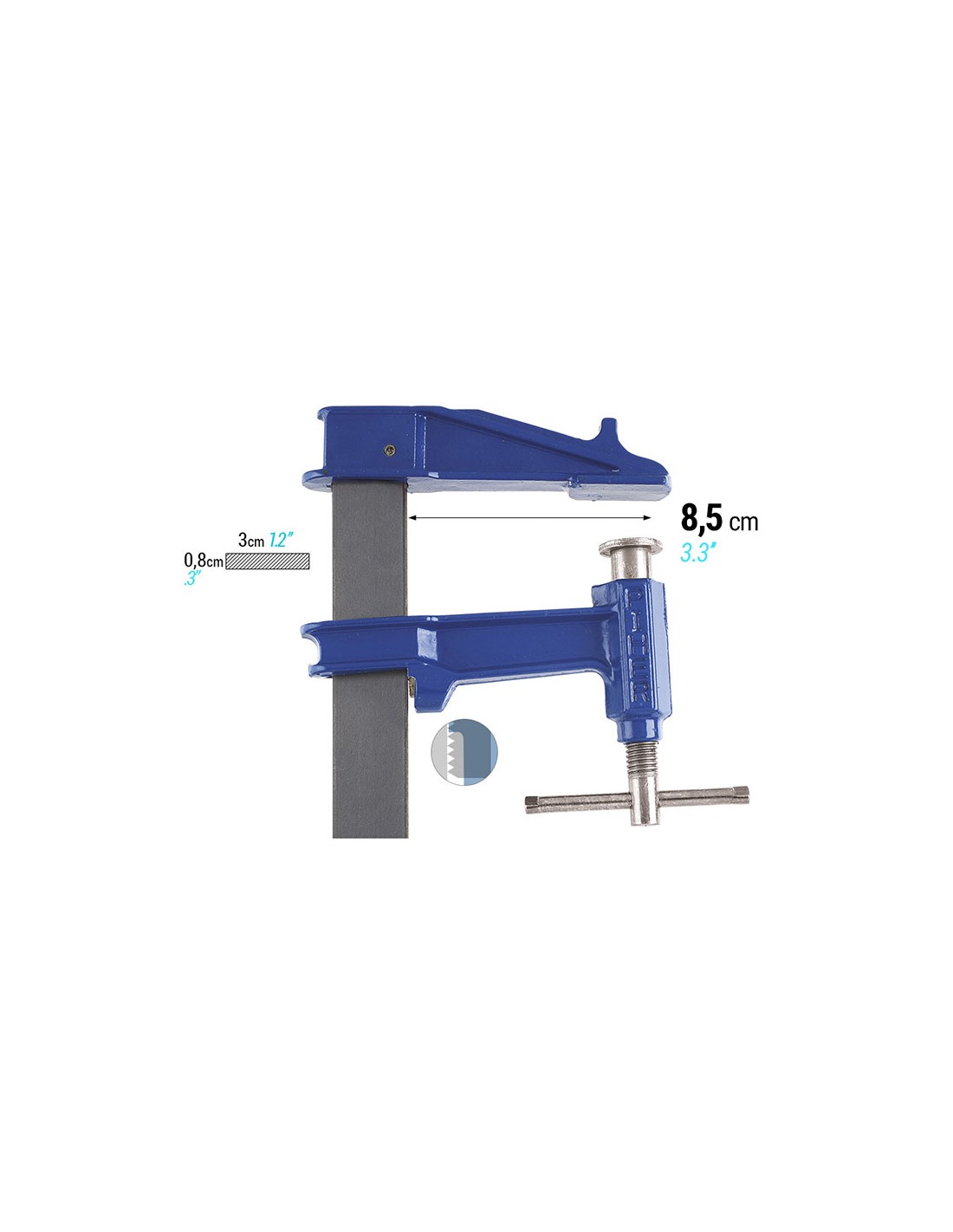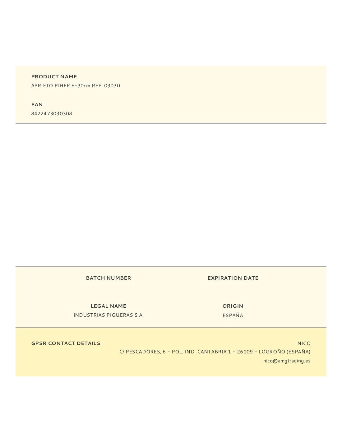 Aprieto piher e-30cm ref. 03030. aprieto modelo e con alcance de 8,5 cm. y llanta de 30 x 8 mm. fuerza máxima de 900 kg. llanta de acero laminado de alta resistencia. freno antideslizante en cabeza móvil. peso:1,80 kg. medidas: 31 x 17 x 3,5 cm