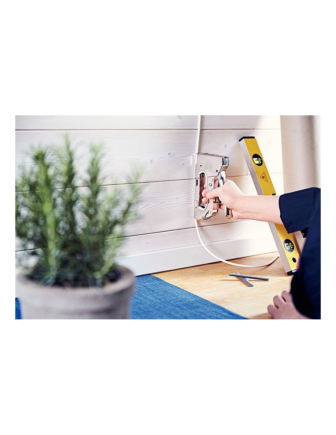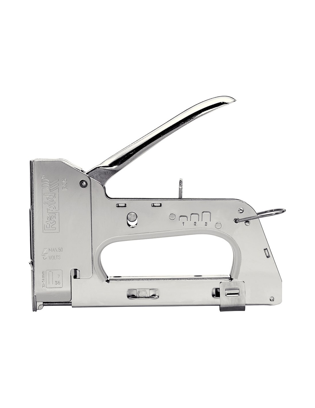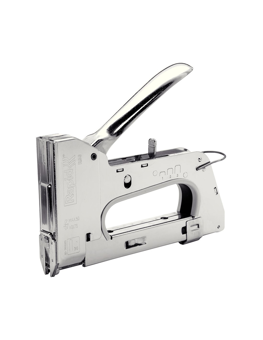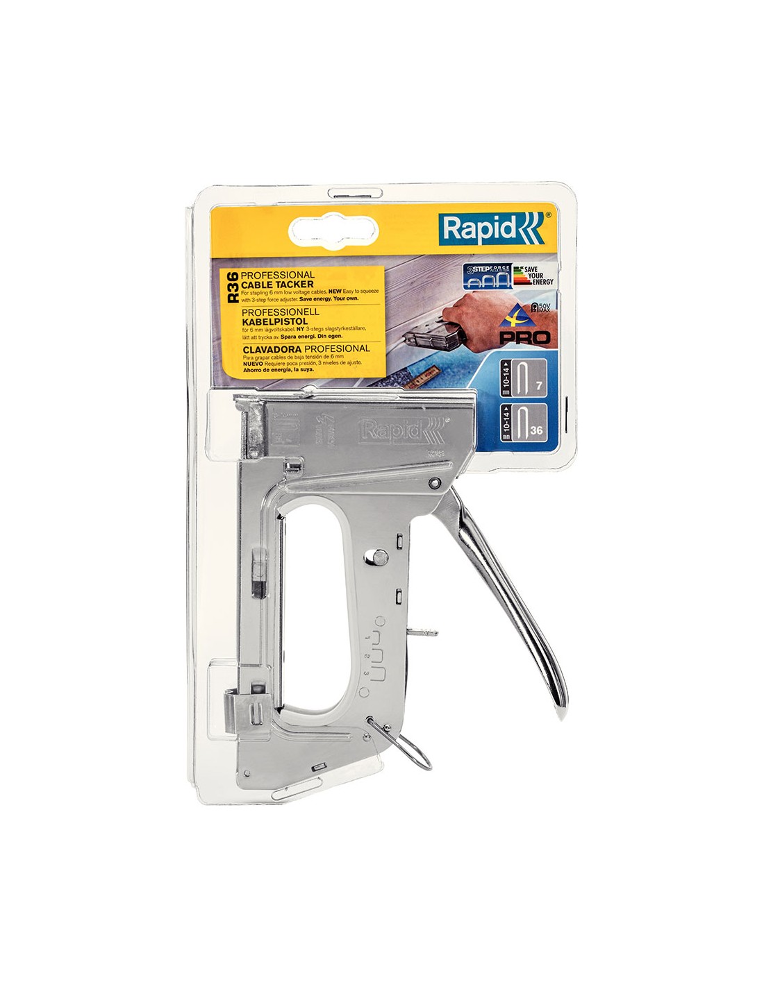 Grapadora para cable r36. clavadora superior para trabajos profesionales exigentes diversos y operaciones de precisión. especialmente diseñada para cables de baja tensión hasta ø6mm, tales como altavoces y cables de alarma. cubierta y piezas internas sujetas a desgaste completamente en acero. sistema de carga de funcionamiento suave y mecanismo sin retroceso. empuñadura ergonómica con función de cierre para un almacenaje fácil. 12,2x2,6x28cm