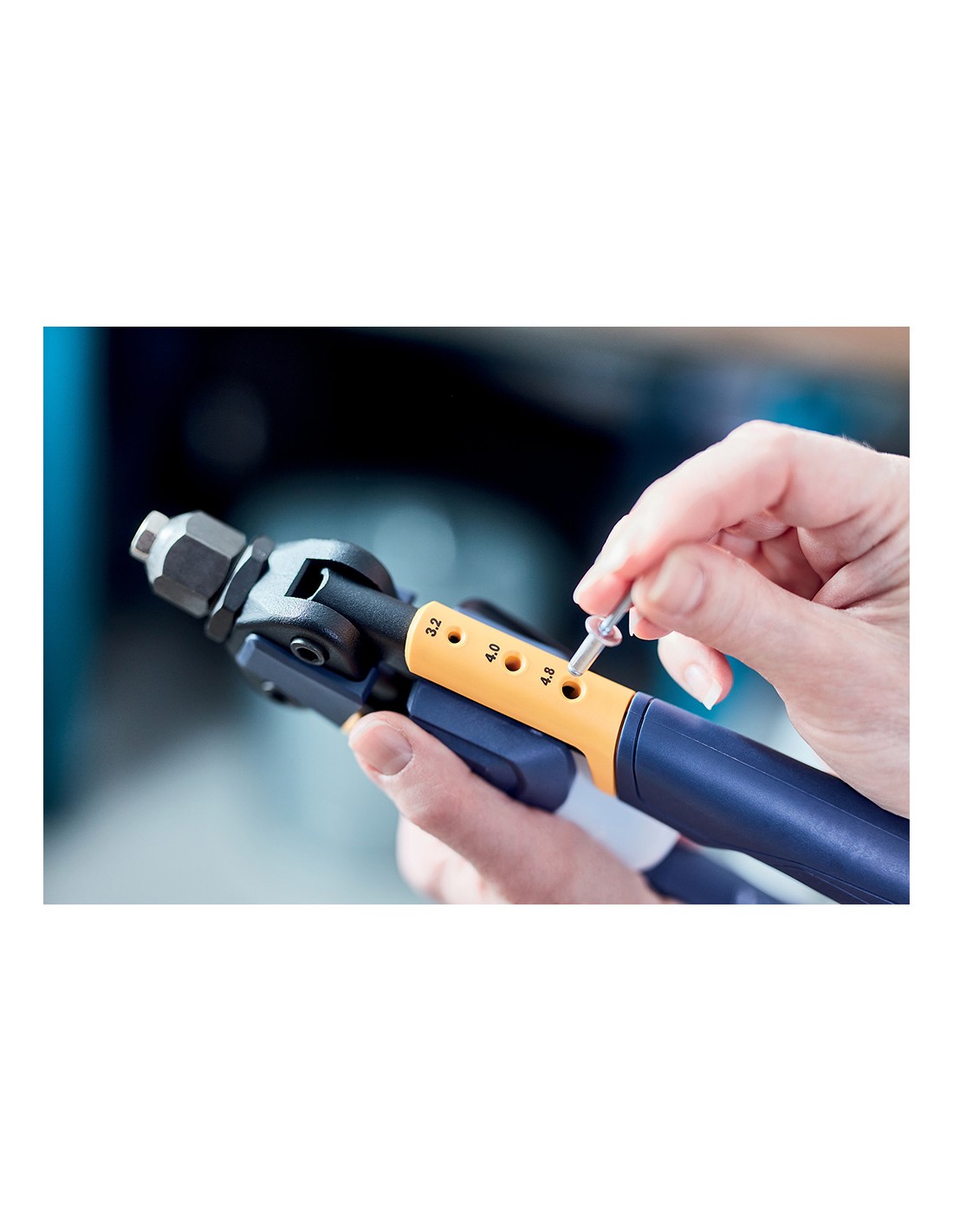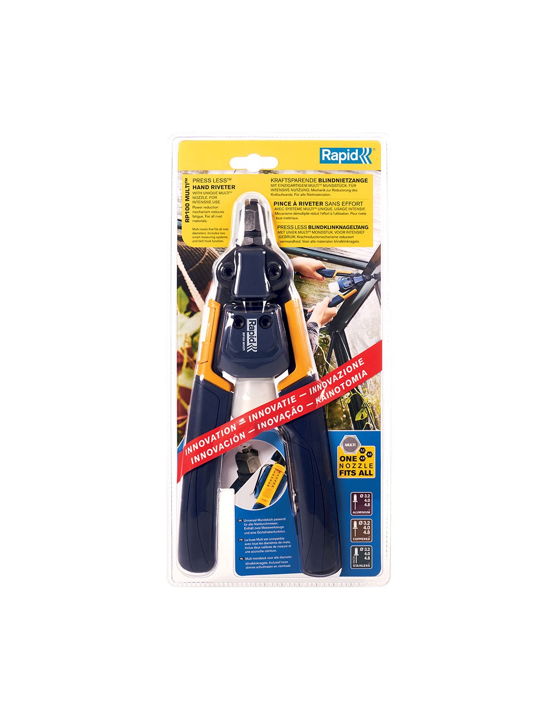 Remachadora manual rp100 profesional multi. remachadoras fáciles de usar, potentes y resistentes, adecuadas para todo tipo de trabajos de chapa y reparaciones. la tecnología de reducción de potencia y su mango cómodo y ergonómico hacen que la rp100 multi sea especialmente útil en proyectos de gran envergadura, ya que puede trabajar durante más tiempo y clavar muchos remaches sin fatiga muscular. con su exclusiva boquilla multitm, puede cambiar rápidamente de tamaño de remache sin cambiar de boquilla. 17,5x4,5x35cm