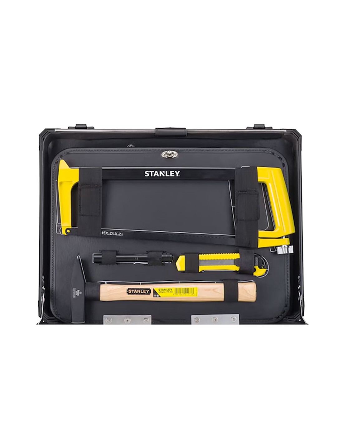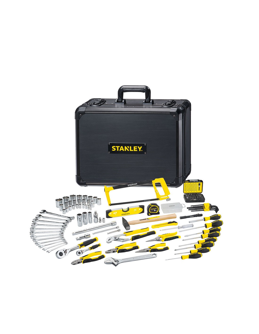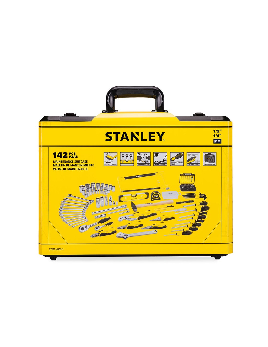 Kit de mantenimiento con maletín de aluminio 142 piezas stmt98109-1 stanley. maletín de aluminio. material ligero para facilitar el transporte, máxima durabilidad para todos lo tipos de entorno. interior inteligente. tres paneles interiores equipados con elásticos para sujetar las herramientas, sistema de bloqueo del panel pleglable y base con espuma bicolor recortada. cierres metálicos y asa de transporte de alta durabilidad.