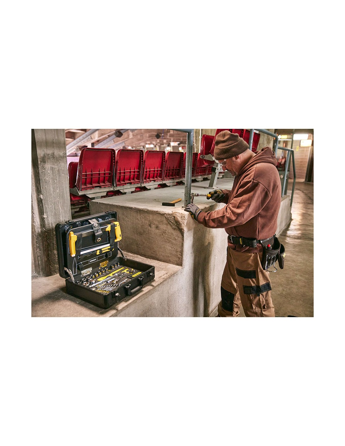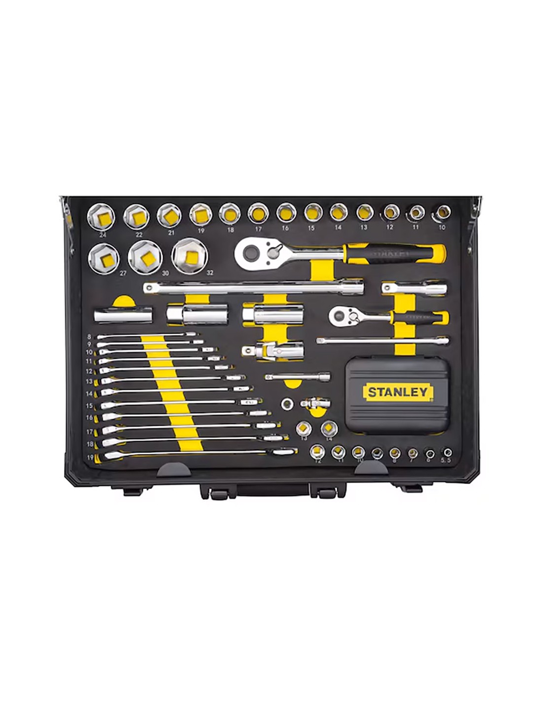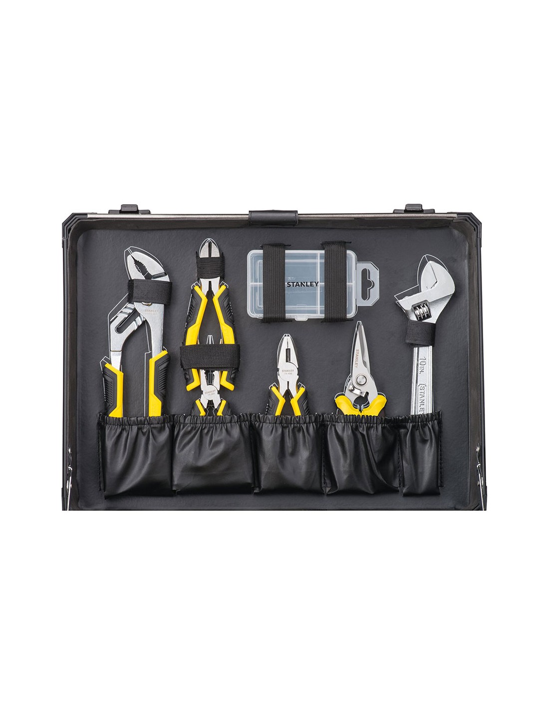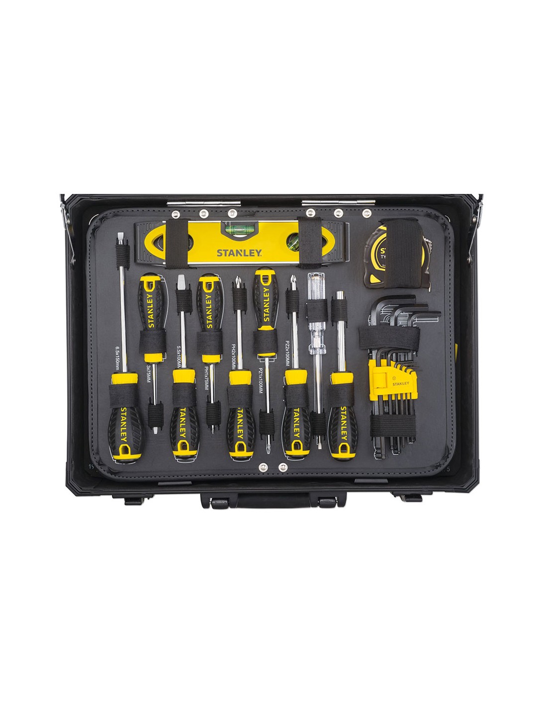 Kit de mantenimiento con maletín de aluminio 142 piezas stmt98109-1 stanley. maletín de aluminio. material ligero para facilitar el transporte, máxima durabilidad para todos lo tipos de entorno. interior inteligente. tres paneles interiores equipados con elásticos para sujetar las herramientas, sistema de bloqueo del panel pleglable y base con espuma bicolor recortada. cierres metálicos y asa de transporte de alta durabilidad.