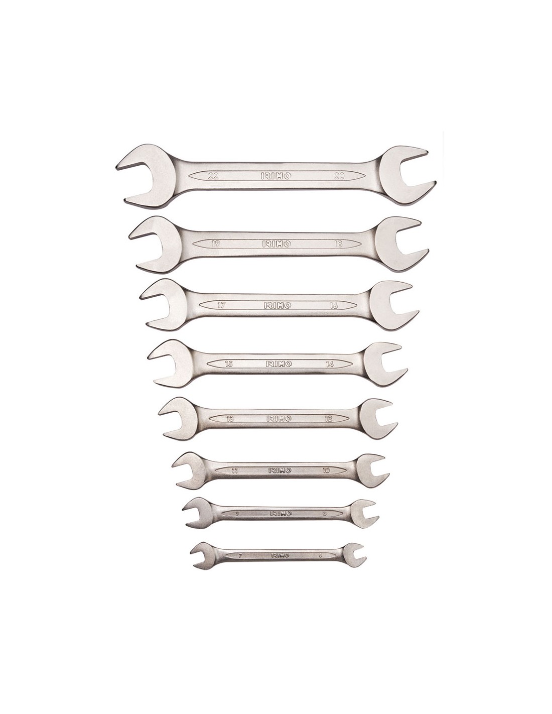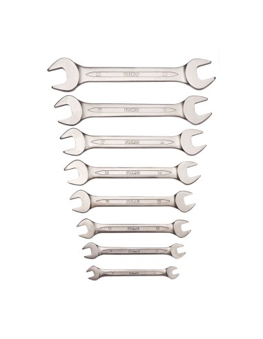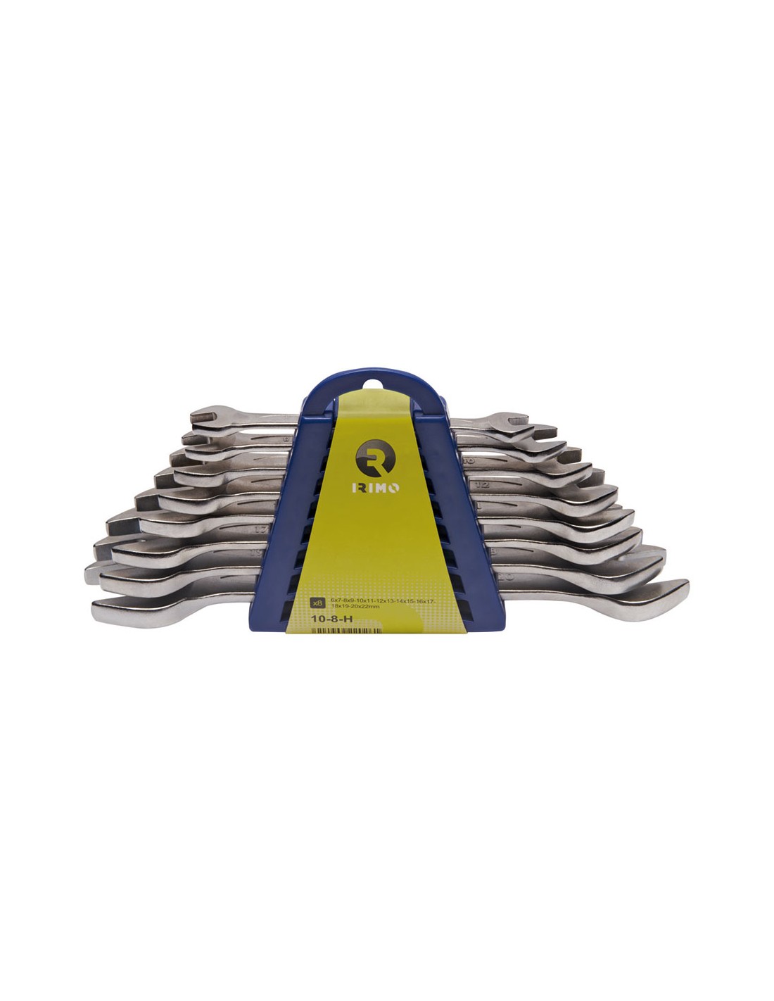 Juego de 8 llaves fijas 6-22mm 10-8-h. juego de 8piezas con soporte de plástico. componentes: llaves fijas de 6×7 a 20×22mm. acabado: cromado mate. material: aleación de acero de alto rendimiento. dureza: 42-50hrc. normas: iso10102.
