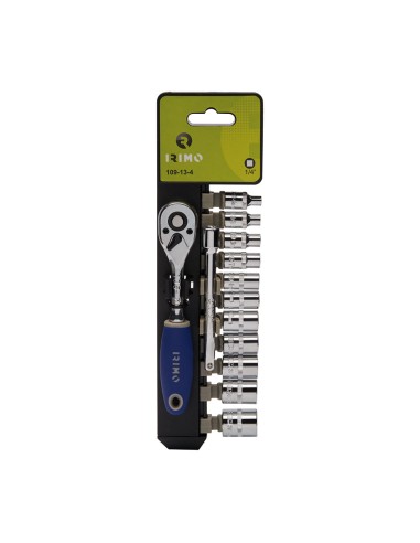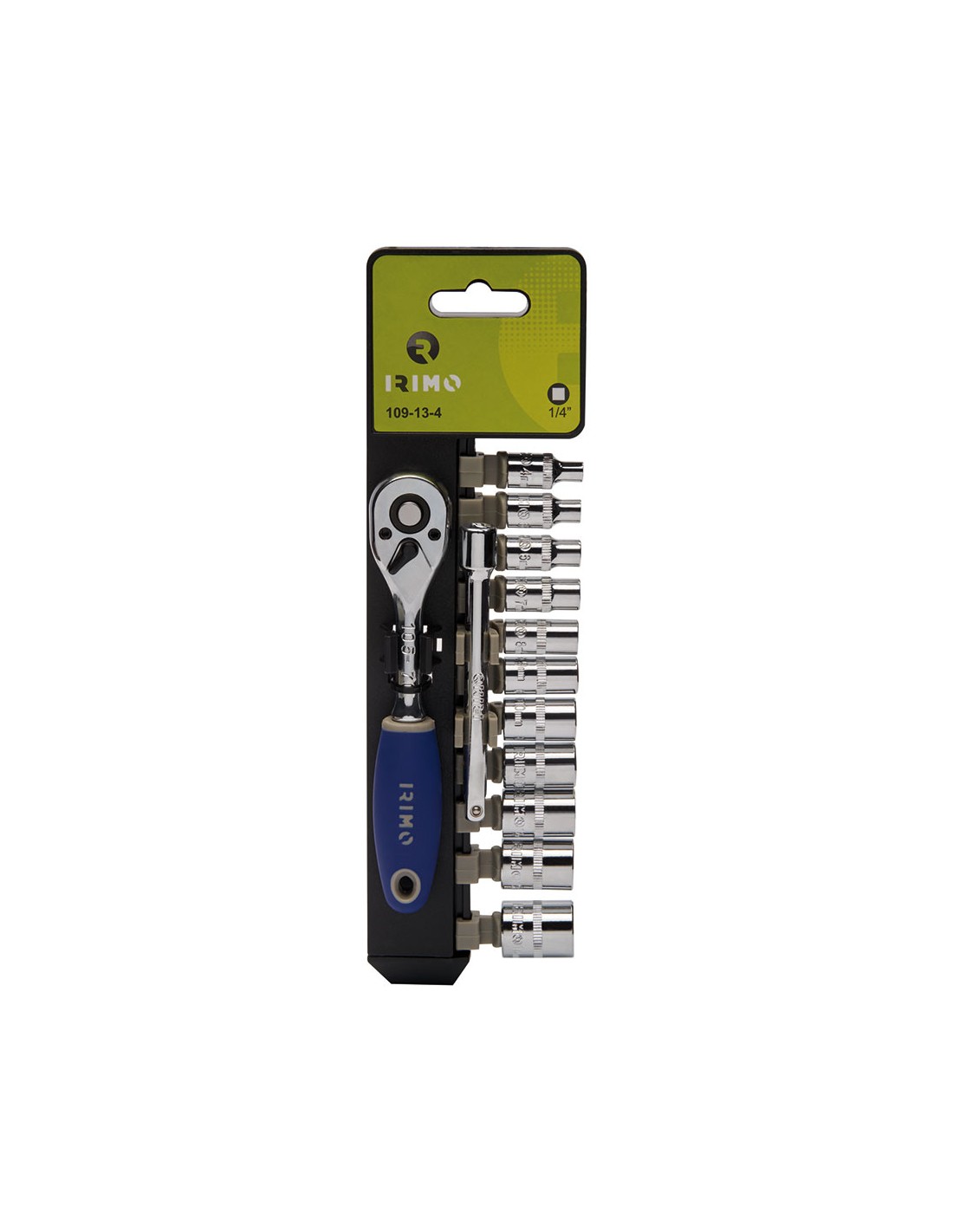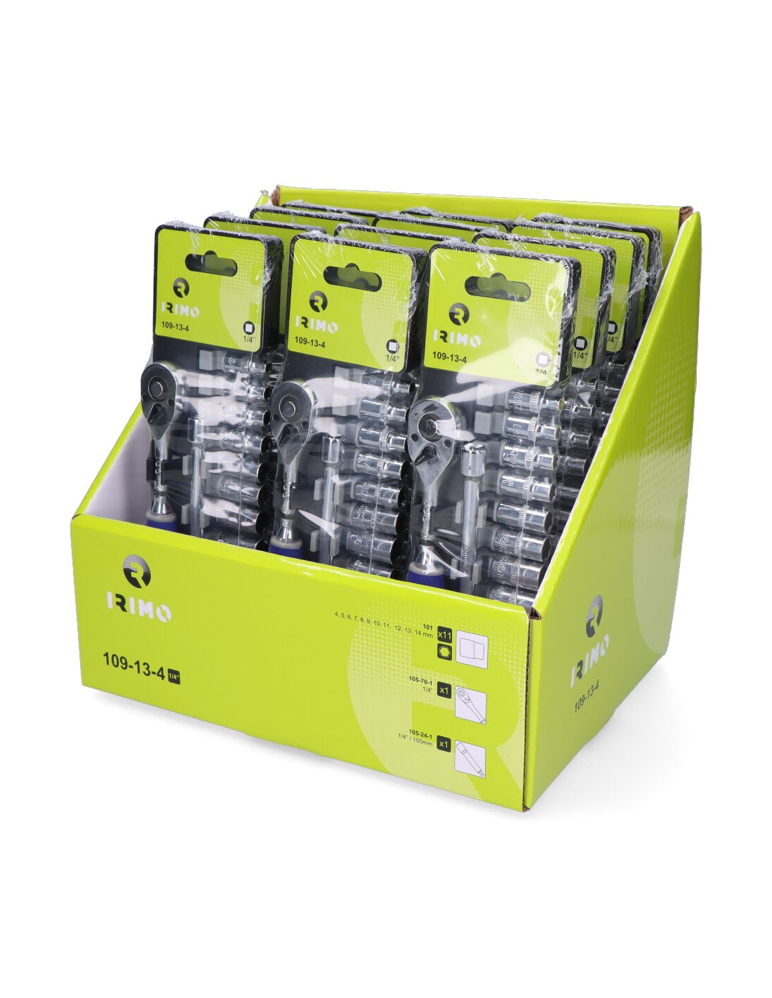Juego de carraca 1/4", vasos y alargador, 13 piezas 109-13-4. juego de vasos de 1/4" en expositor. juego de 11vasos+carraca+alargador. vasos hexagonales en dimensiones métricas. acabado cromado brillante. el expositor incluye 12juegos. din 3120, din 3124 y din 3122."
