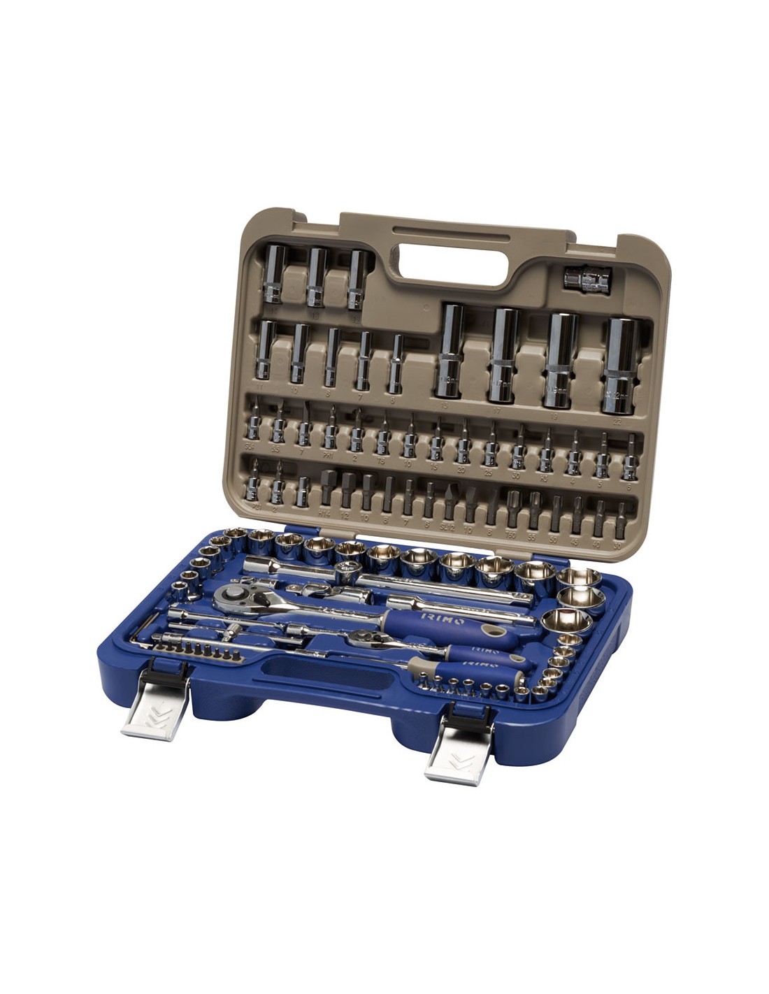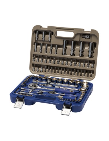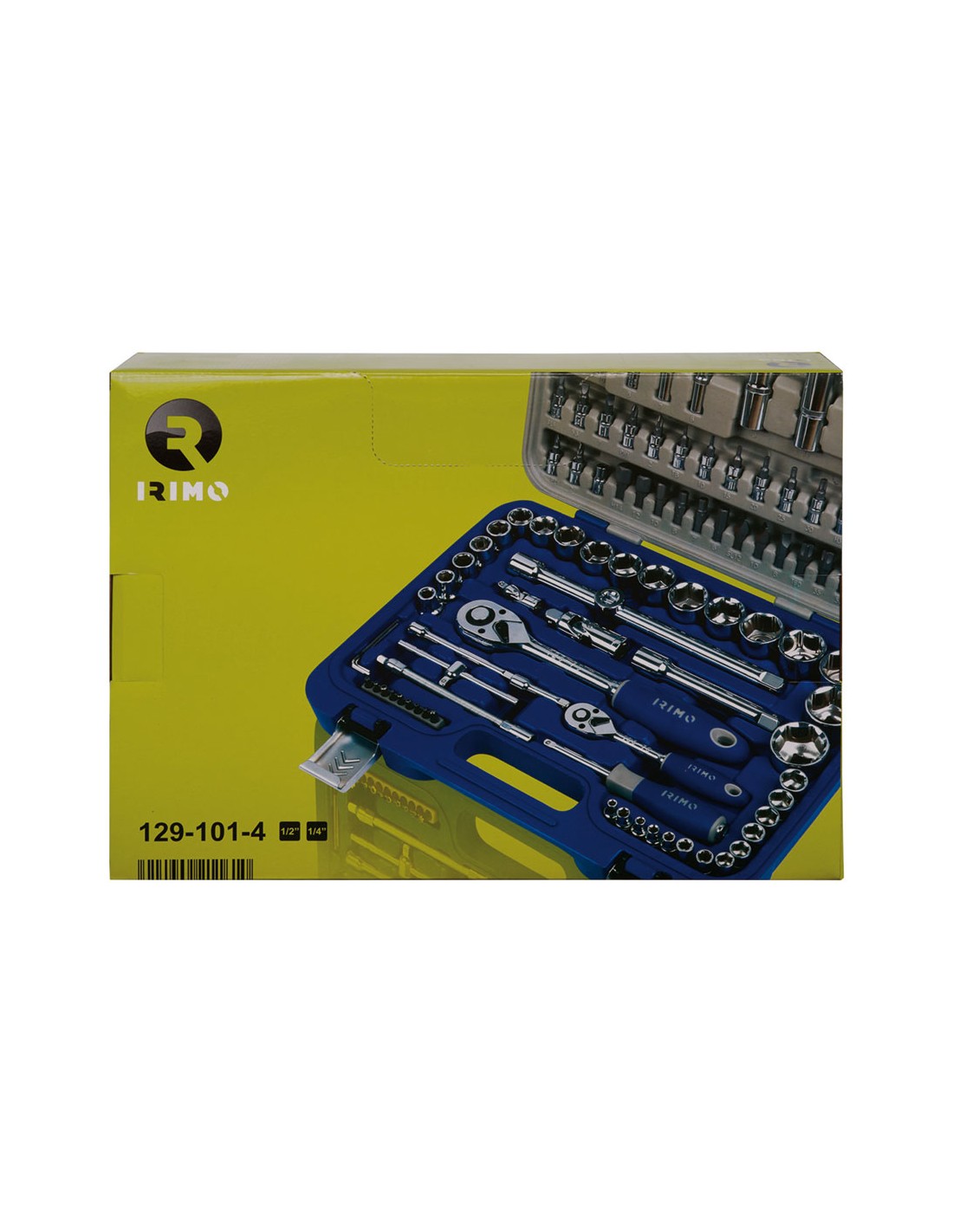Juego carraca ½ y ¼ pulg, vasos hexagonales, 101 piezas 129-101-4. vasos hexagonales en dimensiones métricas. aleación de acero al cromo vanadio. acabado cromado brillante. caja de polietileno de alta densidad. caja con cierres de metal. normas: din3120, din3124 y din3122.