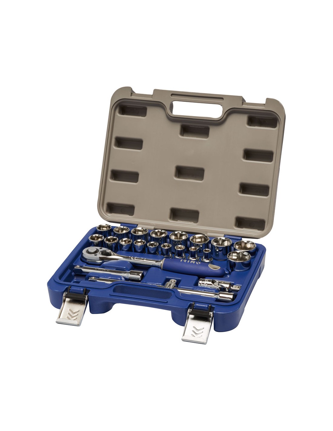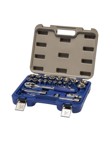 Juego carraca 1/2", vasos hexagonales (8-32mm), 23 piezas 129-23-4. juego de 23 vasos. vasos hexagonales en dimensiones métricas. aleación de acero al cromo vanadio. acabado cromado brillante. caja de polietileno de alta densidad. caja con cierres de metal. normas: din3120, din3124 y din3122."