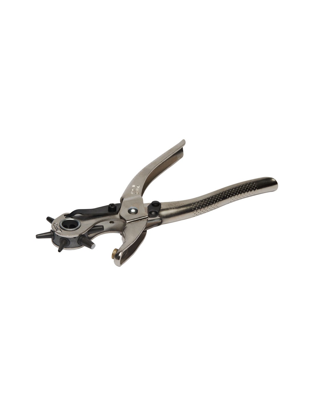 Revolver sacabocados con 6 bocas 2-4,5mm 330021. rueda que gira para perforar agujeros en cuero, goma, plástico, lona, juntas y otros materiales similares. 6tamaños de agujeros, 2-2,5-3-3,5-4-4,5mm. selección sencilla y vista del diámetro del agujero para evitar errores. su diseño exclusivo reduce la fuerza necesaria en un 70%. embalaje industrial.
