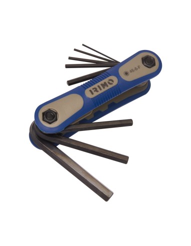 Juego navaja 7 llaves hexagonales pavonadas 1,5-8mm 46-8-f. juego de 8llaves hexagonales en dimensiones métricas. medidas: 1,5, 2,0, 2,5, 3,0, 4,0, 5,0, 6,0 y 8,0mm. el tratamiento con acabado oxidado proporciona una excelente protección de la superficie mayor precisión en la punta. permite trabajar desde varias posiciones diferentes. tope a los 270, generalmente utilizado para giro máximo. estuche de alta calidad resistente a los impactos. en soporte de plástico.