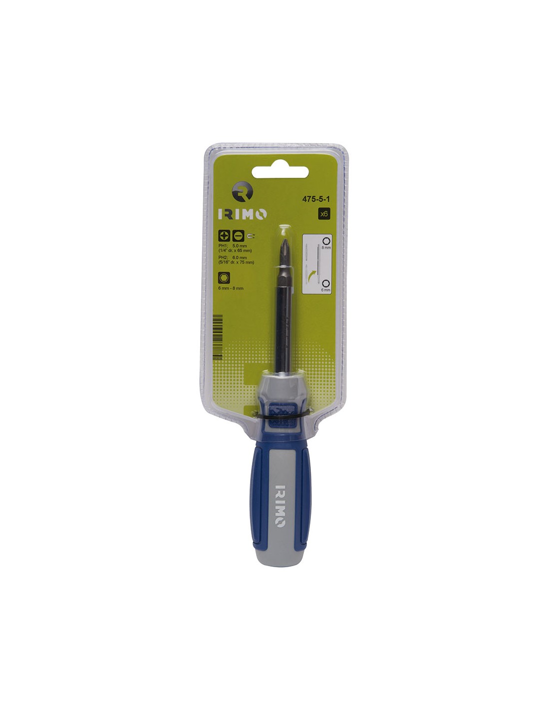 Destornillador 6 en 1 dos puntas reversibles 475-5-1. para tornillos, pernos y tuercas de cabeza phillips, ranurada y hexagonal. puntas de dos bocas (1/4): ph1 5,0mm. puntas de dos bocas (5/16"): ph2 6,0mm. adaptador: 6 y 8mm. puntas imantadas. mango bi-componente que garantiza la máxima comodidad. aleación de acero de alto rendimiento. acabado pulido con arena. en blíster."