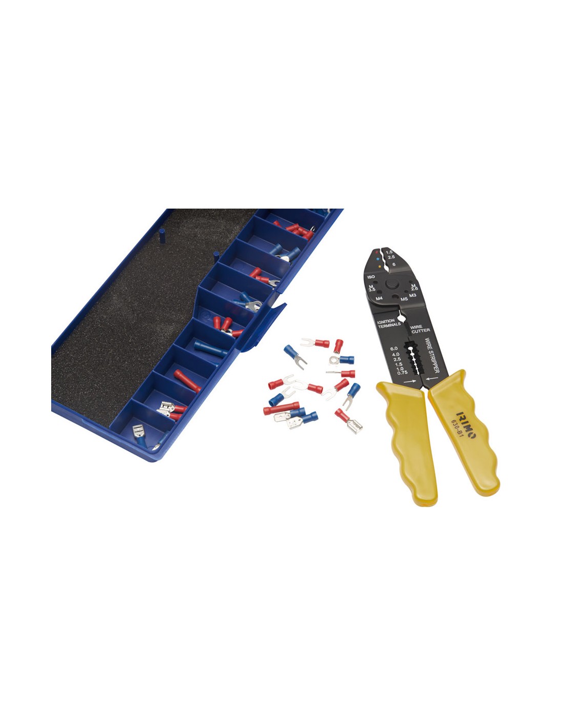 Juego de alicates para engastado con terminales aislados. incluye los alicates para engastado 630-b1-1 y 60 terminales aislados. adecuado paraoperaciones de engastado/corte/pelado. engaste de terminales: 1,5/2,5/6mm. corte: m2,6-m5,0. pelado: 0,75-6,0mm. mangos: amarillos de plástico monomaterial. acabado: pavonado con tratamiento anticorrosión. material: lámina de acero grueso con áreas de trabajo templadas