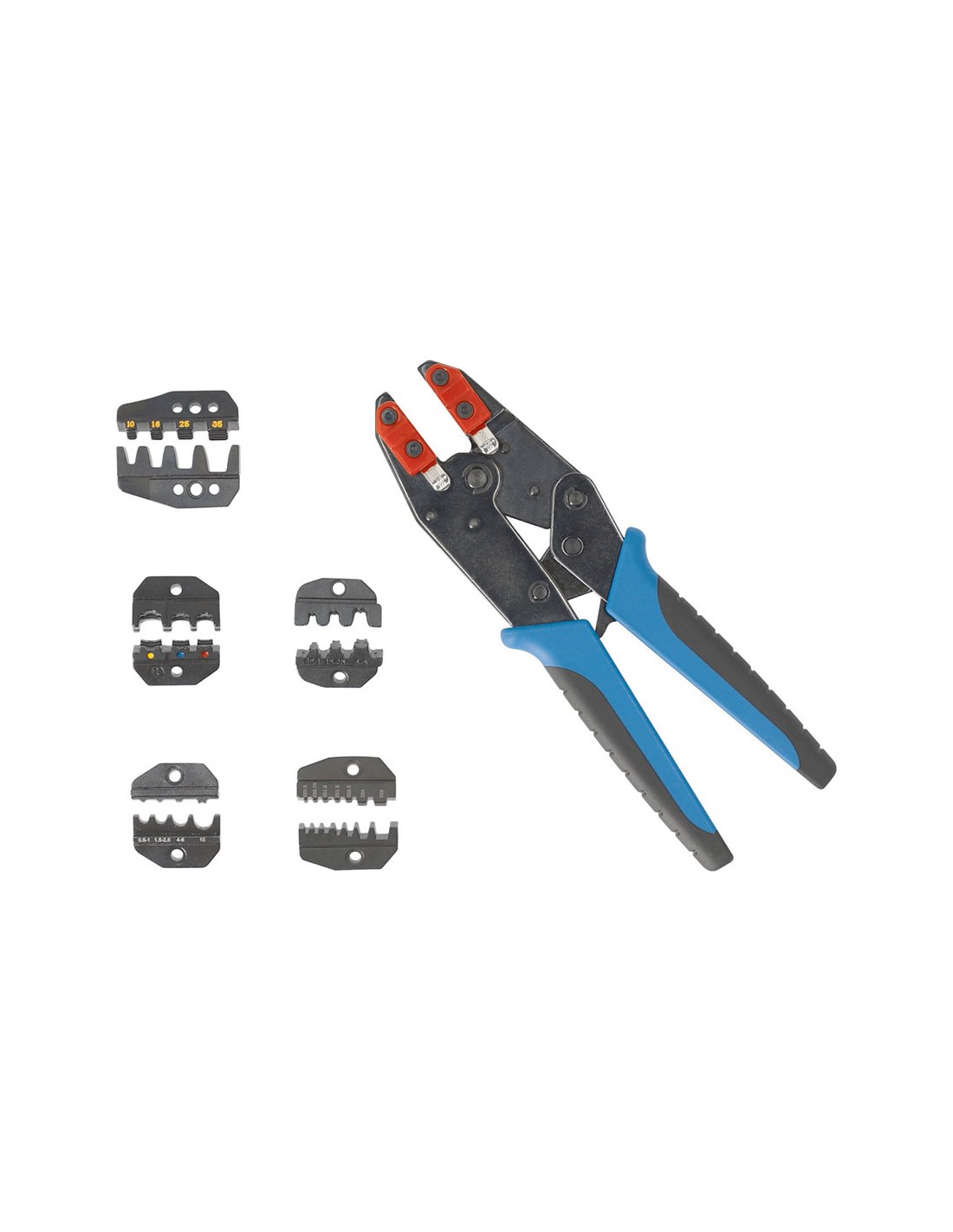 Alicate para engastar con 5 bocas intercambiables. cabeza para terminales de barril abierto no aislados 0.5-6mm/awg 22-106 cabeza para terminales aislados 0.5-6 mm/awg 22-10 cabeza para terminales de cable gemelo no aislados 6-16mm/awg 10-6 cabeza para terminales de cable 4-35mm/awg 10-35 cabeza para terminales no aislados 0.5-10mm/awg 22-8 caja de plástico moldeado