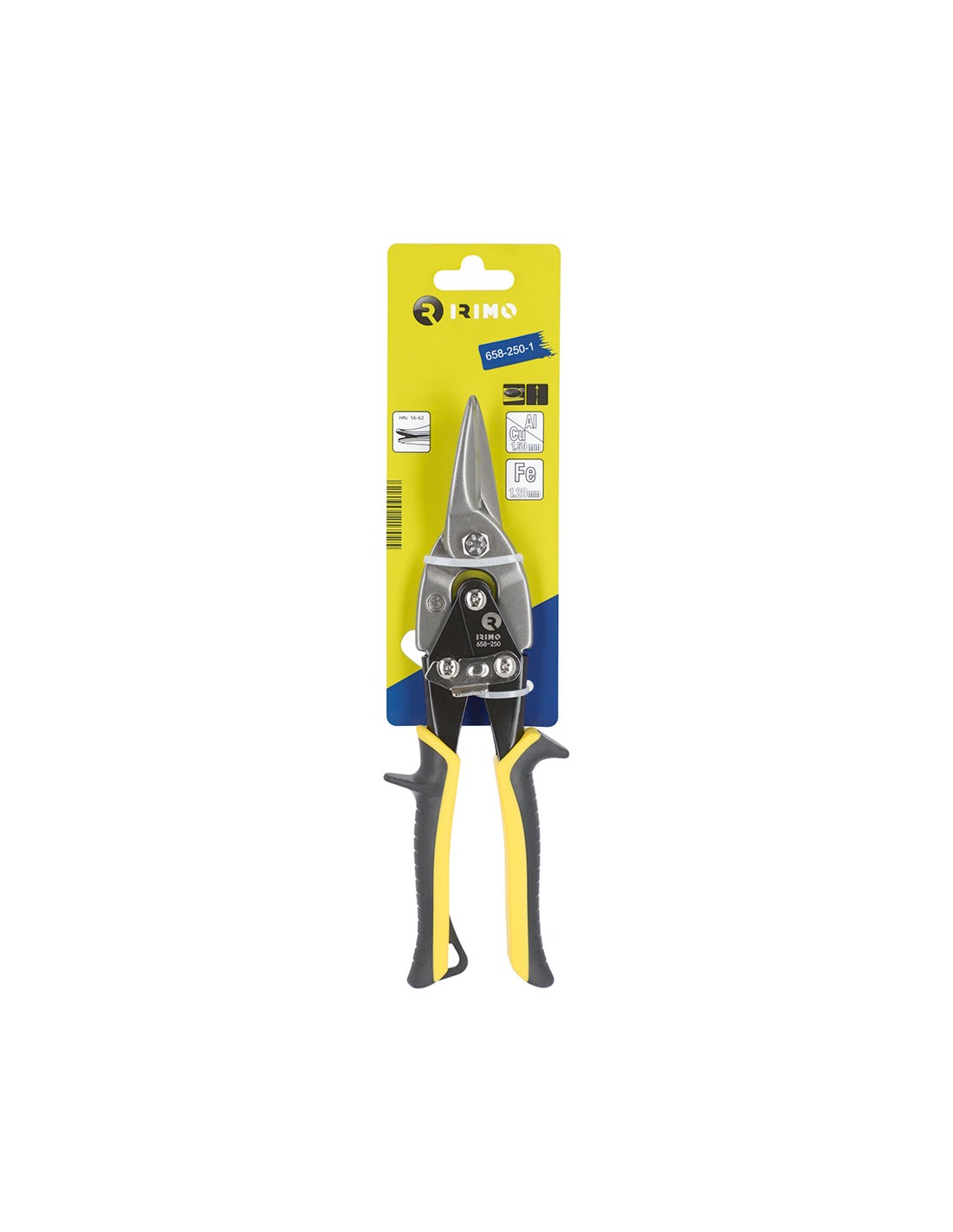 Tijera para chapa articulada cortante recta 250 mm. acero de cromo molibdeno forjado para mayor resistencia. el sistema de palanca incrementa su eficiencia. mangos con una zona de agarre suave y con muelle de retorno para aumentar la comodidad durante el trabajo. mangos amarillos: corte recto. capacidad de corte: 1 acero inoxidable, 2 acero laminado en frío. 658421-1: juego de piezas de repuesto con tuerca, muelle y husillo