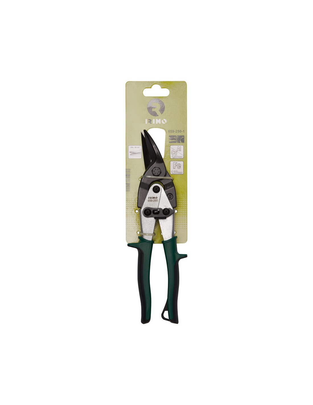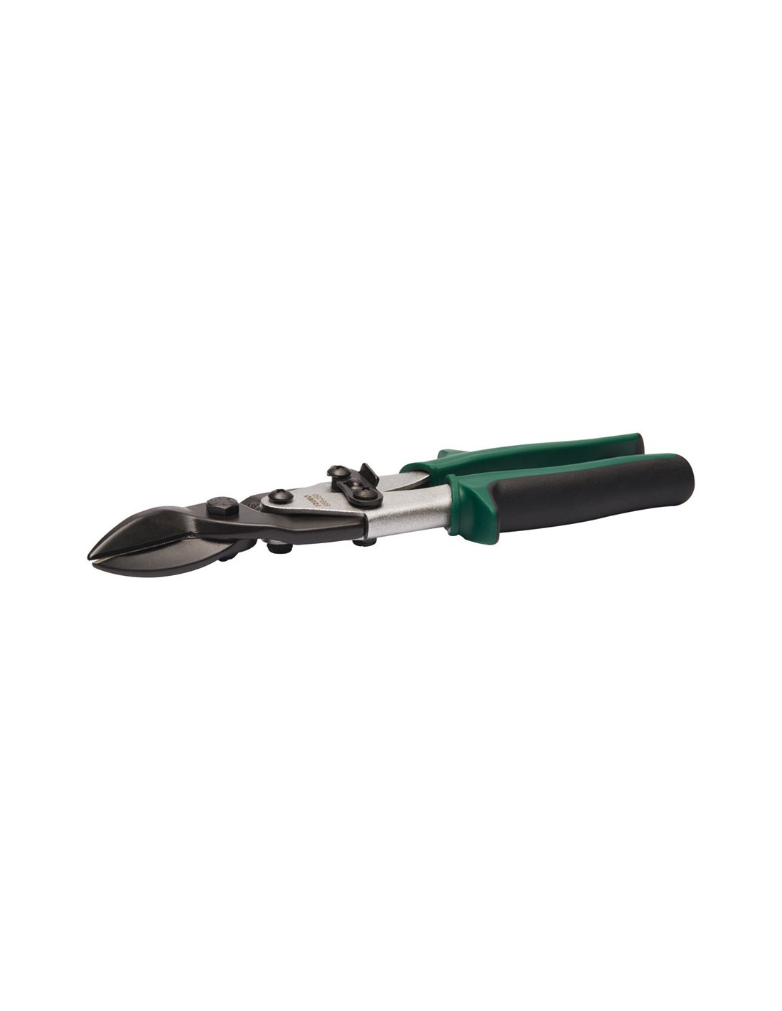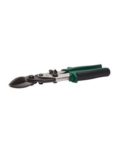 Tijera para chapa articulada cortante derecha, 250 mm. acero de cromo molibdeno forjado para mayor resistencia. el sistema de palanca incrementa su eficiencia. mangos con una zona de agarre suave y con muelle de retorno para aumentar la comodidad durante el trabajo. mangos verdes: corte a derechas. capacidad de corte: 1 acero inoxidable, 2 acero laminado en frío. 658421-1: juego de piezas de repuesto con tuerca, muelle y husillo