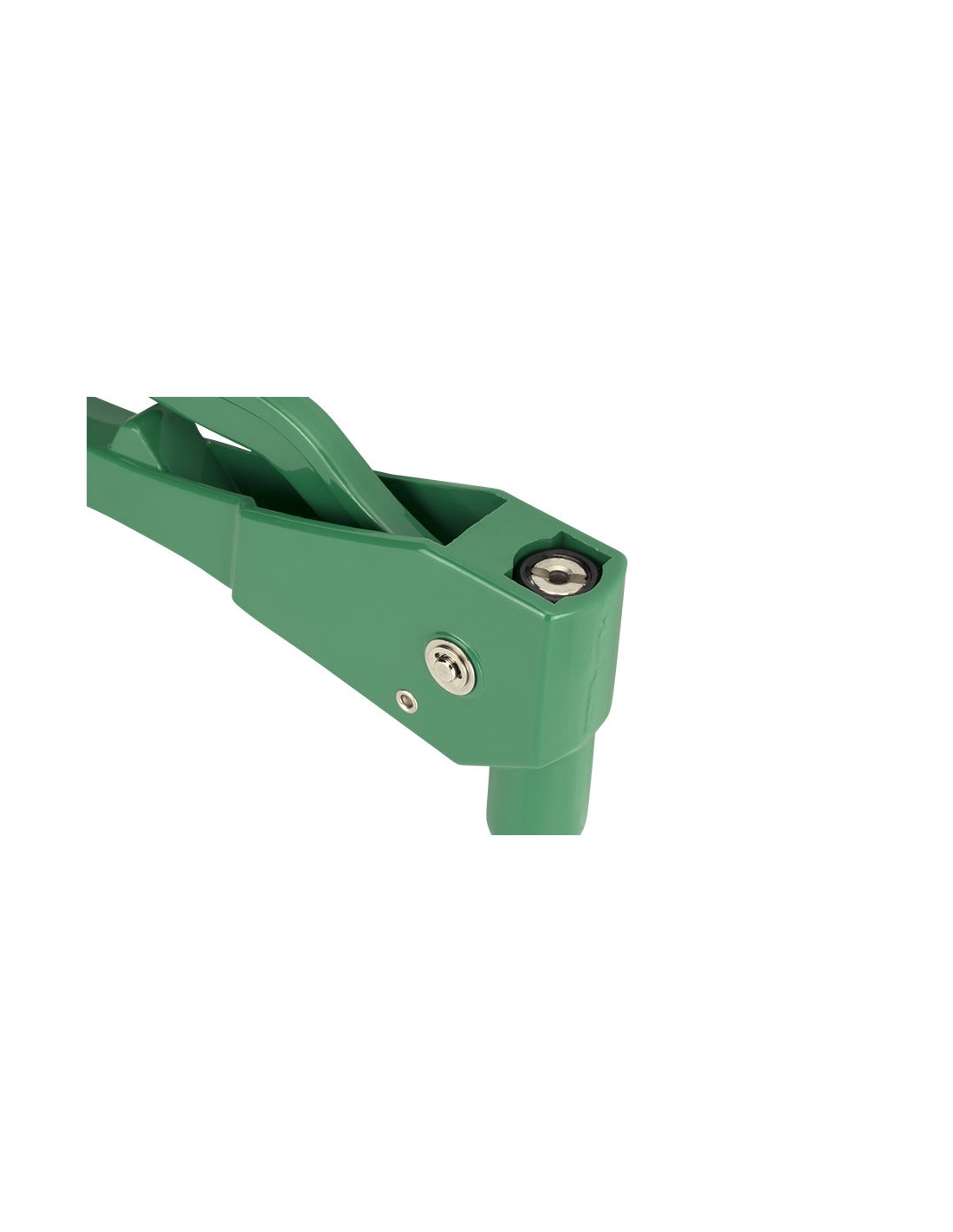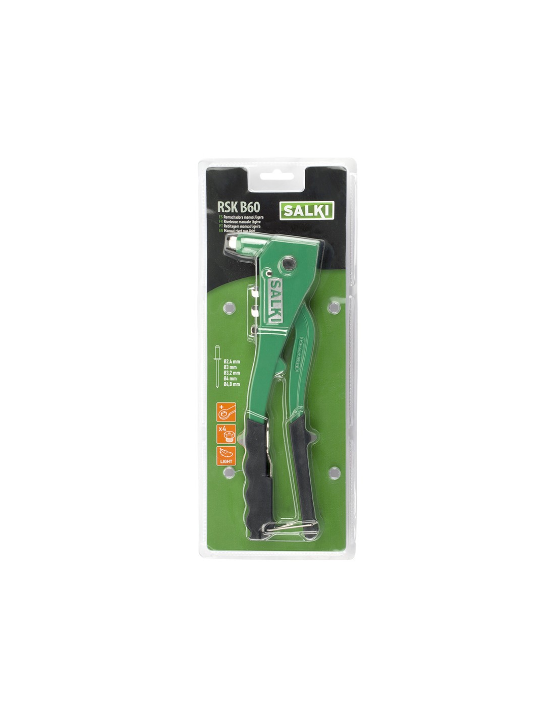 Remachadora b60 hobby manual ligera. consumible: ø2,4 - 3,2 - 4 - 4,8. carcasa: chapa de acero. características: palanca equipada con resorte de apertura. mecanismo automático y seguro de expulsióndel vástago. incluye: mordazas intercambiables, llave de montaje y gancho cierre de seguridad
