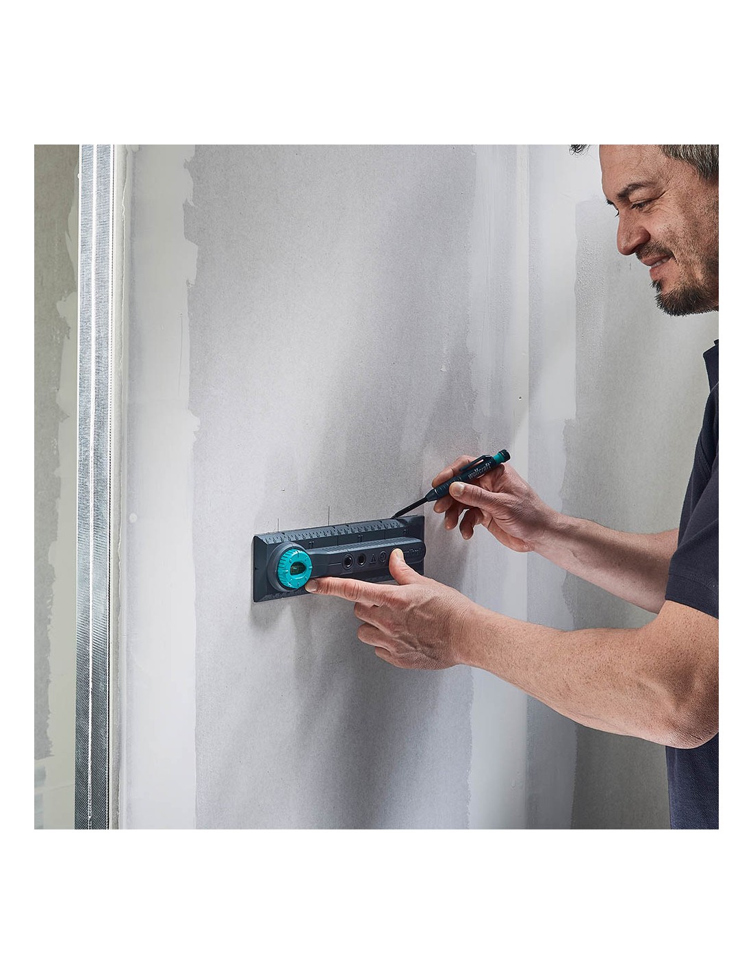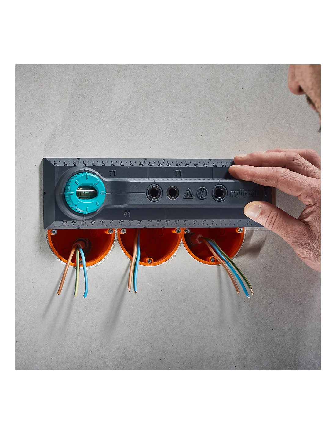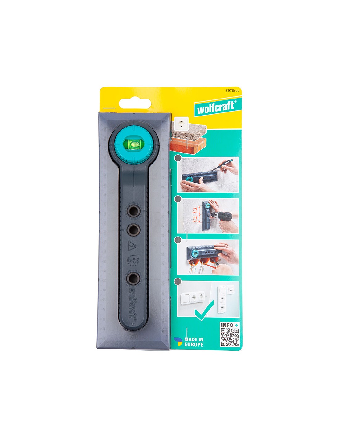 Plantilla de perforación electricidad, para medidas de 71 y 91mm.plantilla para marcar, alinear y taladrar para la instalación de interruptores y cajas de enchufe en paredes de ladrillo.nivel de burbuja con giro de 90° para una alineación horizontal y vertical de la plantilla de marcado preciso de la posición del taladro y para alinear las cajas de instalación y los insertos. marcas de 71 y 91mm para transferir cómodamente las distancias correctas entre dos cajas de instalación, así como cajas de enchufe y cajas de tv o red. manual de instrucciones paso a paso con ilustraciones para el uso correcto de la plantilla para una instalación cómoda y segura