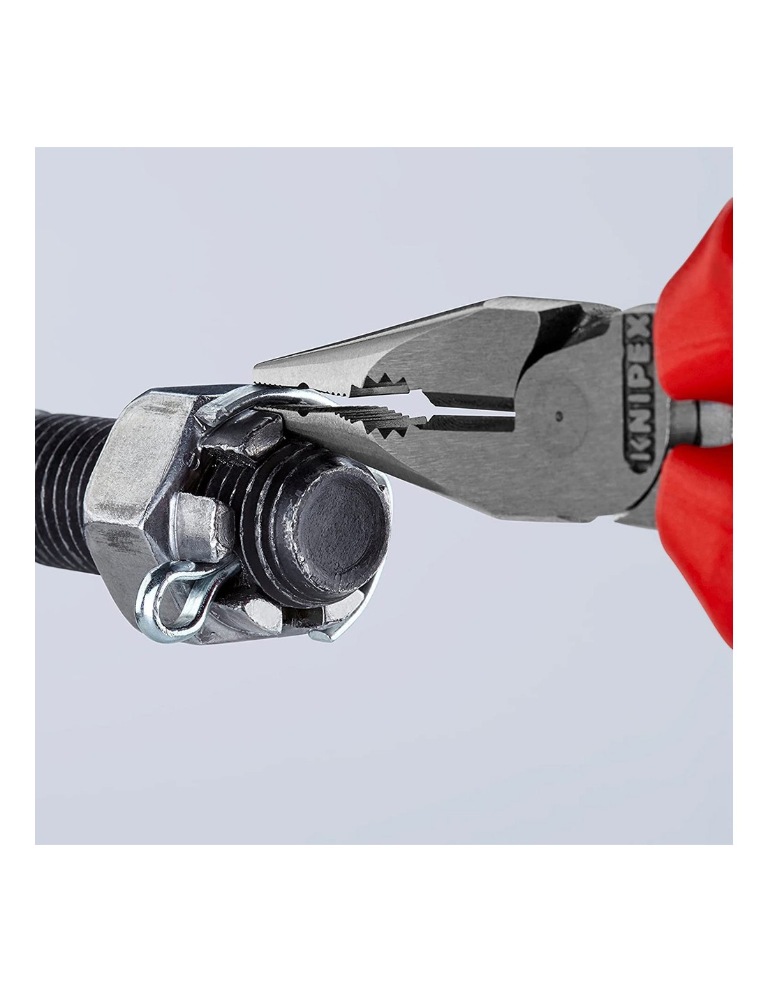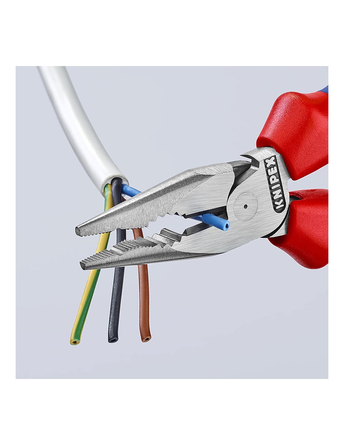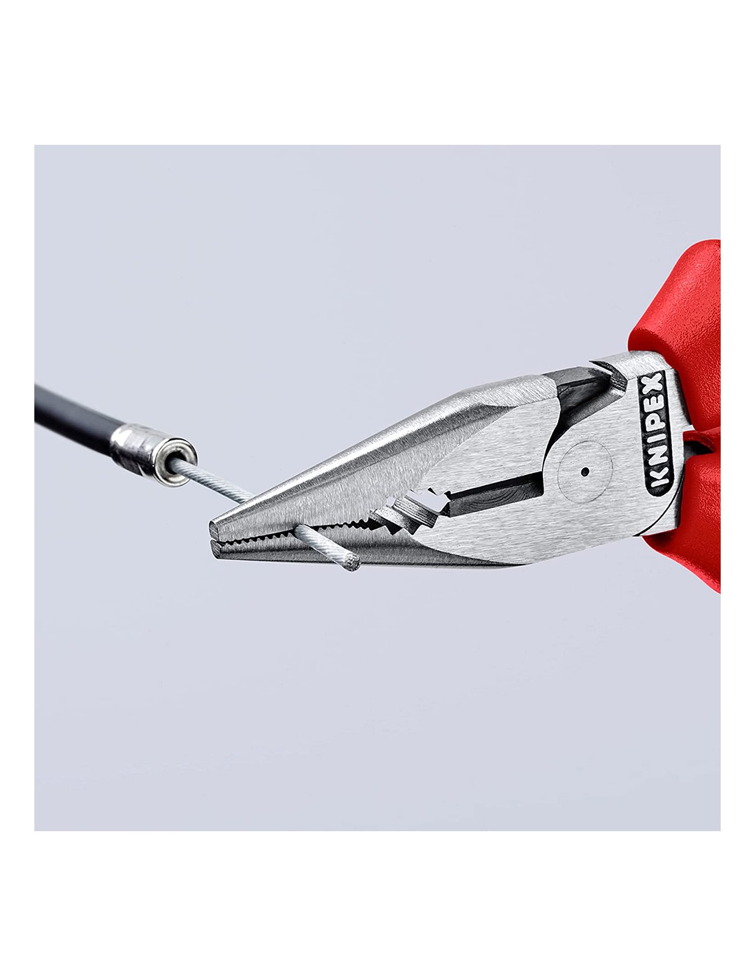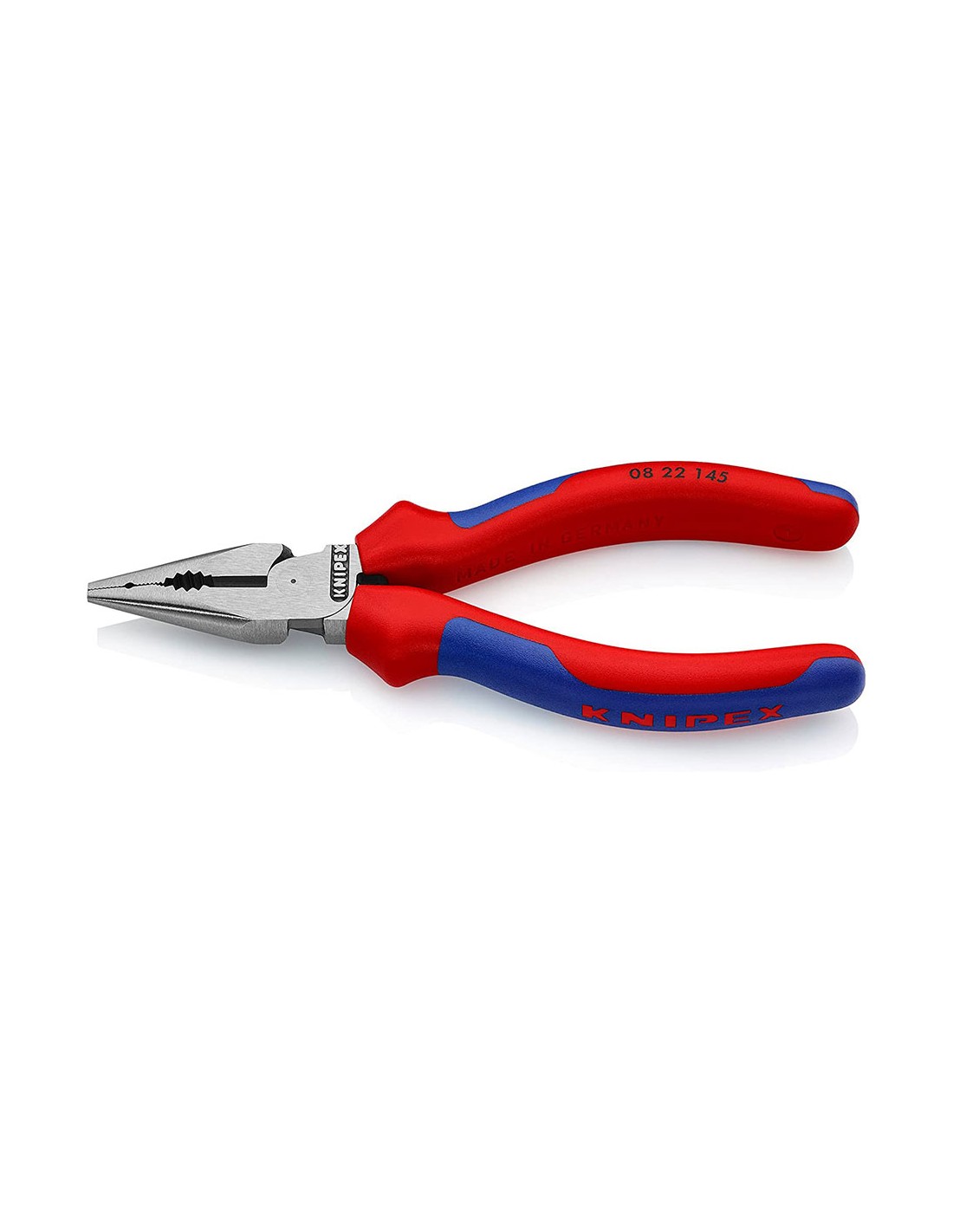 Alicate universal en punta 145mm. para trabajos pesados con las mordazas en punta. para todos los trabajos habituales en instalaciones y reparaciones..práctico para trabajar en zonas de difícil acceso gracias a la forma esbelta de la cabeza con las mordazas que terminan en punta. superficie de agarre con un contorno convexo de un lado para el agarre seguro de piezas planas. la ranura fresada en el área de sujeción permite el soporte y la extracción de pequeñas piezas como clavos, pasadores y pernos. capacidad de corte alambre semiduro ø3,0mm, cable de cobre ø8,0mm-16,0mm.din iso 5746. dimensiones:145x58x18mm