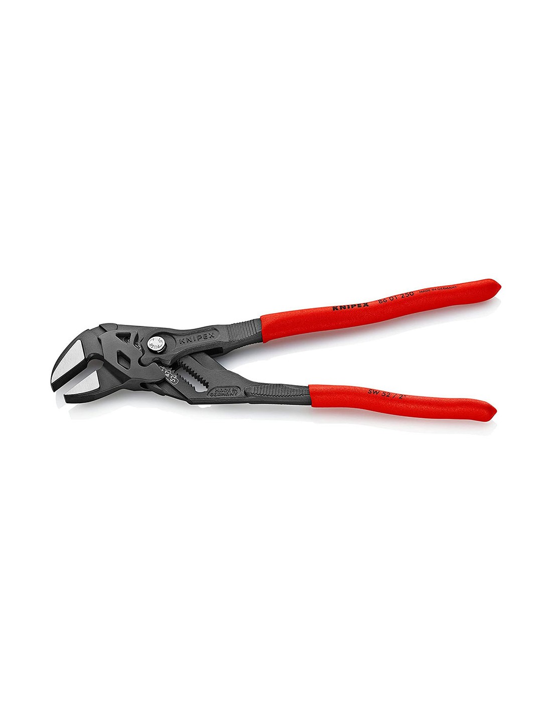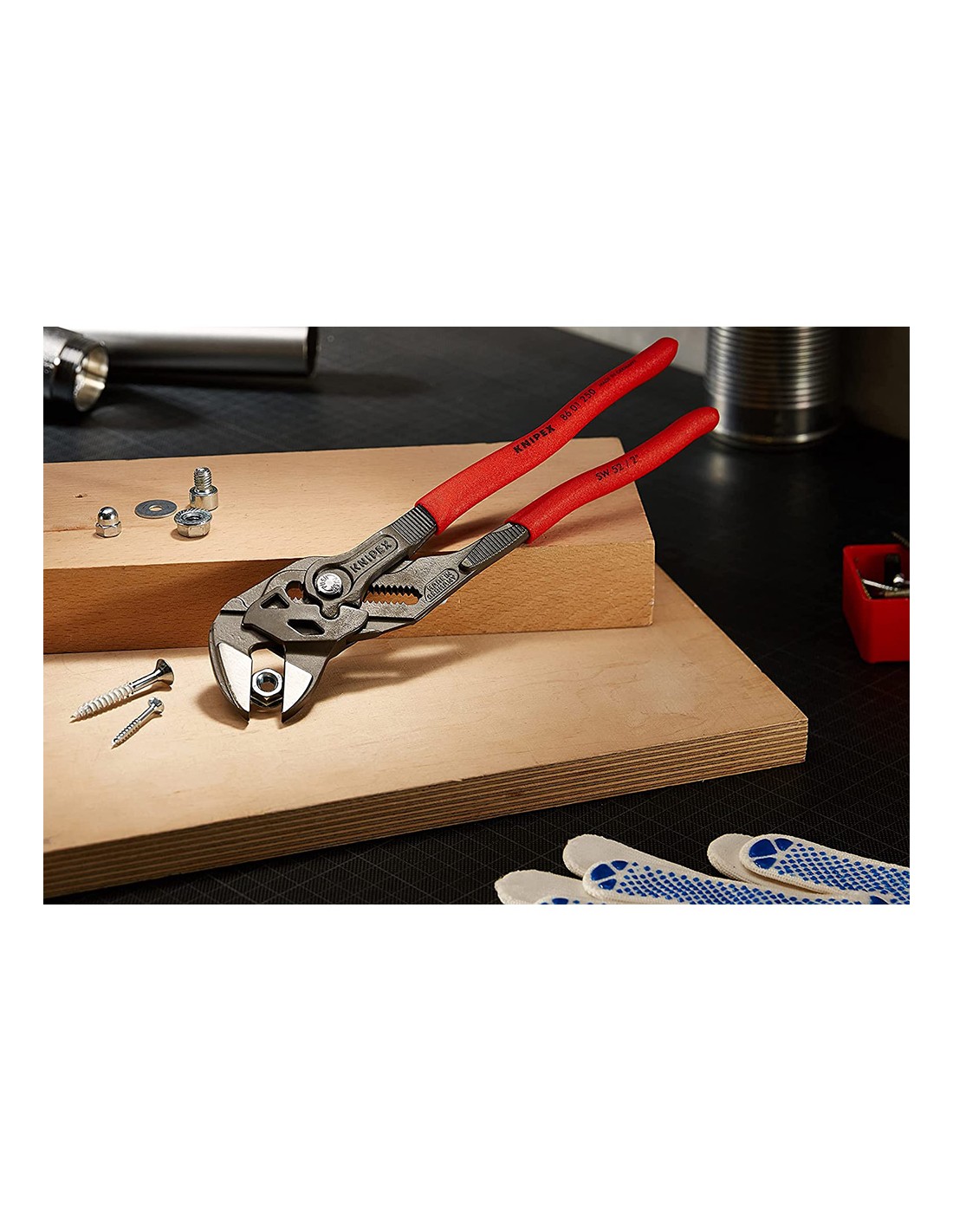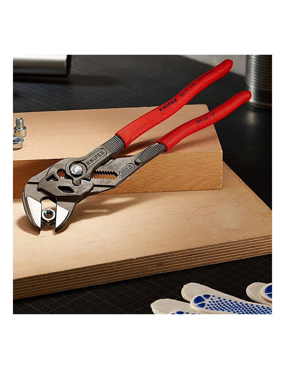 Tenaza llave ajustable 250mm knipex. sustituye a un juego completo de llaves de tuercas, tanto en métrica como en pulgadas. mordazas planas para el cuidadoso montaje de grifos con tratamiento superficial - para trabajar directamente sobre cromo. con escala para ajustar la anchura de boca aparte de la pieza a trabajar. herramienta ajustable para atornillar. muy adecuada también para agarrar, sujetar, prensar y doblar piezas a mecanizar. ajuste automático mediante pulsación de botón directamente en la pieza de trabajo. ajuste perfecto a las caras de las tuercas evitando que estas se redondeen. agarre perfecto gracias a las mordazas paralelas su diseño permite adaptarla a todos los anchos de boca hasta el máximo especificado. recepción segura del perno de articulación: imposible desajustar involuntariamente. el accionamiento entre las mordazas posibilita el ajuste y la liberación rápida de uniones roscadas gracias al efecto carraca. la fuerza ejercida en los mangos se multiplica por 10 en las mordazas, gran capacidad de sujeción