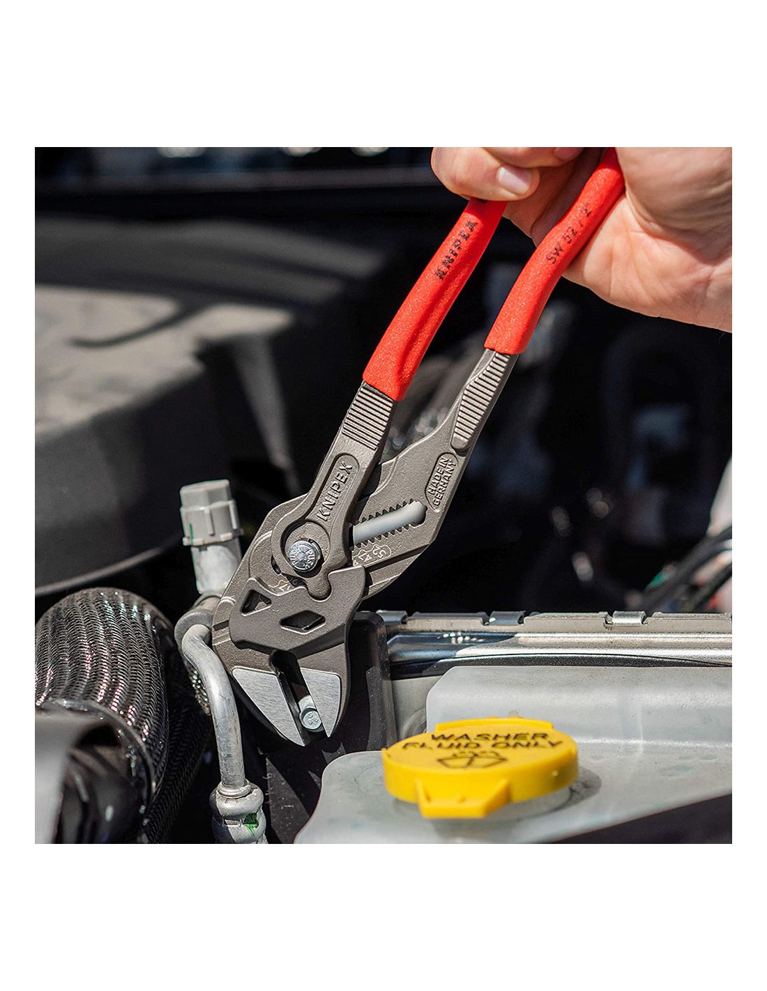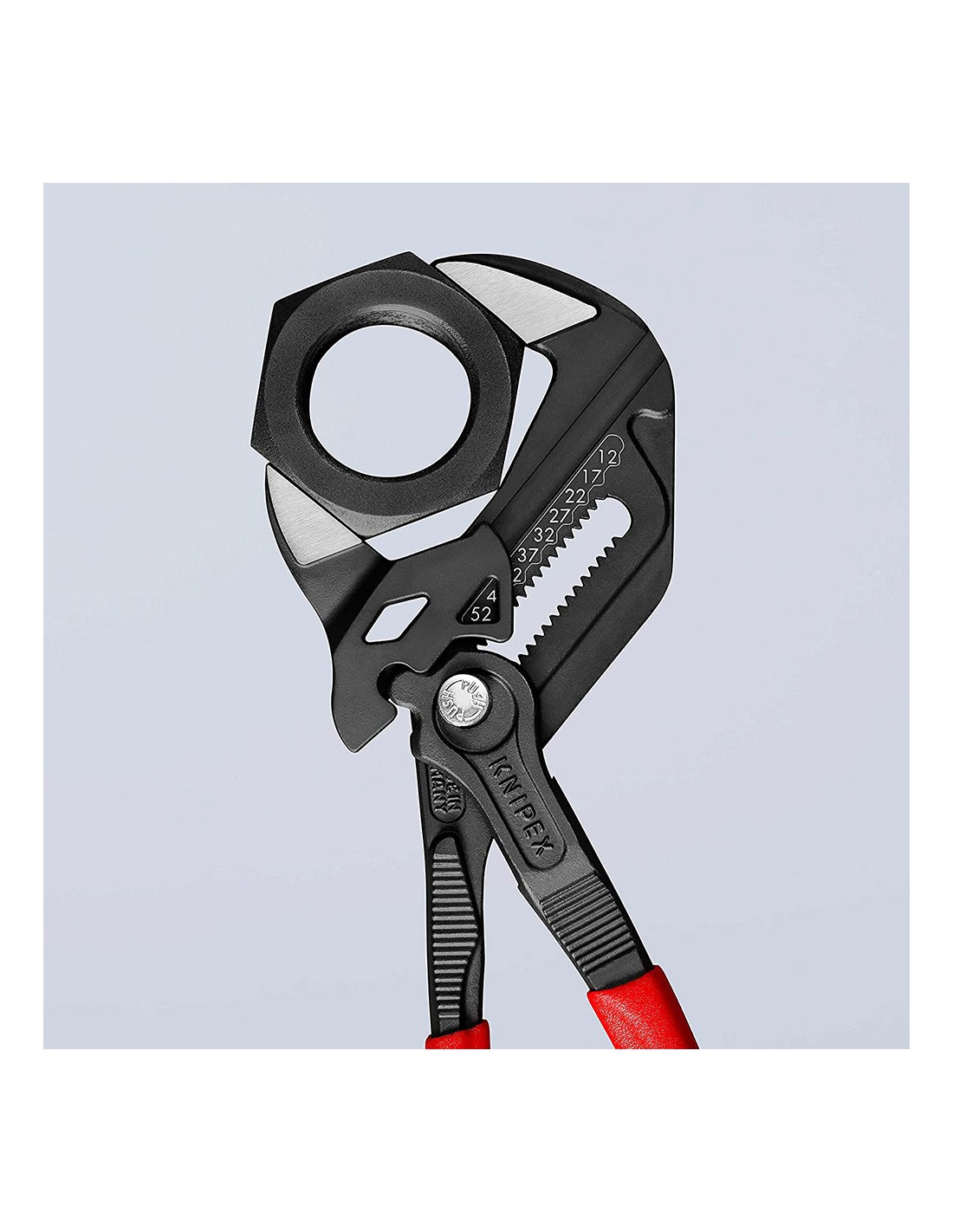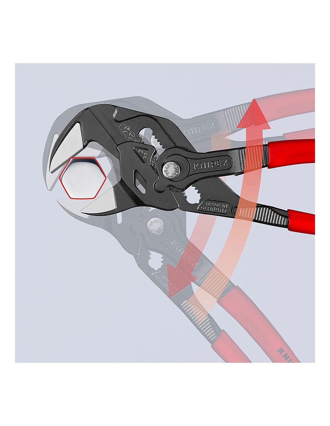 Tenaza llave ajustable 250mm knipex. sustituye a un juego completo de llaves de tuercas, tanto en métrica como en pulgadas. mordazas planas para el cuidadoso montaje de grifos con tratamiento superficial - para trabajar directamente sobre cromo. con escala para ajustar la anchura de boca aparte de la pieza a trabajar. herramienta ajustable para atornillar. muy adecuada también para agarrar, sujetar, prensar y doblar piezas a mecanizar. ajuste automático mediante pulsación de botón directamente en la pieza de trabajo. ajuste perfecto a las caras de las tuercas evitando que estas se redondeen. agarre perfecto gracias a las mordazas paralelas su diseño permite adaptarla a todos los anchos de boca hasta el máximo especificado. recepción segura del perno de articulación: imposible desajustar involuntariamente. el accionamiento entre las mordazas posibilita el ajuste y la liberación rápida de uniones roscadas gracias al efecto carraca. la fuerza ejercida en los mangos se multiplica por 10 en las mordazas, gran capacidad de sujeción