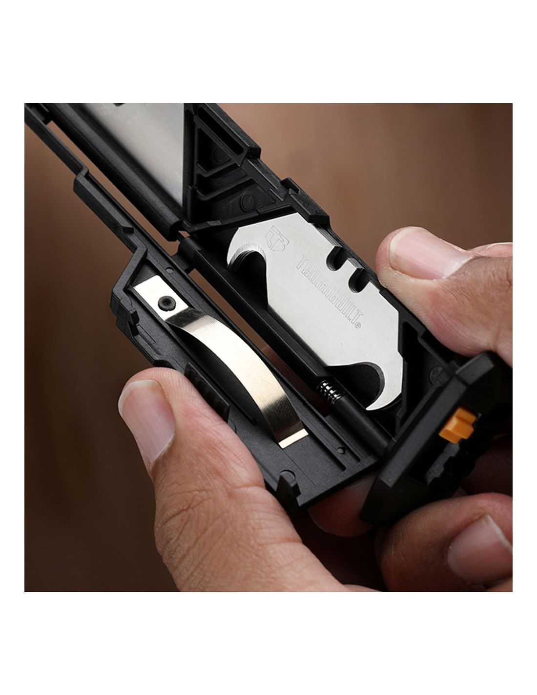 Cúter recargable con 5 + 5 hojas. mecanismo patentado de recarga rápida de cuchillas, recarga un paquete de cuchillas con sólo pulsar un botón. cuchilla multiuso x 1 cargador con 5 cuchillas. cuchilla gancho x 1 cargador con 5 cuchillas. cada cargador incluye 5 cuchillas desechables de doble corte. cargador extraible