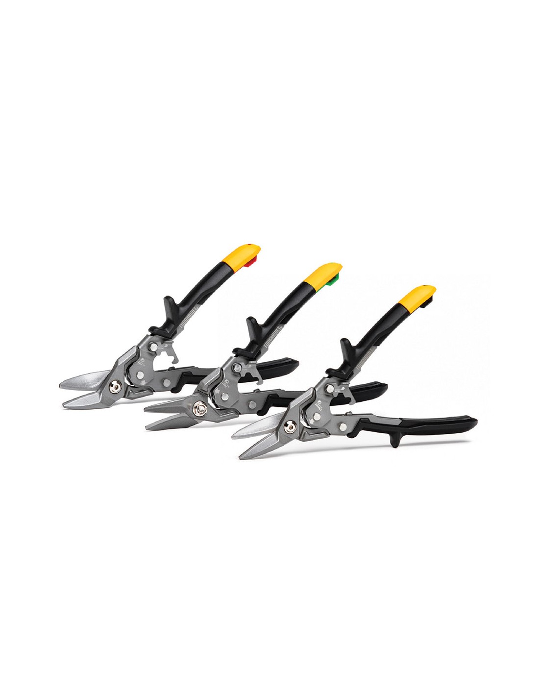Juego de 3 piezas tijeras cortachapa (corte izquierdas, derechas y recto) corta acero inoxidable hasta calibre 22 y acero laminado en frío hasta calibre 18. dos posiciones de corte: con agarre hacia atrás para aplicar mayor fuerza. y con agarre hacia adelante para obtener mayor control. hojas forjadas con filo de corte endurecido por inducción para realizar hasta 10 veces más cortes. operación de bloqueo con una sola mano. agujero para cordón. mecanismo de resorte para lograr un corte rápido y sin esfuerzo