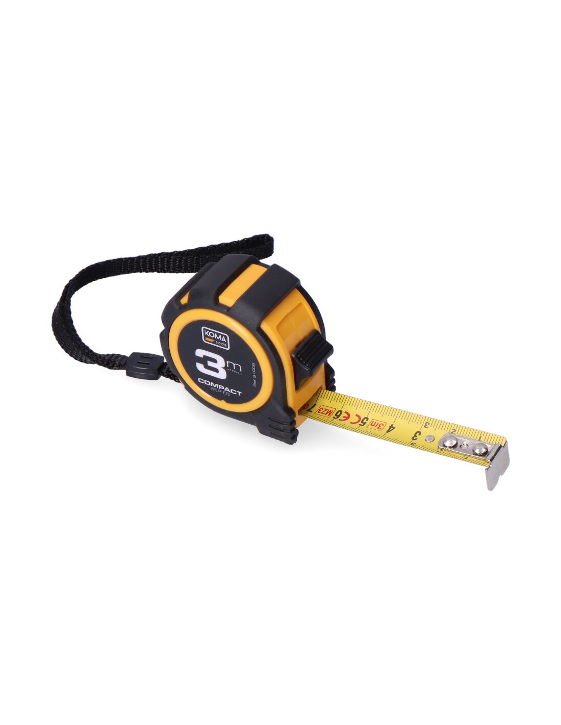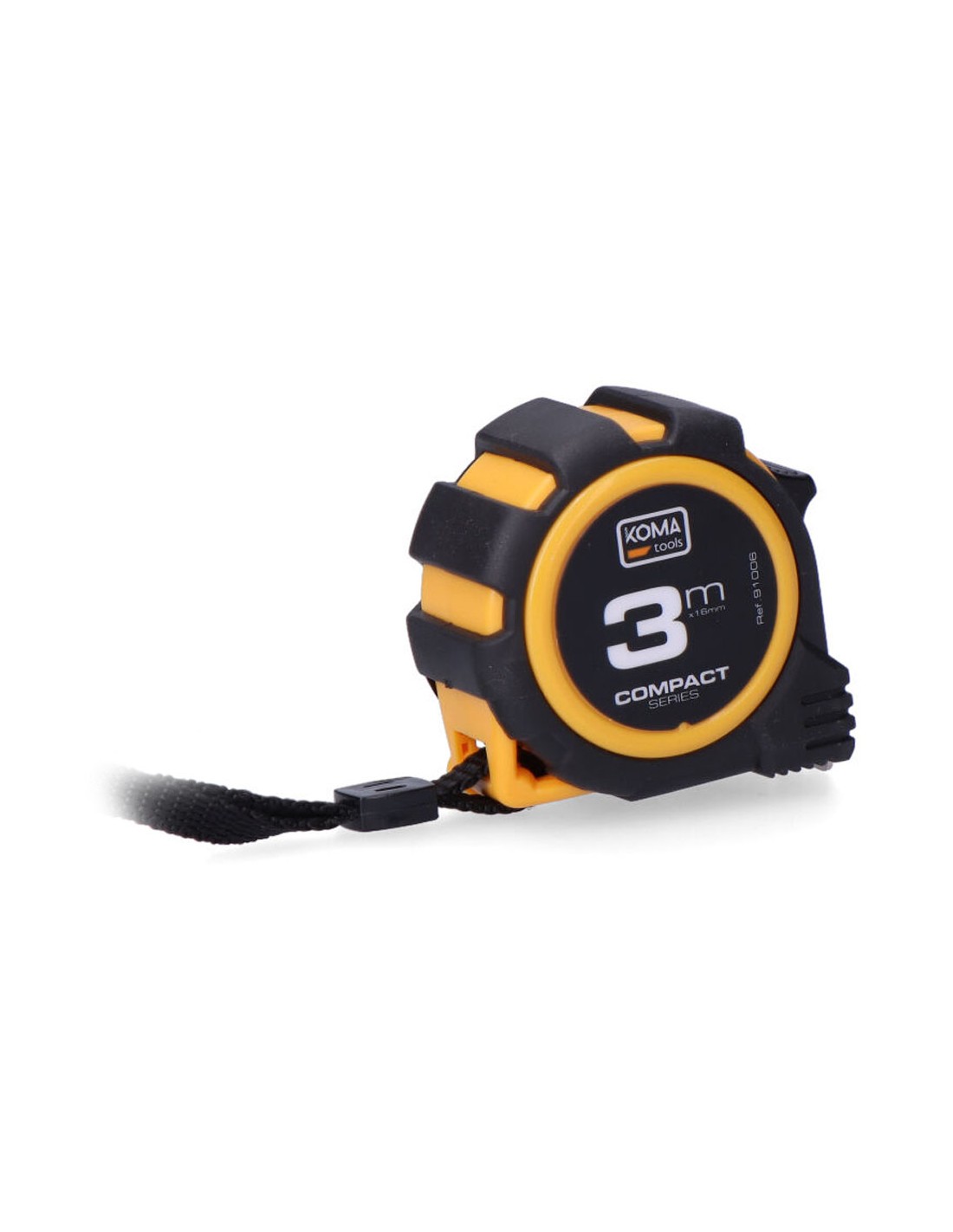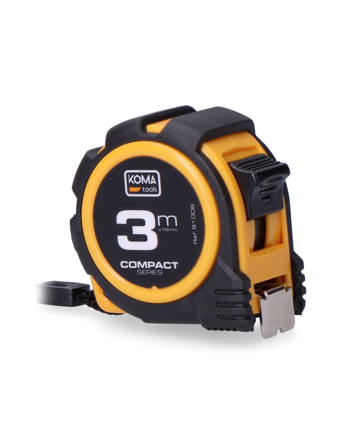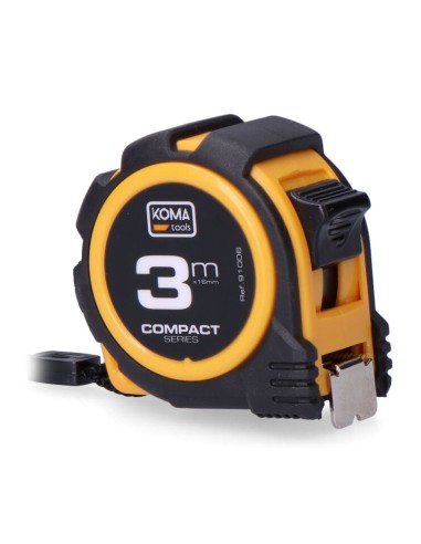Flexómetro 3m x 16mm abs compact koma tools. diseño compacto y cuerpo fabricado en abs antideslizante. una posición de bloqueo, clip para cinturón. grosor de la cinta 0,115mm, cinta numeración amarilla acabado mate.