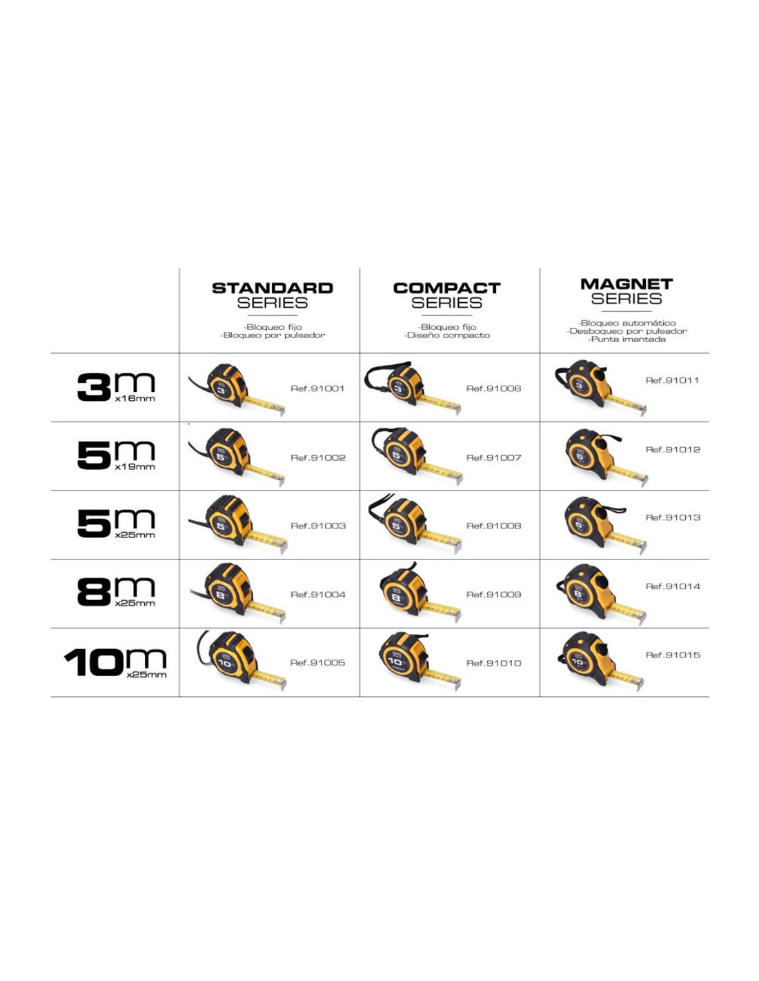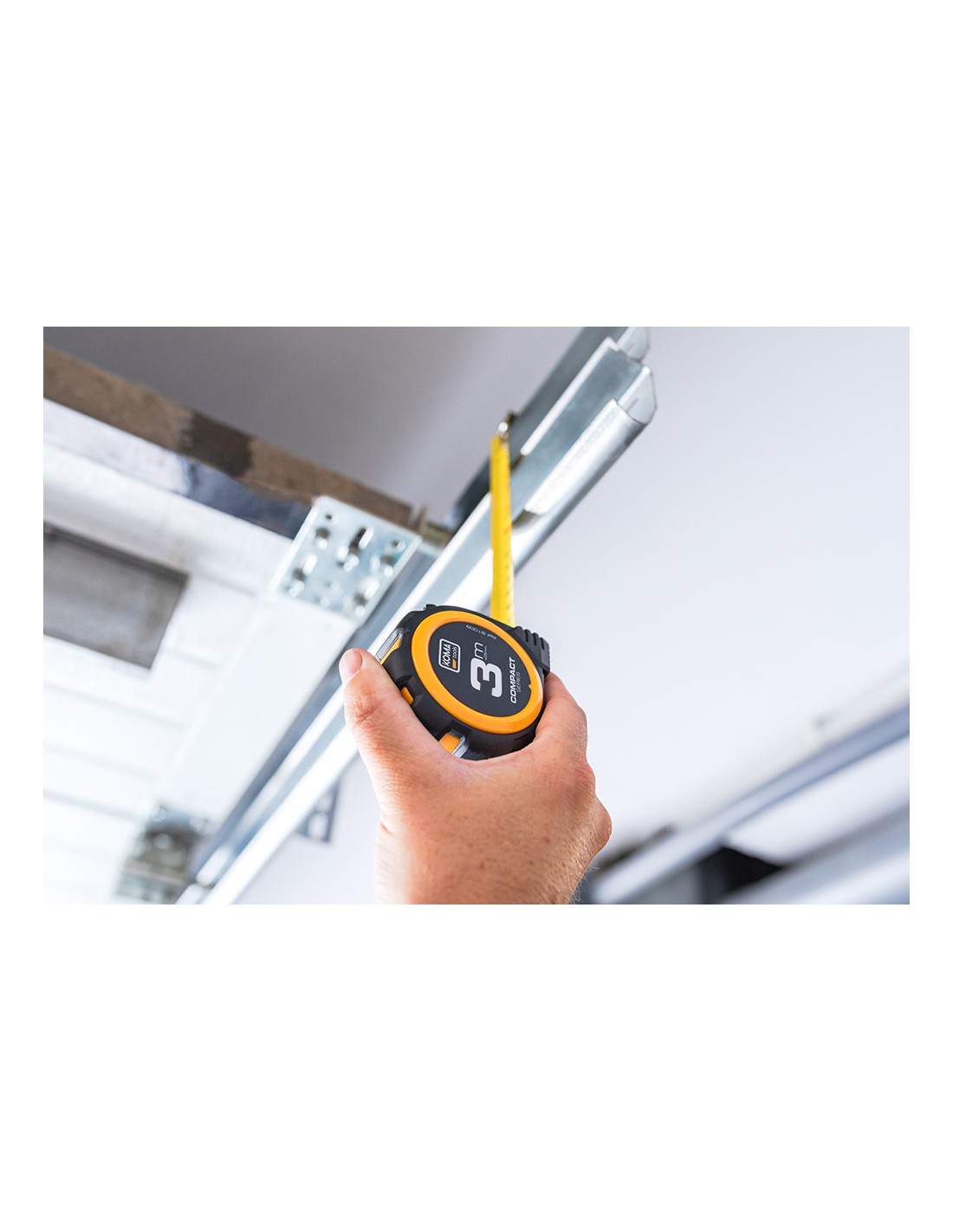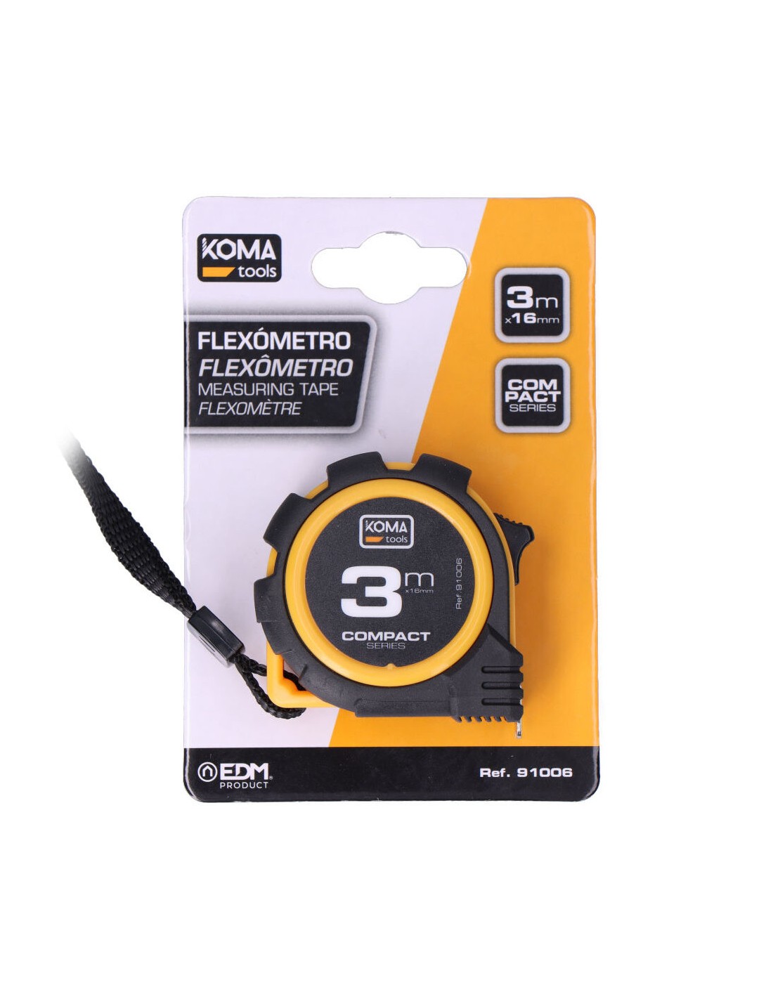 Flexómetro 3m x 16mm abs compact koma tools. diseño compacto y cuerpo fabricado en abs antideslizante. una posición de bloqueo, clip para cinturón. grosor de la cinta 0,115mm, cinta numeración amarilla acabado mate.
