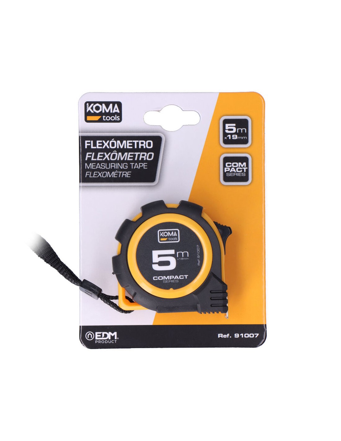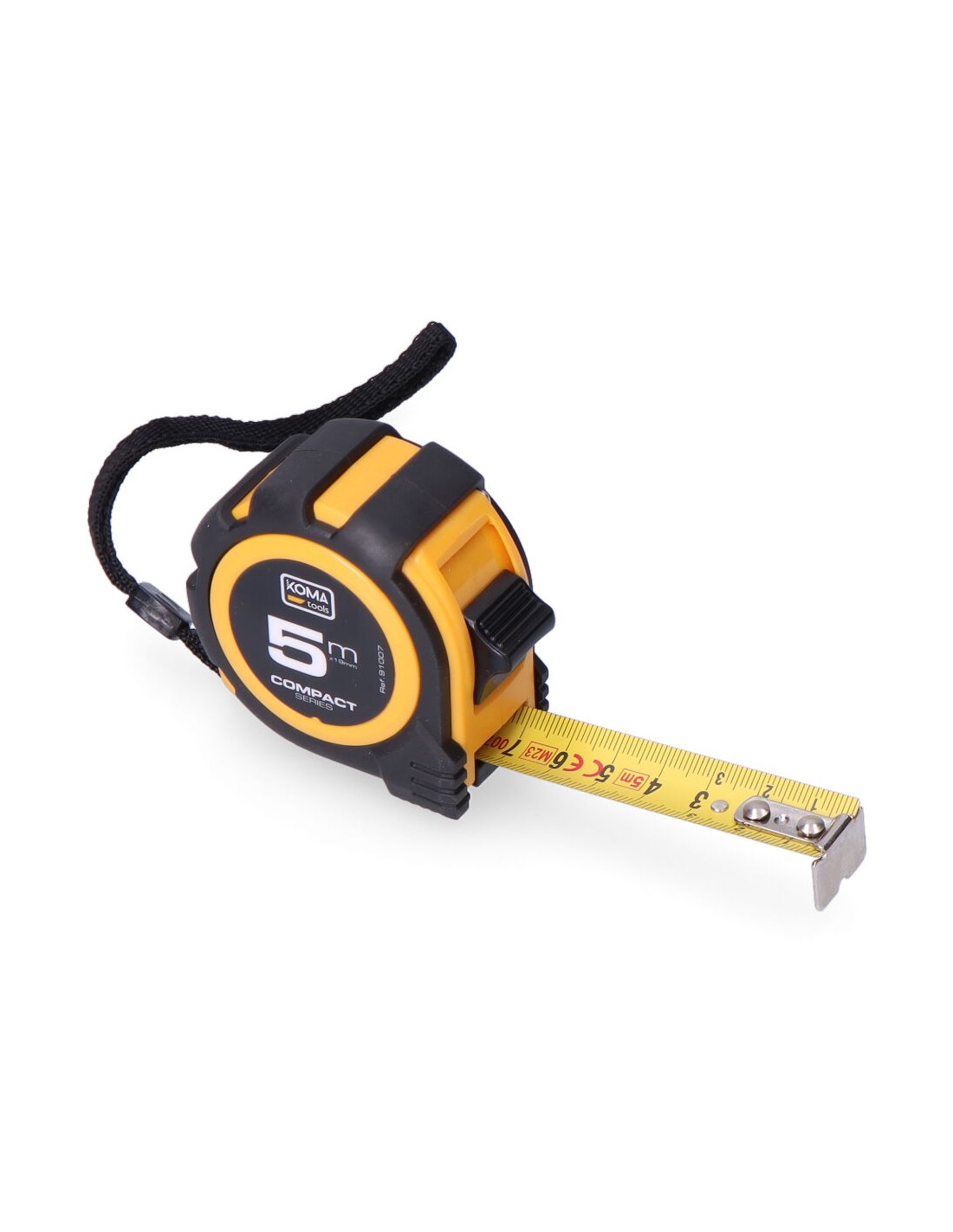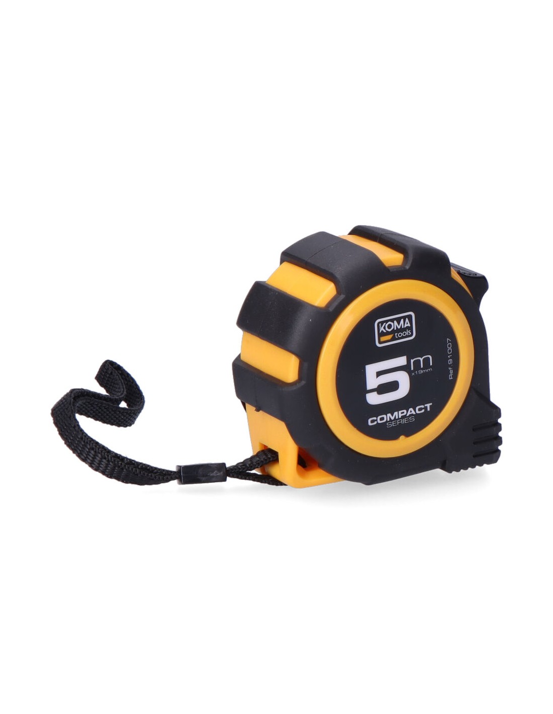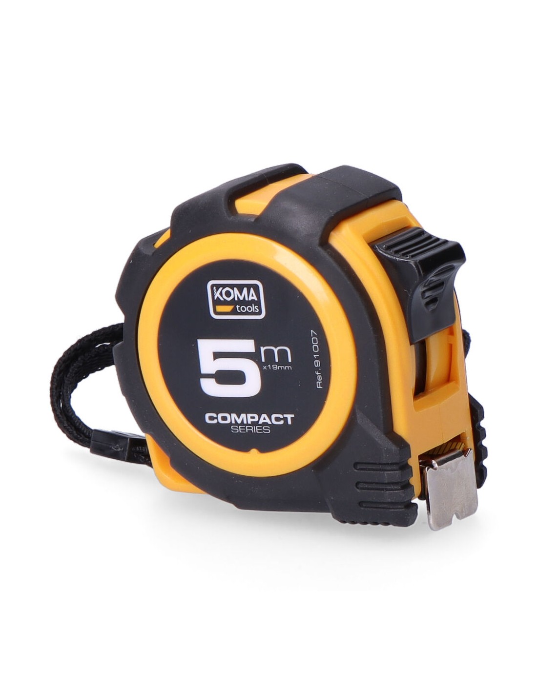 Flexómetro 5m x 19mm abs compact koma tools. diseño compacto y cuerpo fabricado en abs antideslizante. una posición de bloqueo, clip para cinturón. grosor de la cinta 0,115mm, cinta numeración amarilla acabado mate.