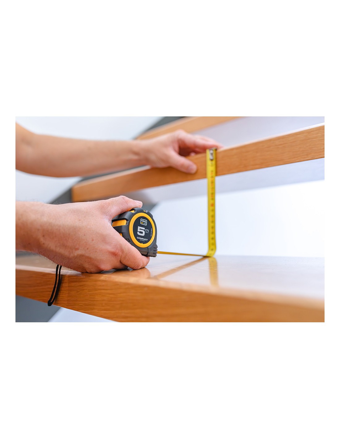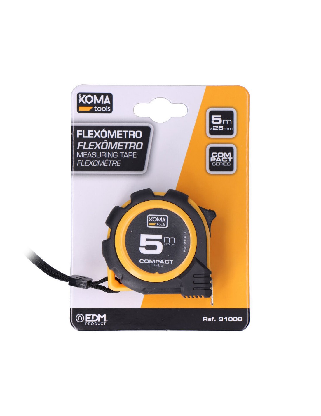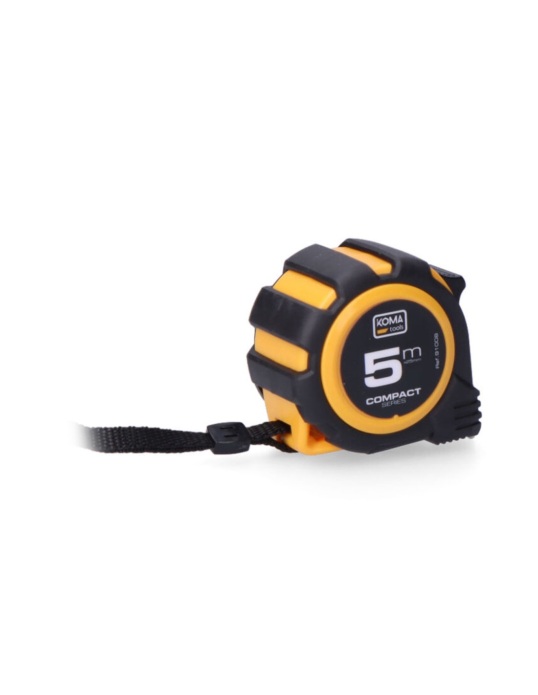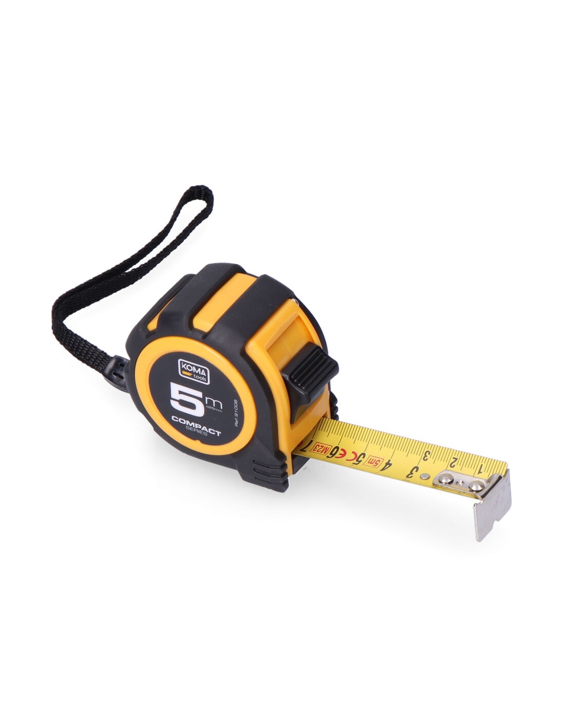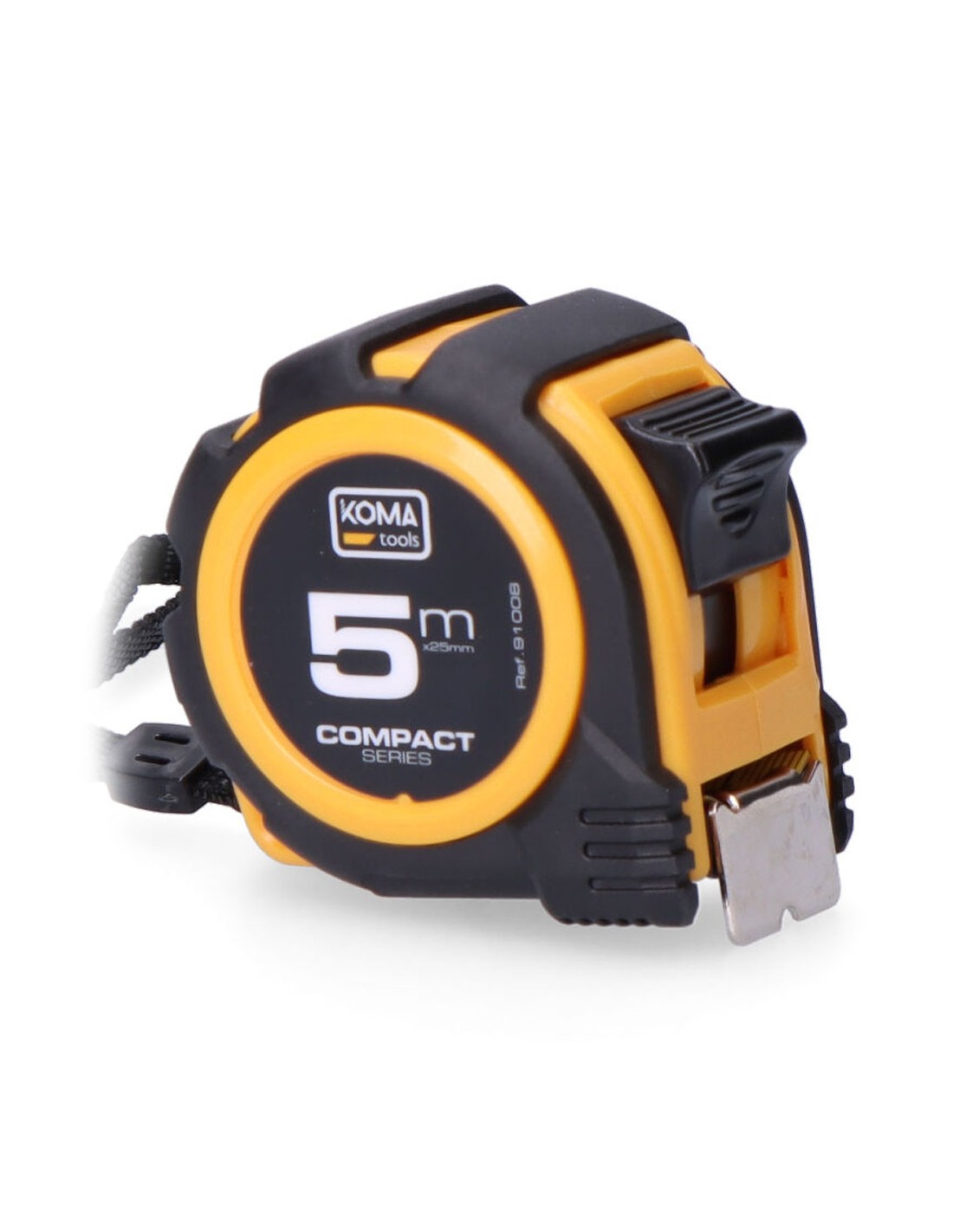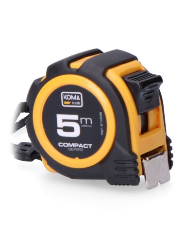 Flexómetro 5m x 25mm abs compact koma tools. diseño compacto y cuerpo fabricado en abs antideslizante. una posición de bloqueo, clip para cinturón. grosor de la cinta 0,115mm, cinta numeración amarilla acabado mate.