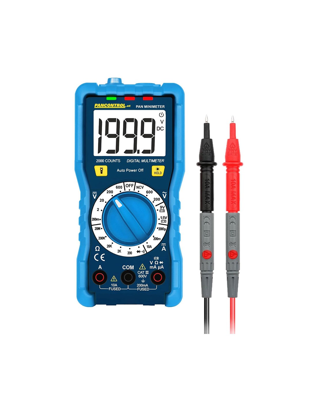 Multímetro digital cat iii 600 v pan minimeter. probador de voltaje sin contacto de 2 etapas (ncv). prueba de fase de 1 polo con alarma acústica. pantalla digital 21mm. pantalla iluminada. linterna led. comprobación de diodos. desconexión automática.
