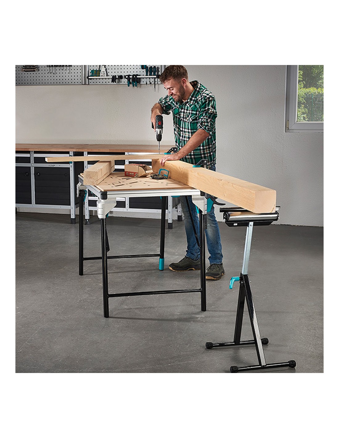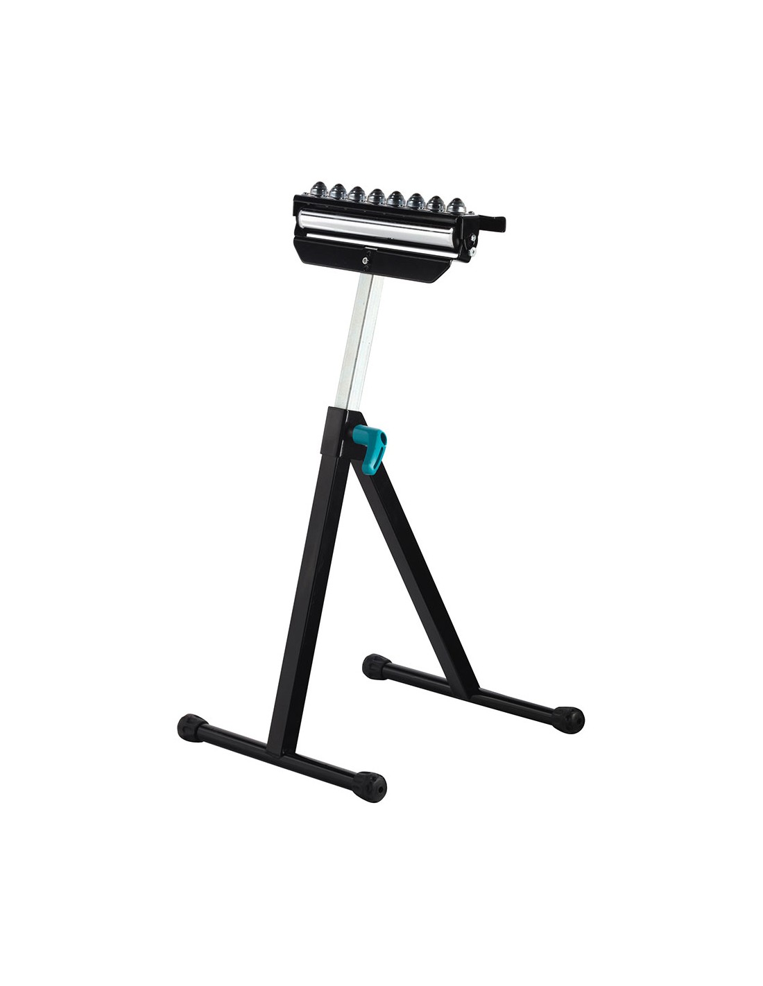 Caballete multifuncional con soporte y rodillo, es versátil para apoyar y desplazar tablas y placas largas. su bastidor ajustable en altura se adapta a bancos de máquinas convencionales. cuenta con un soporte fijo de 300 mm de ancho que prolonga la superficie de apoyo o sostiene piezas largas. puedes girar el soporte para cambiar la superficie de apoyo y utilizar los soportes de bola para un desplazamiento cómodo de la pieza en todas las direcciones. con un giro adicional, cambia al soporte de rodillo para facilitar el guiado longitudinal. es plegable para un almacenamiento compacto